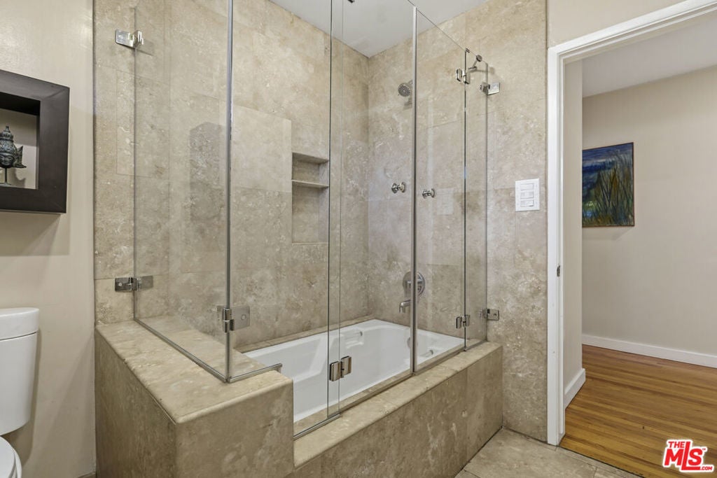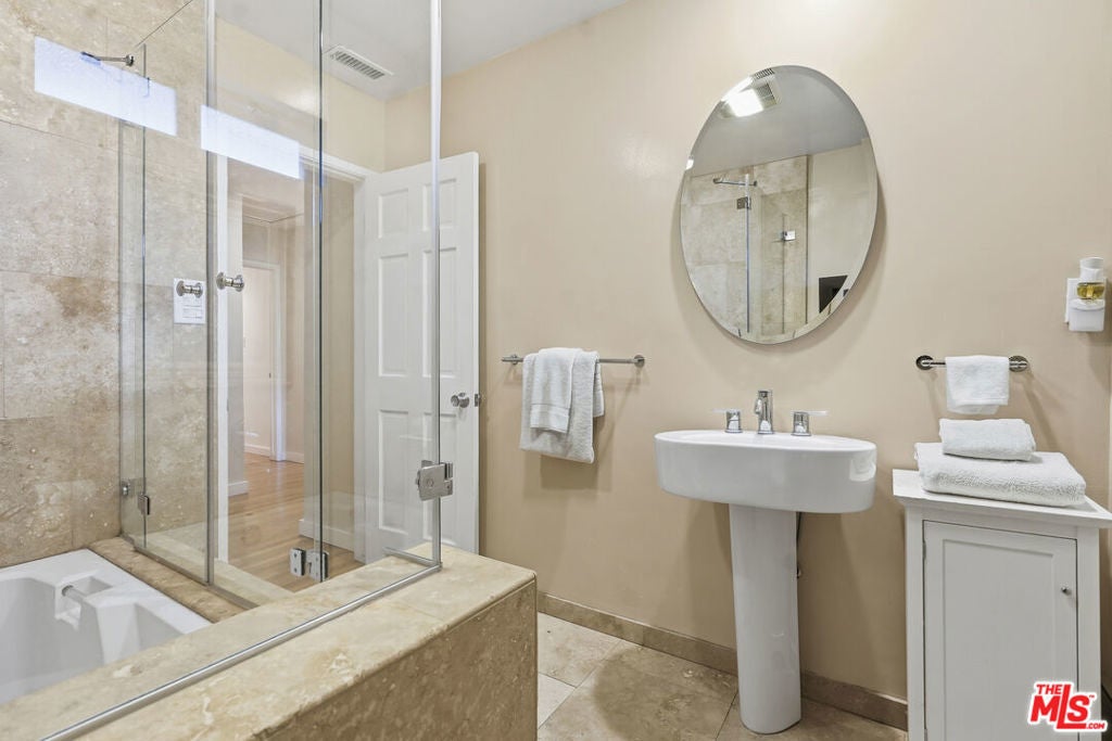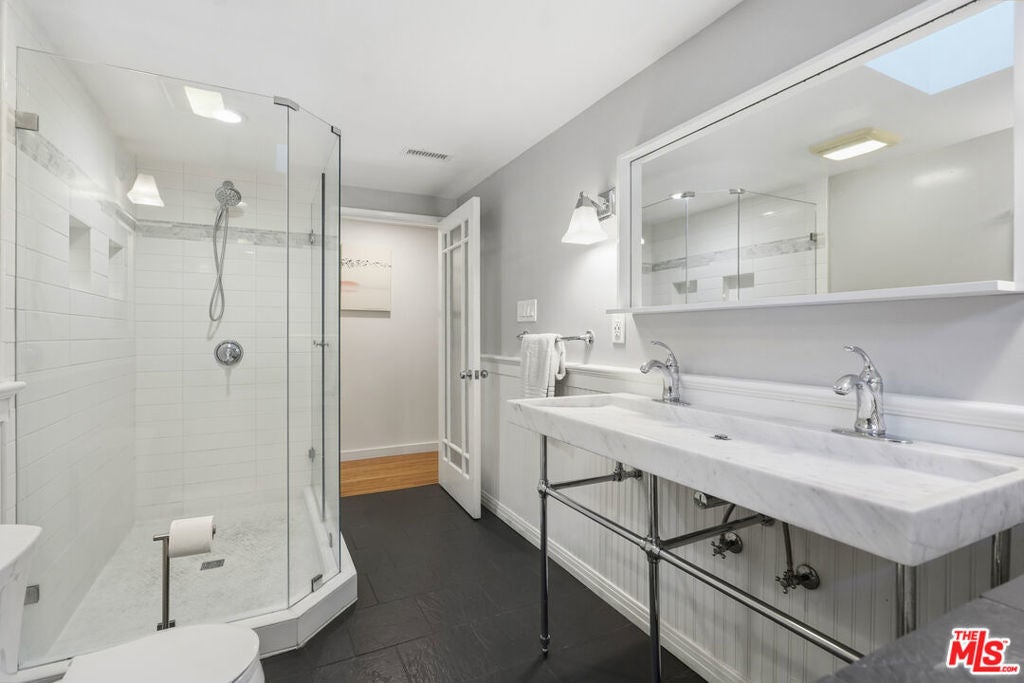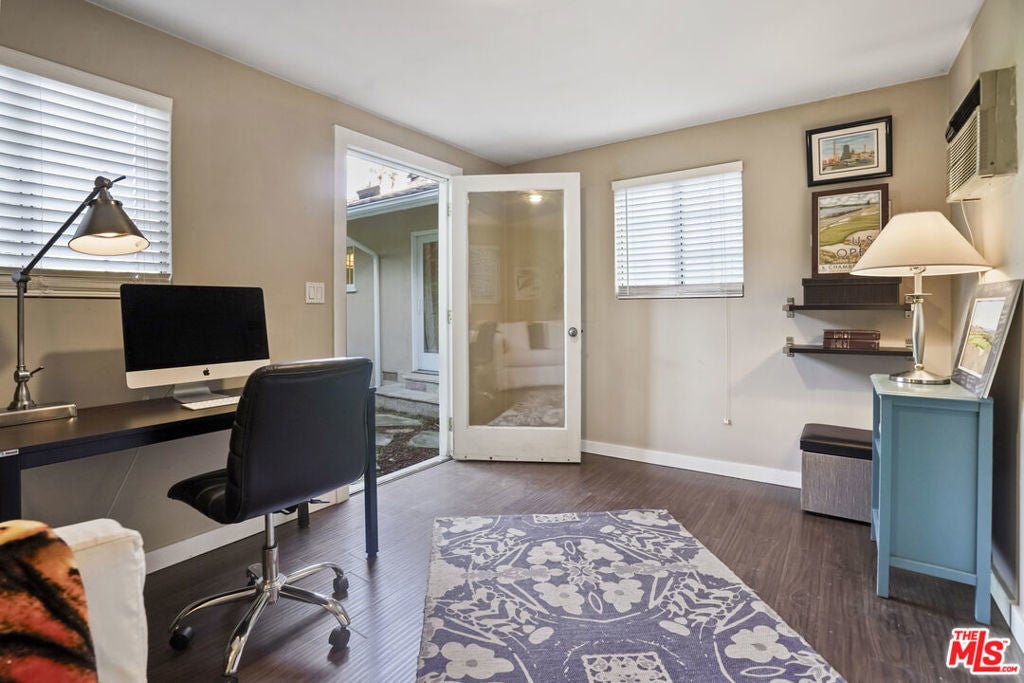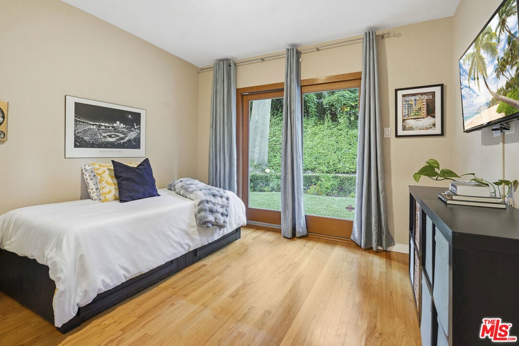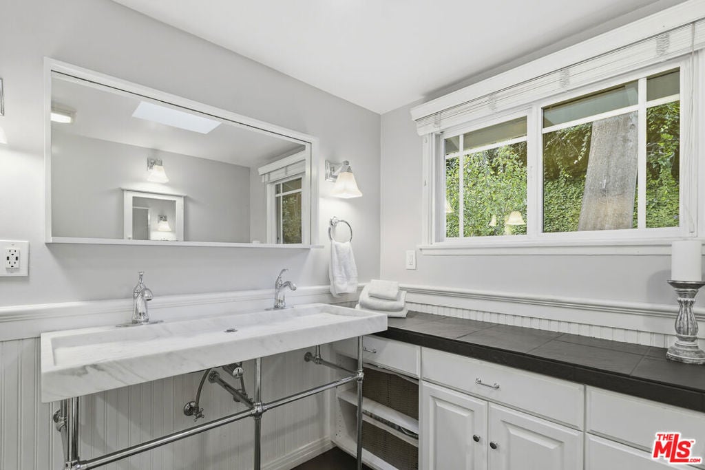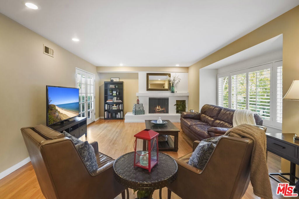 Built in 1954, this reimagined California ranch offers a clean, single-level layout with strong indoor-outdoor flow. The main living spaces sit at the center of the home, where natural light fills the living room and highlights hardwood floors, a clean fireplace surround, and built-in cabinetry. French doors open directly to the backyard, while a wide front window provides consistent daylight throughout the day. The living room flows seamlessly into the fully remodeled kitchen (2025). A skylit island anchors the space and creates a natural gathering point, complemented by generous cabinetry, quartz countertops, open shelving, and new stainless steel appliances. The kitchen opens to a spacious dining area and dry bar, with glass doors framing views of the patio and hillside beyond, enhancing everyday living and entertaining. The bedroom wing is set apart from the main living areas, providing privacy and a quieter atmosphere. The primary suite includes its own bathroom and direct access to the yard. Two additional bedrooms allow the home to function as a true three-bedroom layout, offering flexibility for guests, work, or changing needs. Both bathrooms have been updated with clean, thoughtful finishes. One features a skylit walk-in shower, while the other includes a travertine-tiled tub with a glass enclosure. Outdoor spaces are private and inviting, shaped by mature trees, layered landscaping, and the natural rise of the hillside. A pergola-covered patio with a spa tub extends the dining area outdoors, while a curved built-in bench surrounds the fire pit for evening gatherings. The fenced lawn provides space to relax, play, or garden while maintaining a cohesive setting. A detached office sits slightly apart from the main house, offering a quiet, independent space well suited for work or creative use. Recent interior updates allow the home's mid-century architecture and layout to shine. Located in a desirable Sherman Oaks pocket near the Village, with easy access to the 405 and 101 freeways.