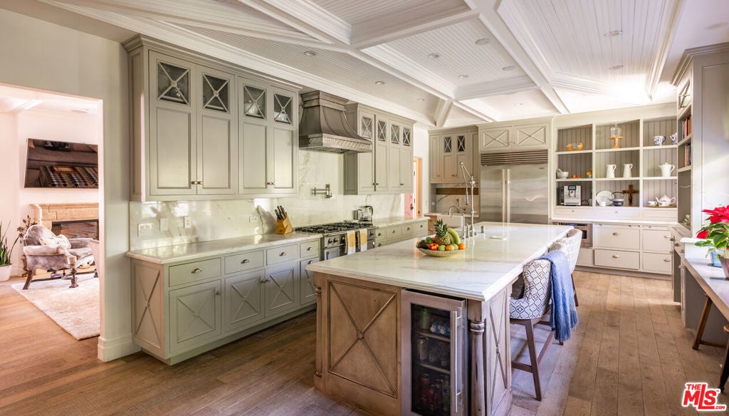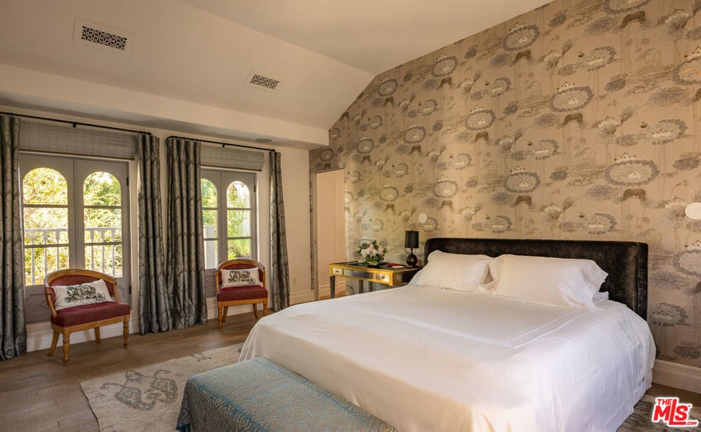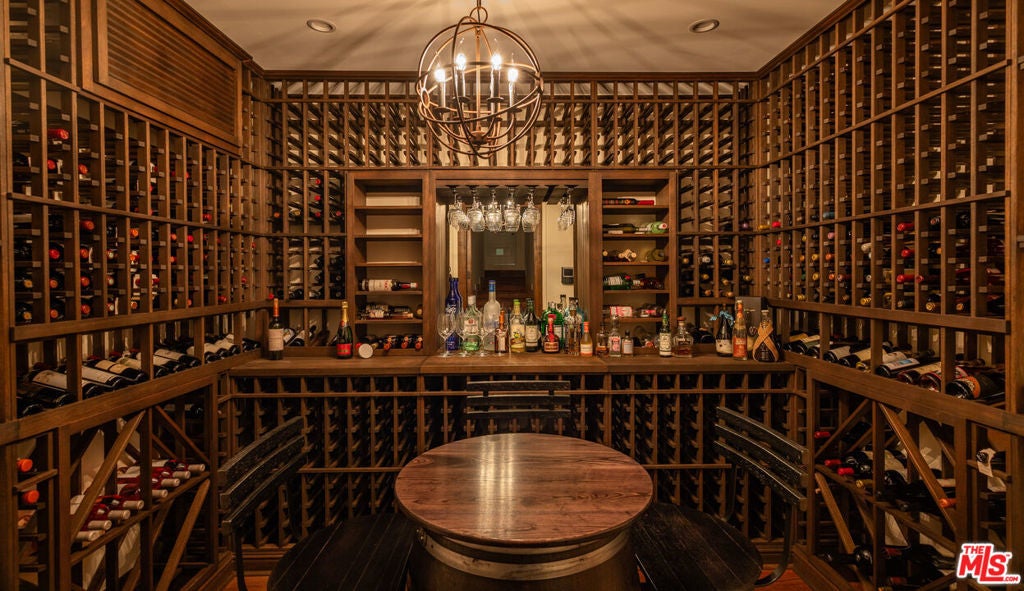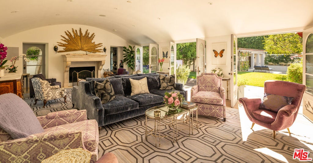 Steeped in Hollywood history and reimagined for contemporary living, this extraordinary 1928 estate was originally built by renowned Spanish Revival and Monterey Colonial architect Roy Seldon Price for Charlie Chaplin's second wife, with interiors crafted by legendary set designer Harold Grieve. Today, the residence stands fully remodeled and thoughtfully upgraded, preserving its storied past while embracing the finest modern amenities. Tall, mature hedges encircle the property, ensuring complete privacy the moment you enter through the double-gated drive. A long motor court leads to the main entry, framed by a grassy lawn, fruit trees, and a charming turtle pond beside a dedicated dog run.Inside, the home unfolds through a striking foyer appointed with Moroccan tiles, grand archways, Spanish lighting, and bespoke French doors. This central hall opens to an elegant sequence of entertaining rooms, all bathed in natural light and designed with effortless indoor-outdoor flow. The formal living room features a dramatic stone fireplace and extends to both the expansive backyard and the front garden courtyard. The room also features a built-in bar and lounge area, along with a library/office with garden access. A vintage-style powder room and vanity complete the formal wing. At the heart of the home lies the chef's kitchen, featuring Viking appliances, a walk-in pantry, generous central island, and breakfast bar. Set between the formal dining room and inviting family room showcasing coffered ceilings, bespoke wall treatments, stone fireplace, and a built-in banquette dining area - ideal for gatherings of any scale. Below, an incredible wine cellar and multiple storage rooms offer utility and temperature-controlled preservation.Upstairs, five bedrooms occupy the main level, three of which open to a wraparound balcony overlooking the gardens. The primary suite is a sanctuary unto itself, featuring a stone fireplace in the private sitting room, dual bathrooms with a soaking tub, generous walk-in closet, and private balcony with direct access to the pool terrace below. The family room opens through French doors to a covered terrace with views of the pool, spa, cold plunge, and a full outdoor kitchen and dining pavilion beneath iconic Beverly Hills palms. The backyard also boasts a spacious lawn with a detached one bedroom/bathroom pool house. A completely separate wing is accessed through the gated side driveway and two-car garage - perfect for guests or staff. This private suite includes a secondary office with its own bathroom, a fully outfitted mirrored gym, a dedicated laundry area, and two bedrooms with a shared bath and direct access to the backyard. An additional large laundry room sits adjacent for convenience.A rare, meticulously maintained estate in the Beverly Hills Flats - steps from the area's premier shopping, dining, and nightlife.