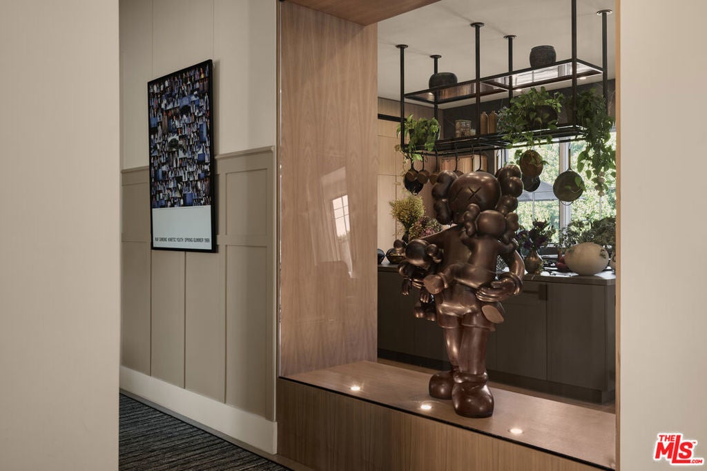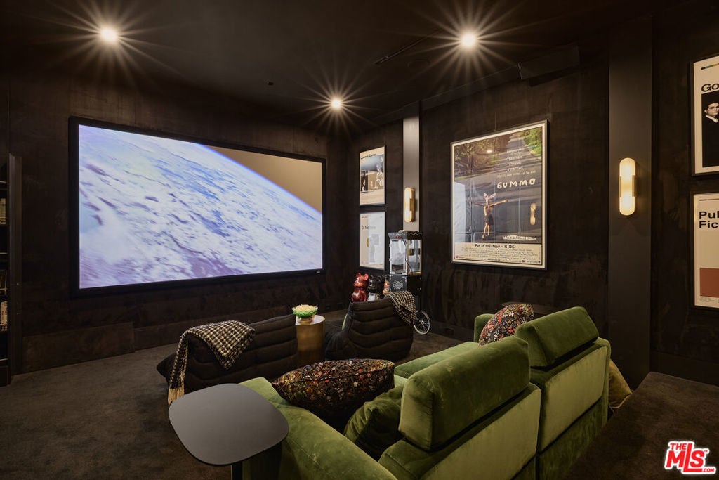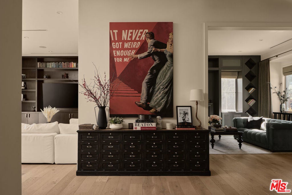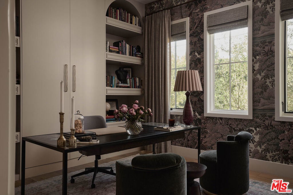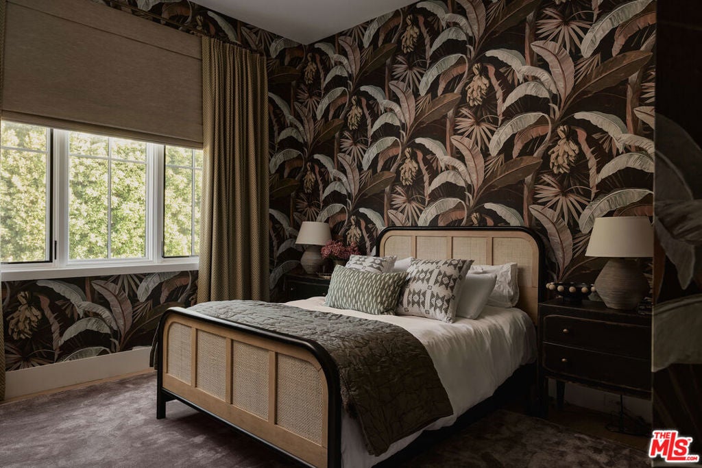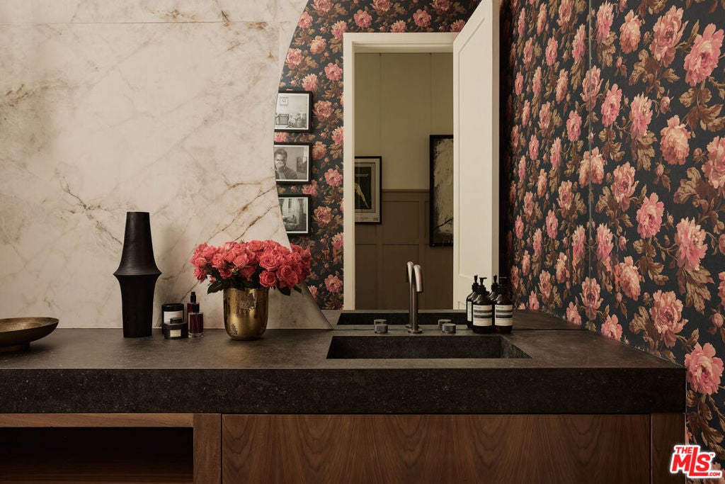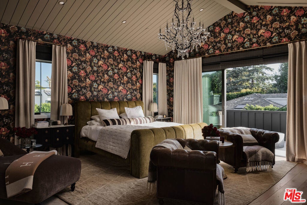 Tucked behind gates in the renowned Amestoy Estates where opportunities to own are rare, this extraordinary 6-bedroom, 7-bath residence offers approximately 7,200 square feet of refined elegance and character. Designed in its entirety by acclaimed Celebrity designer Kishani Perera, every detail was thoughtfully curated. The home blends sophistication with a rock-and-roll edge, featuring a hidden movie theater accessed through a bookshelf and multiple areas across the property that feel like a private resort. Custom reclaimed wood doors, warm built-ins, hand-selected wallpapers, cabinetry, lighting, and trim create a rich, layered interior, while vintage Parisian chandeliers and stained-glass windows add timeless charm. With parking for up to 13 cars, exceptional privacy, and a setting that truly lives like an estate, this is a rare and unforgettable retreat. Bold, distinctive, and completely one of a kind.