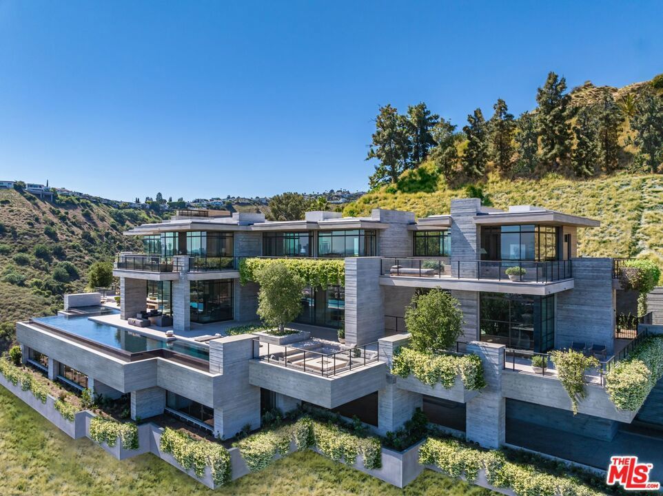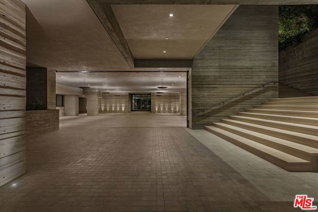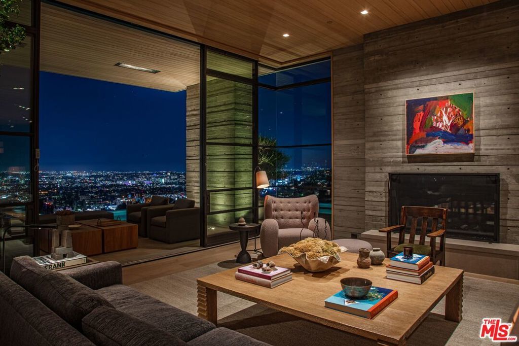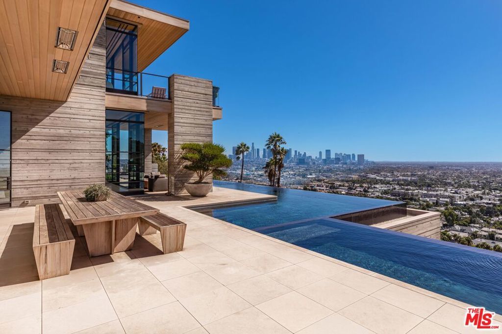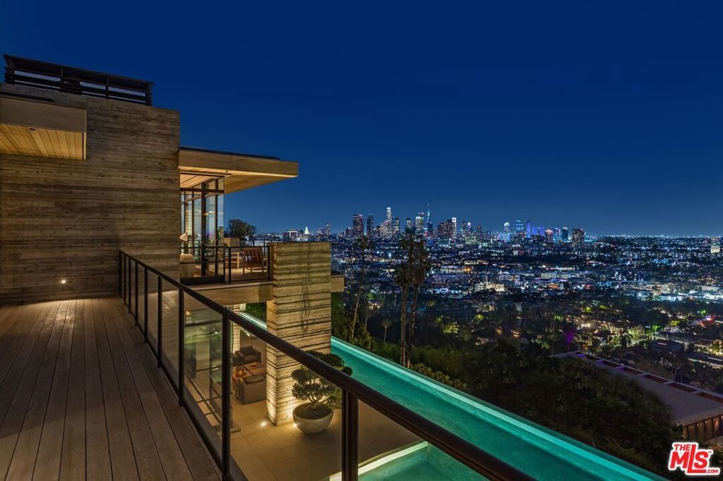 The Hollywood Hills House designed by Scott Mitchell Studio is a monumental and versatile modern villa rising out of the Hollywood Hills. The layered and terraced house - designed for living and entertaining - embraces views that span L.A.'s cityscape from east to west and out to the Pacific Ocean. This property is set on Los Angeles's most iconic promontory, formerly owned by Howard Hughes, that extends over one acre with no neighbors on either side and 270 views of the entire city. Set at the 50-yard line of legendary hot spots Chateau Marmont, Tower Bar, and the Hollywood Bowl, the energy of the city can be seen and felt from the estate's peaceful privacy. Additionally, the property borders state land so no building can be constructed behind it, and it has private access to hiking in the famous Runyon Canyon. The form of the house follows a rigorous commitment to rich, organic materials and light. Grand outdoor decks provide seamless indoor and outdoor living. With expansive volumes over three floors, the tranquil and rooted hillside haven exudes a sense of balance, repose and a seamless connection to the natural landscape. A secluded driveway inclines to an impressive, cobbled motor court that can accommodate 12 or more cars and is nestled under the house with far-reaching views across the city. From there the villa's grand and wide staircase begins, following the form of the building, passing a large-scale, vertical water feature to the landscaped north terrace and walkway, where native plantings and open fires frame the principal steel window and door entry system. On entering, to the east is a luxurious study and to the west, an open living room with fireplace and views across the city that flows into the dining room and on to the kitchen and family room, where floor to ceiling glass sliding doors open seamlessly connecting indoor and outdoor and framing wide urban vistas. On the exterior, wire-brushed narrow Itauba deck boards and an elegant dark stone clad infinity pool and hot tub are flanked by a sunken fire pit and seating area. A stand-alone pool bar and lounge is connected by a covered breezeway adjacent to an outdoor seating area. Walkways and terraces continue around the house incorporating native oaks and under-storied plantings that are composed with elements of fire and water. On the upper level, the primary bedroom wing comprises not only the primary bedroom but separate bathrooms and dressing rooms, and a study that can be isolated from the rest of the suite by a discreet pocket door system. On the lower level is a recreational zone with state-of-the-art screening room, billiards room with lounge area, and a bar. These program elements are organized around a gracious distribution foyer which doubles as a secondary point of entry to the house and leads to the motor court, which can be converted into a conditioned, modern ballroom. The house was built over a 10-year period, and new codes have been created since its construction, preventing a home of this type ever being built again in the Hollywood Hills. The house is constructed with $30 million of solid poured-in-place board-formed concrete with three feet thick concrete walls, and over 100 caissons that go 100 feet deep. The hard cost of the construction is $3,500 a square foot not including the land. The project engaged JRC Group, Inc., arguably the best builder in the city. The house includes a multi-million-dollar Jada steel door package, custom millwork, and audio/visual.