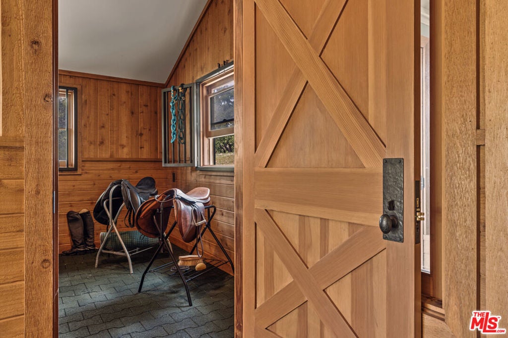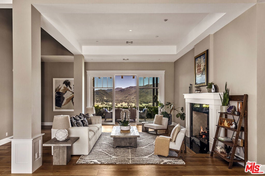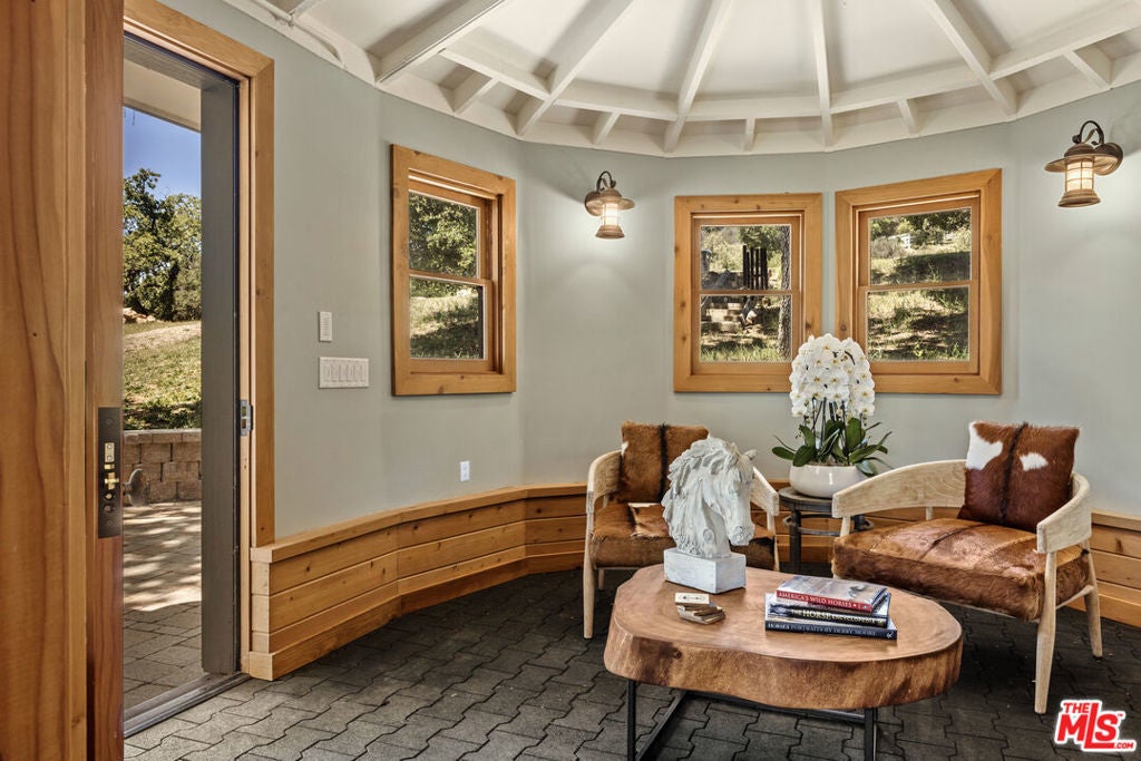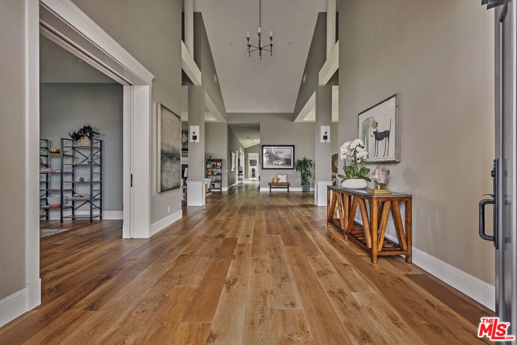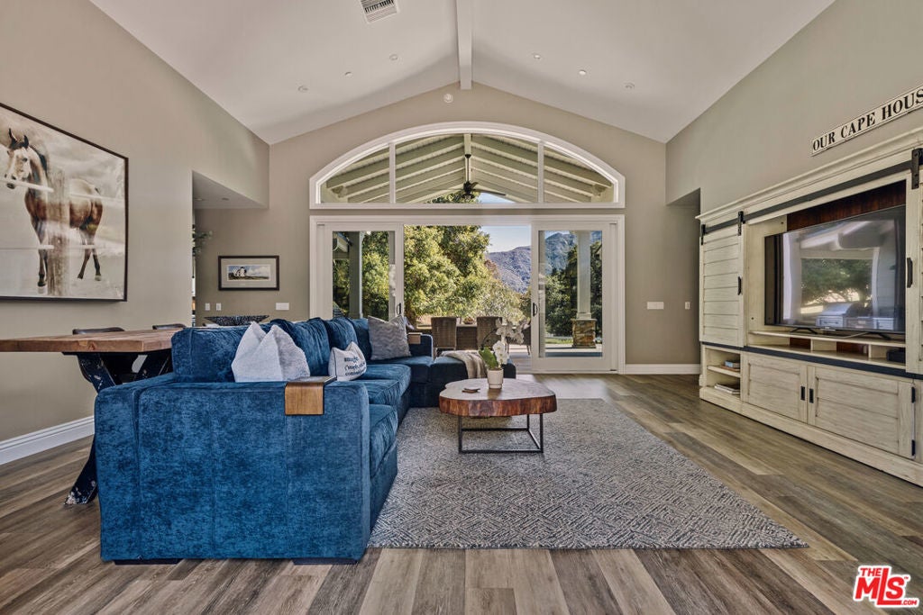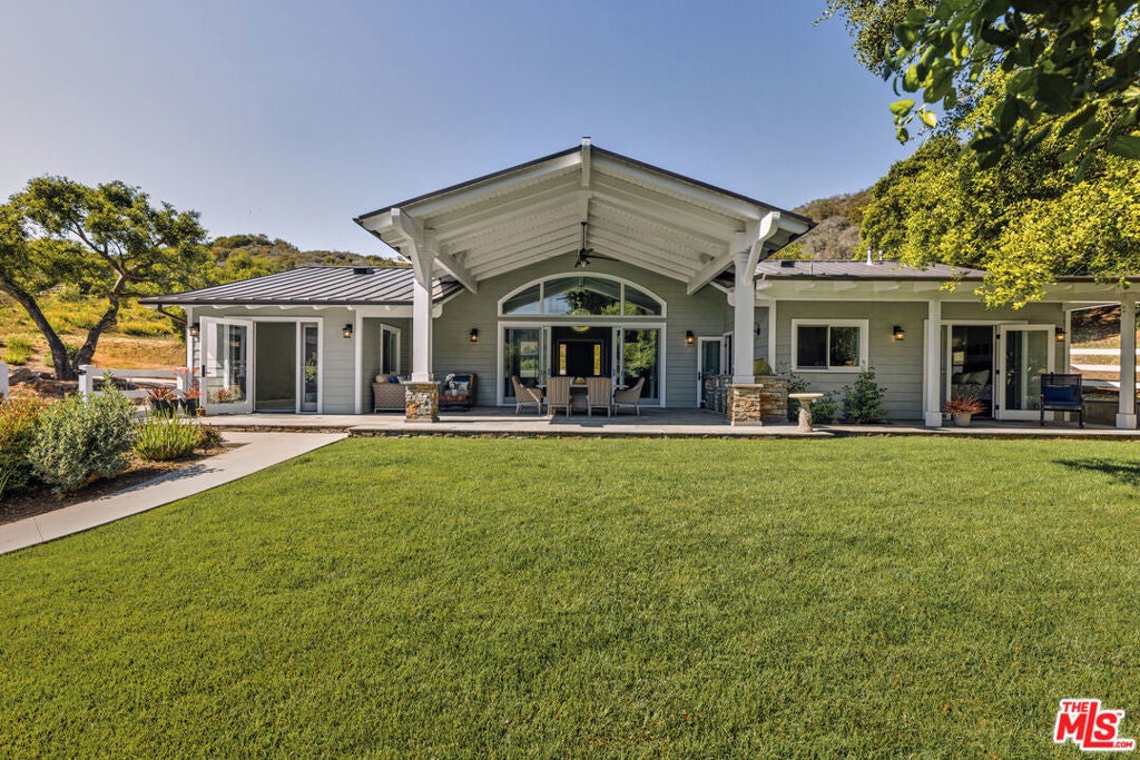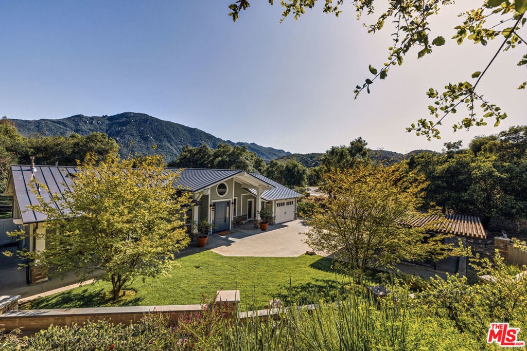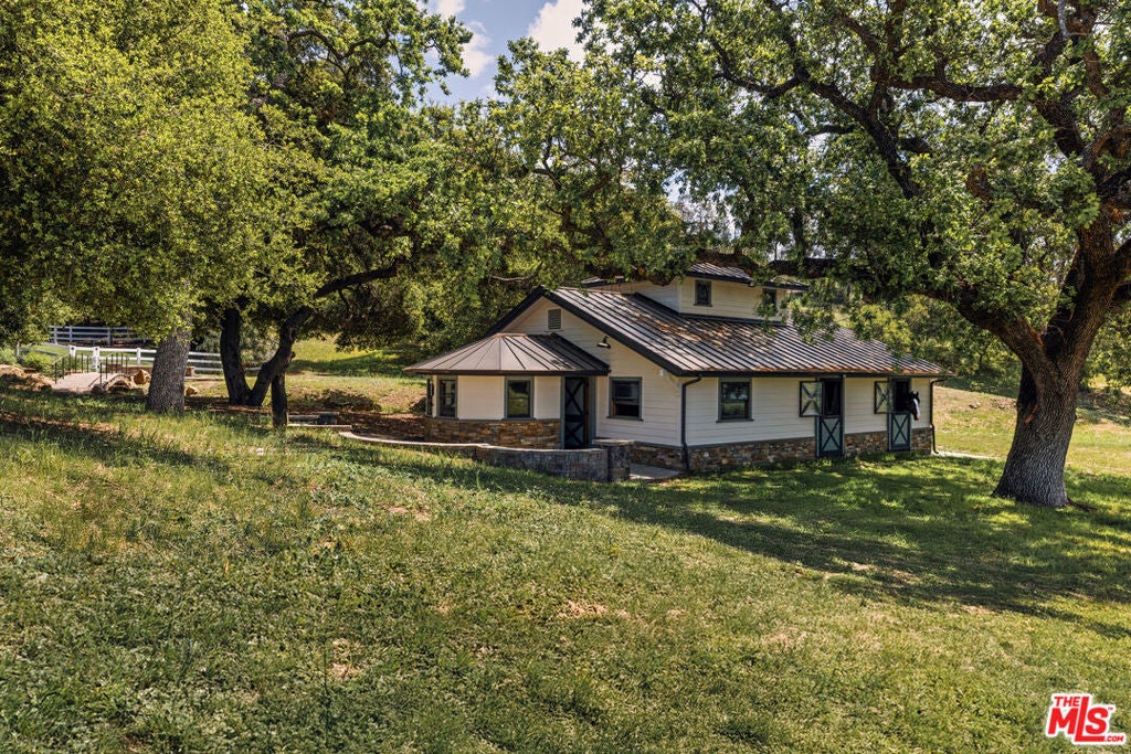 1697 Potrero Road and its breath-taking views sits behind twin, dove-white, four-rail fencing. Beyond its gated entrance lies a private lane that meanders its way uphill. Bordered by beds of wild flowers, clusters of lavender, pockets of iris and bursts of crimson bottlebrush, this is a journey that celebrates flora and fauna. At its summit, the lane opens onto a dramatic courtyard, with breath-taking, sweeping views. One of the newest homes in prestigious Hidden Valley, this is a grand and unique hybrid of traditional Cape Cod architecture and contemporary Californian lifestyle. The path to the front door is flanked by a car collector's garage-cum-gallery and a vista-framing car port. With ceilings that reach 29ft, and a view upon entry from one end to the other, the scale of this house is magnificent. Pass the owner's study, and enter the open plan great room, finding the dining area to the right and living room to the left. With pillared, vaulted ceilings, an abundance of natural light, the coziness of a roaring fire, as well as retracting glass doors to an external dining area, this is a home that offers indoor-outdoor living without constraint, and that can be formal or familial, and everything in between. The family room features a chef's kitchen, top-of-the-range appliances, peninsula high-top seating, lounge area, fireplace, under those same soaring ceilings, and it (and the games room) boasts pocket glass doors that stand 10ft high. These retracting walls of glass offer phenomenal views over the valley and Santa Monica mountains ahead, and provide direct access to the vast outdoor entertaining areas and gardens. This covered patio features a full working kitchen, barbecue, wet bar, island, and fire pit. Beyond the family room is a games and entertaining room, with multiple televisions, arcade games, ample space for ping-pong or pool, also offering unparalleled views of sunsets, rolling hills, and the gardens, mountain ranges and estates below. The bright and spacious primary suite offers equally primary views, a lounge and bar area, luxurious spa-like bathroom, gym, walk-in closet, and its own laundry. With a private terrace off the main bedroom, perfect for sunrise breakfasts, this is a suite to behold. The two story, west wing features five further bedrooms, four en-suite, two lounge areas, a kitchenette, terrace, and direct access to the rear garden and volleyball/badminton green. The main house features a salon, laundry, and walk-in pantry, as well as a guest's powder room. The landscaped gardens are as adept at offering a place to relax and admire the views, as they are at hosting a game of croquet, boules, or even for some decompressing yoga overlooking the neighboring vineyard. En route to the guest house, sits the repurposed bull-pen. This charming, octagonal structure, with its own distinct vantage point and abundance of natural light, is currently used as an artist's studio. The guest house has been constructed, equipped, and decorated to the same exacting standards as the main house. The house features the blue stone, architectural details, soaring ceilings, and feel of the main house, yet delights in a very different setting, nestled amongst the trees. The 1,789sq ft guest house features one main entertaining room, a galley kitchen, two en-suite bedrooms, and one further bathroom; as well as a covered, outdoor kitchen, barbecue, lounge and dining area, measuring approximately 1,000sq ft. The guest house's landscaped rear garden leads to fully rebuilt and beautifully restored stables. Offering a reception room, tack room, hay loft, and five stalls, these exquisite stables would bring a smile to the face of any equine enthusiast. This magical estate is like no other: unique in its architectural magnificence; privileged in its elevated vantage point; maximizing the use of its uninterrupted 360 degree, sweeping views; impeccable in its design, construction, and landscaping; and a rarity being such a new home.