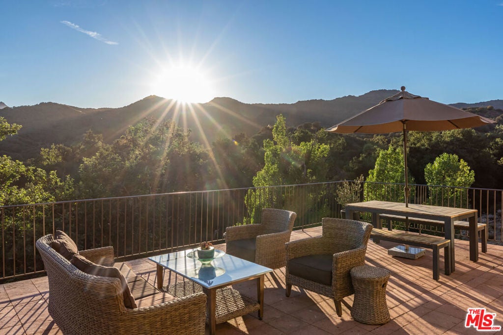 Tucked into the heart of the Santa Monica Mountains, this enchanting Mediterranean estate is a rare sanctuary where luxury and nature exist in perfect harmony. Set on 2.8 private acres along an exclusive gated lane in Monte Nido, shared with only two other prestigious estates, this serene retreat is close to acres of parkland and miles of trails - yet just minutes from iconic Malibu beaches. The setting is truly magical. Sweeping panoramic mountain views glow gold at sunset, while morning clouds roll gently over the ridgelines. A seasonal creek winds through the property, framed by mature oaks, California sycamores, citrus, and plum trees. Hummingbirds flit through the gardens, hawks soar above, and fish glisten in the entry fountain, creating a peaceful connection to nature. A grand courtyard entry opens to a warm, refined interior with soaring ceilings, Murano hand-blown glass lighting, and wide-plank hand-skived white oak floors throughout. The living room flows seamlessly to a large view terrace for indoor-outdoor living, while the elegant dining room features sculptural lighting inspired by Venice's sky and sea. The light-filled kitchen overlooks the mountains and BBQ terrace and features an island, Thermador appliances, and a cozy seating area with TV. The main-level primary suite is a tranquil retreat with pool and spa views, a spa-like bath with soaking tub and separate shower, and a walk-in closet. A second bedroom or office and full bath complete the main level. Upstairs are three additional bedrooms with stunning views, two full baths, a laundry room, and extra storage. Thoughtfully upgraded with premium systems and finishes, the home is conveniently located near Calabasas shopping, the 101, and within the award-winning Las Virgenes School District, close to Viewpoint, Muse, and Pepperdine University. A peaceful mountain escape offering refined living, natural beauty, and effortless access to the coast without the pace of city life.