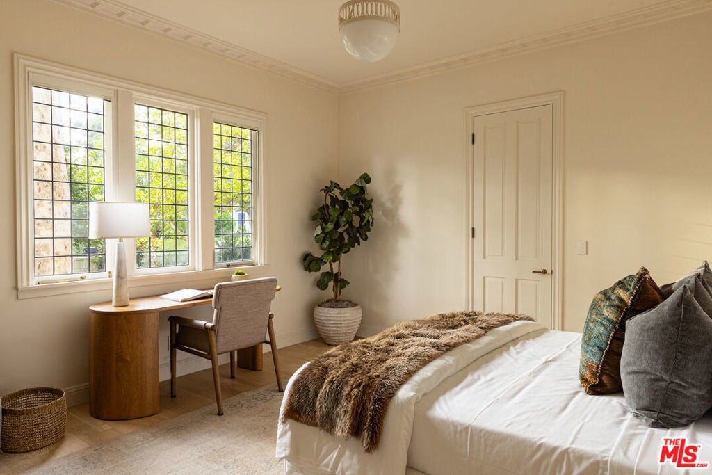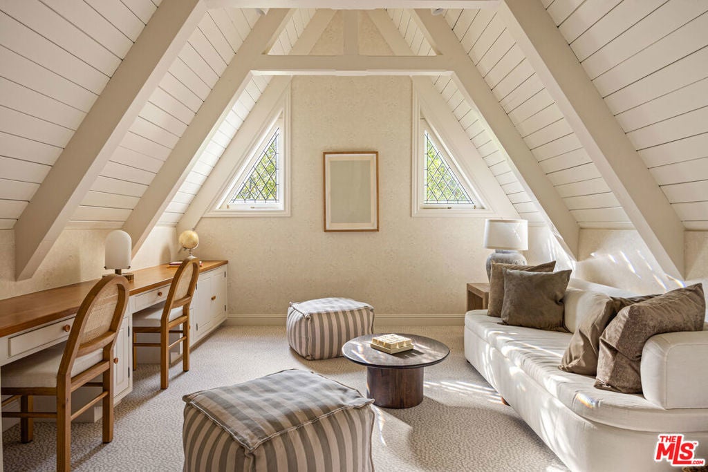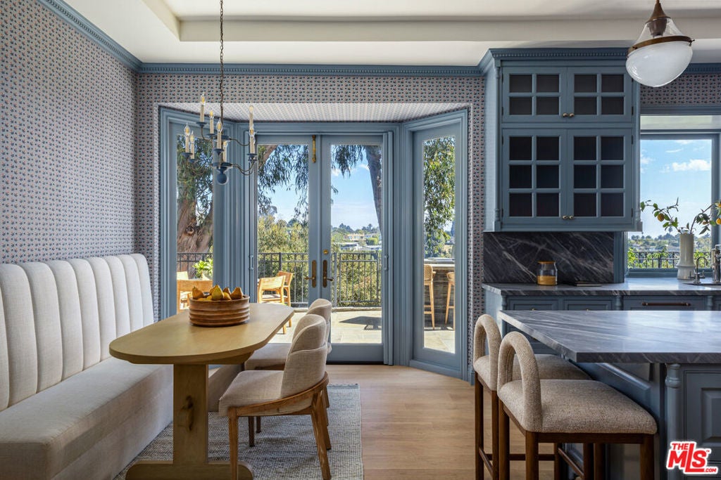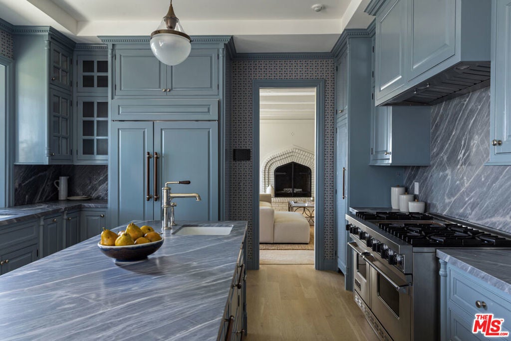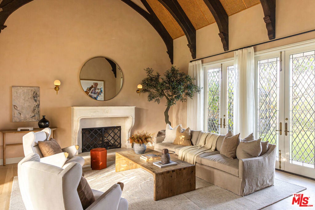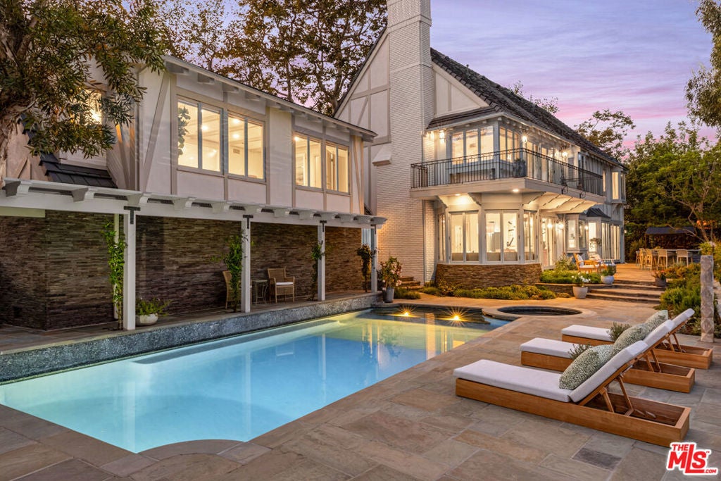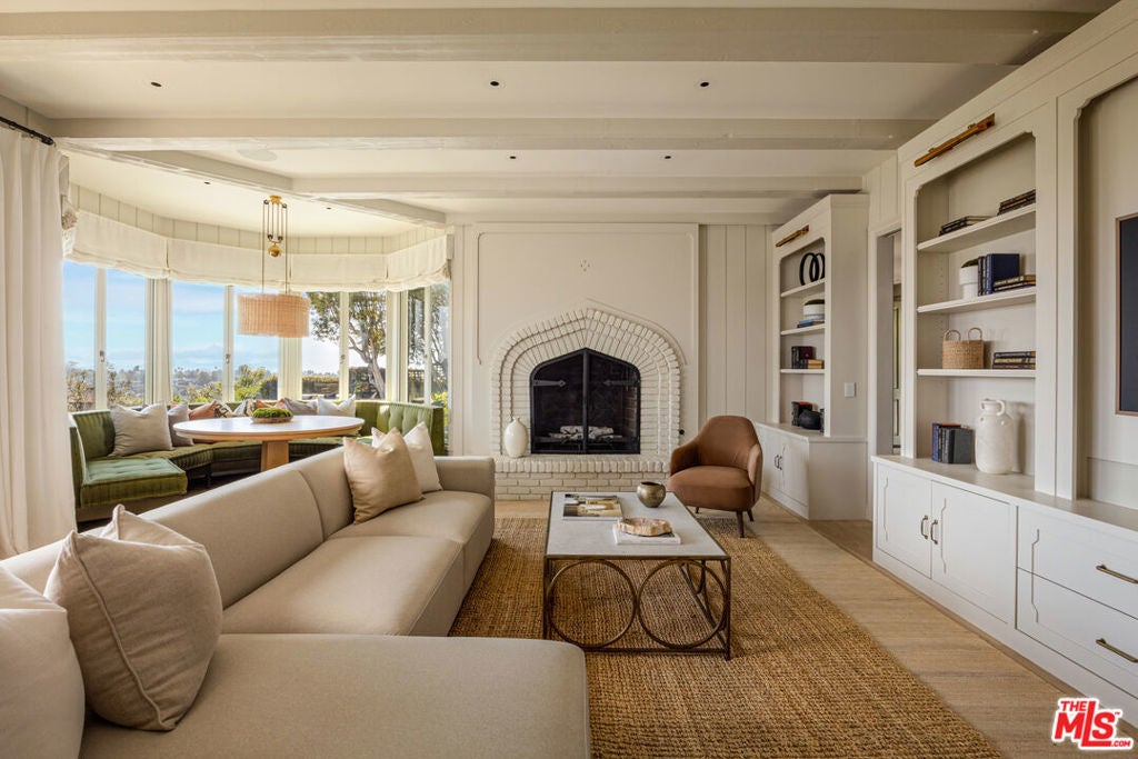 Spectacular gated English estate on coveted Amalfi Drive in the Palisades Riviera. With sweeping ocean, canyon, and country club views, this 5-bedroom, 5.5-bath residence has been reimagined to balance timeless character with modern luxury. Every detail reflects the exquisite renovation, where elegant finishes and authentic charm define the home. A garden arbor and beautiful entry lead to a dramatic two-story foyer. The living room showcases vaulted wood-beam ceilings with woven cane inlay, a limestone fireplace, and leaded glass windows opening to a private view patio. The formal dining room with French doors flows into a gourmet kitchen with a large center island, top-of-the-line appliances, and a sunlit breakfast alcove overlooking the garden. Designed for entertaining, the family room with French doors highlights panoramic views and is fit with a masonry fireplace, custom banquette, and built-in media center. A paneled den with fireplace creates an ideal retreat, while a guest suite, elegant powder room, mudroom, and laundry complete the main level. Upstairs, the primary suite features a fireplace, sitting area, dual closets, and private balcony with breathtaking views. The spa-like bath offers heated stone floors, custom millwork, a ribbed glass steam shower, and a luxurious soaking tub. Two additional en-suite bedrooms, and a playroom with vaulted ceilings complete the second story. A private guest wing with bath and walk-in closet provides flexibility. Venture outside to enjoy beautifully landscaped grounds with mature trees, bluestone patios, a built-in barbecue with entertainment bar, a garden house, and deluxe pool and spa all framed by sweeping vistas. Wide-plank floors, Savant home automation, integrated A/V, Lutron lighting, upgraded systems, and water filtration complete this exceptional home. Just moments from the beach, local shops and restaurants, top-tier schools, Rustic Canyon Park, and Brentwood Country Mart, this one-of-a-kind estate is a truly rare offering for your most discerning clients.