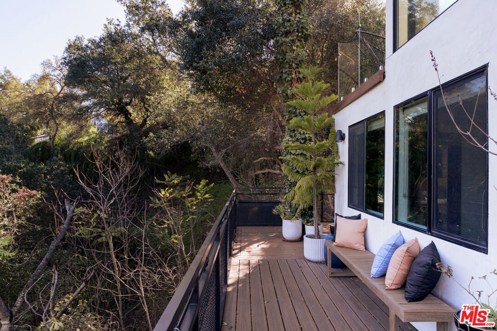Perched in the hills of Studio City on a quiet residential street, 3760 Avenida Del Sol feels miles away from the bustle of the city, all whilst being located just moments from Ventura Blvd -- the perfect mix of seclusion and access. This secure and private retreat is a 1,755-square-foot home spanning two levels, with the upper floor designed around an open living space that takes full advantage of the surrounding hillside views. Expansive glass walls bring the outdoors in, giving the home an airy feel reminiscent of a modern treehouse. The upper level features a newly remodeled kitchen equipped with high-end Viking appliances, opening to the living space and the upper balcony. Downstairs, three well-proportioned bedrooms feature direct access to the wraparound deck that surrounds the home, offering generous outdoor space with peaceful treetop views. The primary bedroom features a walk-in closet and an en suite bath, with French doors opening directly onto the deck. Conveniently located near some of Studio City's best dining and shopping, including The Sportsmen's Lodge, UOVO, Oy Bar, and Erewhon, the property is also just around the corner from Harvard-Westlake Upper School. A must see!