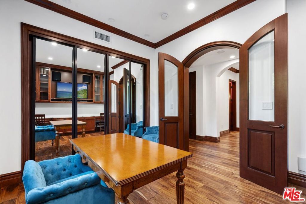 Spectacular and elegant 4,853 sq/ft home featuring 6 BR's, 5.5 BA's, a gym, a gourmet kitchen with Wolf and Sub-Zero Appliances, a generous formal dining room, large living room, and family room with Fleetwood doors opening out to a resort style private yard with a pool and heated covered patio. The yard has multiple seating areas, a fire pit, and an outdoor kitchen with BBQ. The large primary suite features a huge walk-in closet along with a gorgeous bathroom with spa tub, bidet, steam shower. Other features include a wet bar, double-sided fireplace, high ceilings, sky lights, wood and onyx floors, security cameras, 2 car attached garage, and multiple zone HVAC. LOCATED IN THE WARNER AVENUE SCHOOL DISTRICT. It is truly a remarkable home and property.