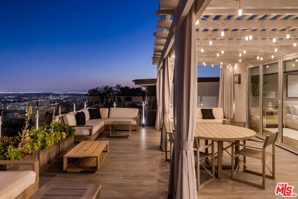 Set above the Sunset Strip in the legendary Bird Streets, this modern hillside retreat commands jetliner panoramas stretching from Downtown Los Angeles to the Pacific, offering a rare sense of calm and seclusion just moments from the city. Positioned across multiple levels and thoughtfully designed for privacy, the residence unfolds through expansive walls of floor-to-ceiling glass that bathe the interiors in natural light while framing uninterrupted views at every turn. Custom wall treatments and bespoke upgrades create intentional spaces designed for both everyday living and entertaining.The kitchen is both a functional centerpiece and a gathering place, appointed with custom millwork, professional-grade appliances, and a substantial center island that anchors the main level. Adjacent living spaces extend naturally to outdoor terraces, while an upper-level family room opens directly to additional patios, allowing the home to unfold outdoors.The primary suite is positioned as a private escape, with direct access to an expansive terrace arranged for open-air dining and quiet relaxation against a sweeping city backdrop. Within, a generous walk-in closet with safe and a finely finished bath - featuring dual vanities, a soaking tub, and marble shower - complete the suite. Guest accommodations throughout the residence maintain the same level of consideration, offering privacy and comfort in equal measure. Above it all, a rooftop retreat, bordered by mature hedging, introduces a rare vantage point with an additional putting green and jacuzzi, suspended high above the lights below.