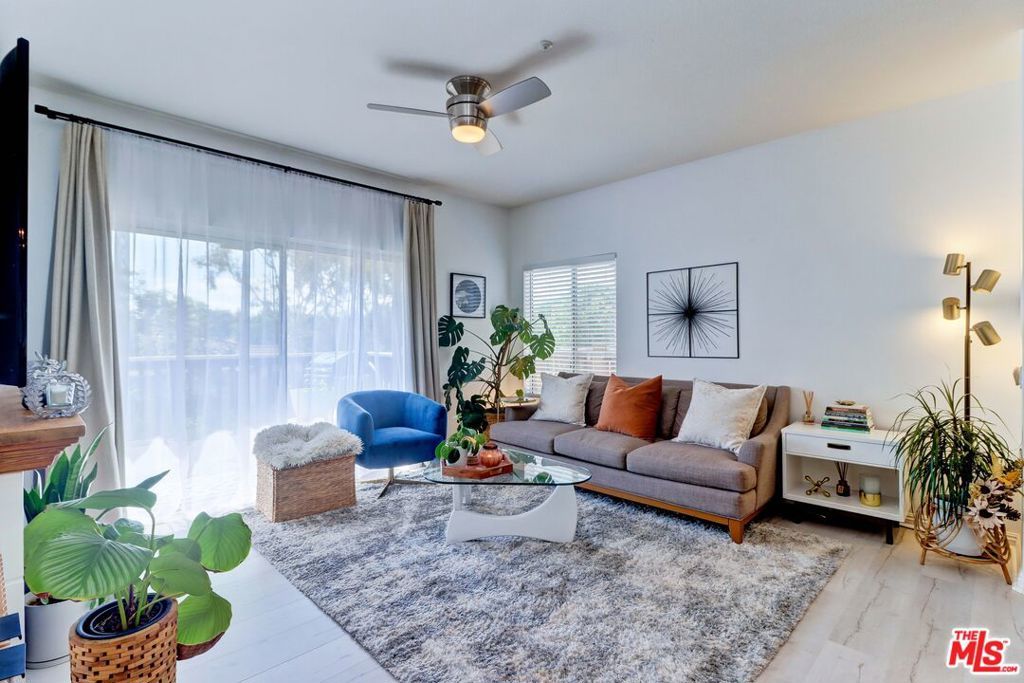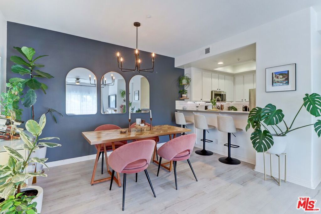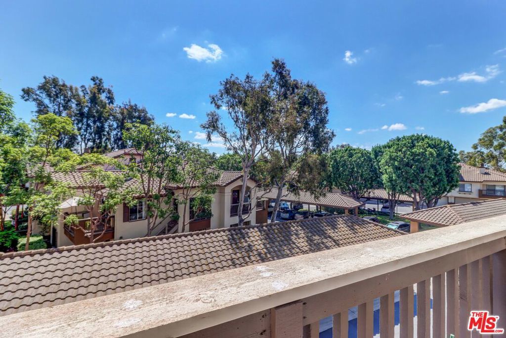 Located in the desirable Rancho Veracruz golf course community, this top-floor one-bedroom residence offers privacy with no unit above, abundant natural light, and tranquil tree-top views. The living area opens to a spacious dining area that can accommodate both a dining table and a home office. The open-concept layout flows into the kitchen with a breakfast bar, creating a functional and comfortable living space. Recent updates include vinyl flooring throughout, an updated kitchen, and a modern bathroom vanity. The bedroom offers two closets, including a walk-in closet with mirrored doors, and built-in cabinetry near the bathroom provides ample linen storage. An in-unit washer and dryer adds everyday convenience. A private balcony extends the living space and is suitable for outdoor seating or barbecuing. Community amenities include two pools with spas, a fitness center, and a clubhouse. Water and trash are included in the HOA dues. Assigned carport space #389 is conveniently located nearby. This residence offers a comfortable and well-maintained living environment in a quiet, established community.