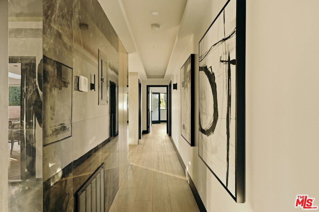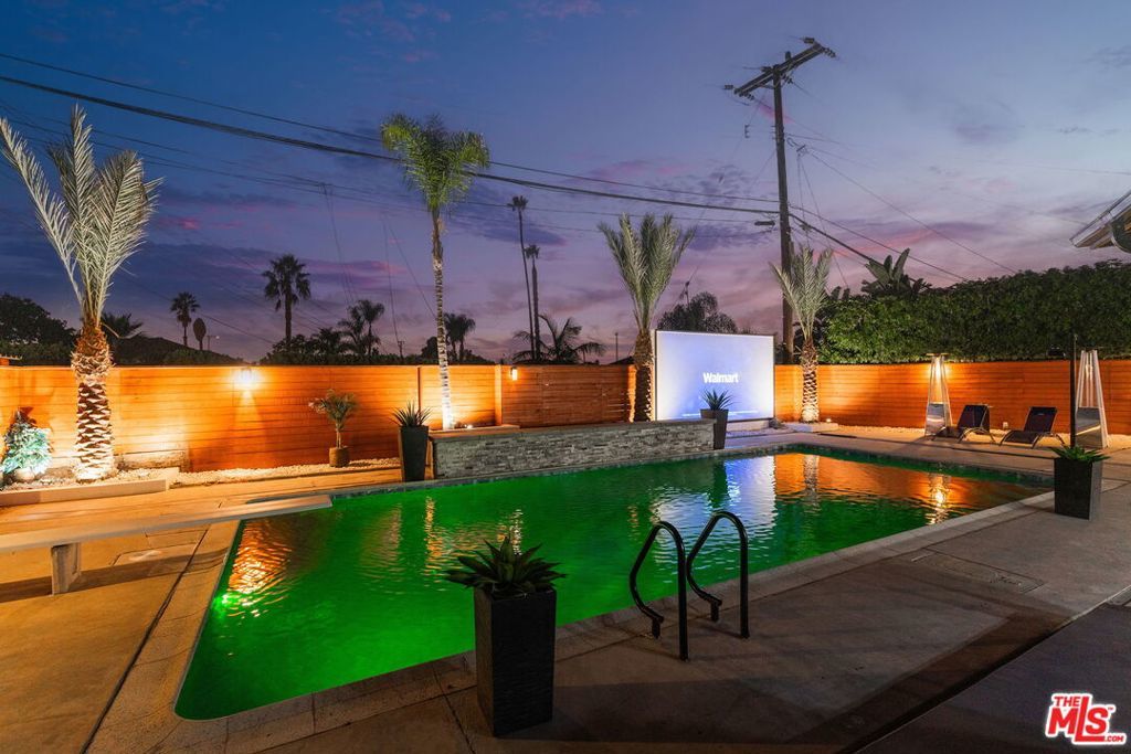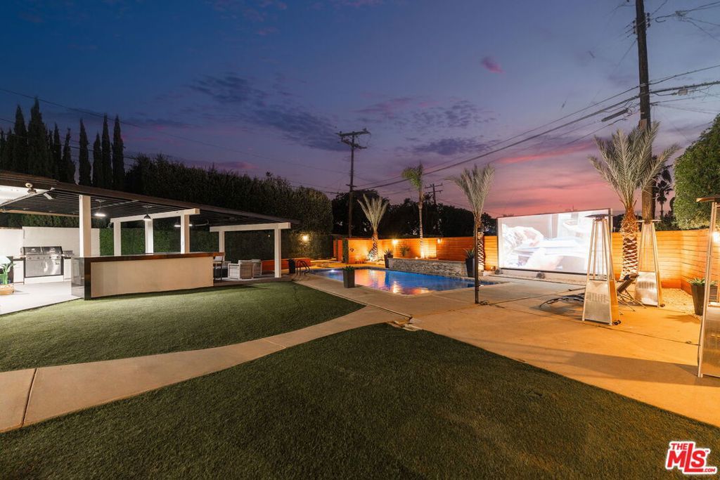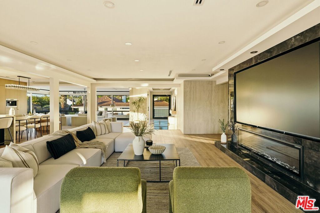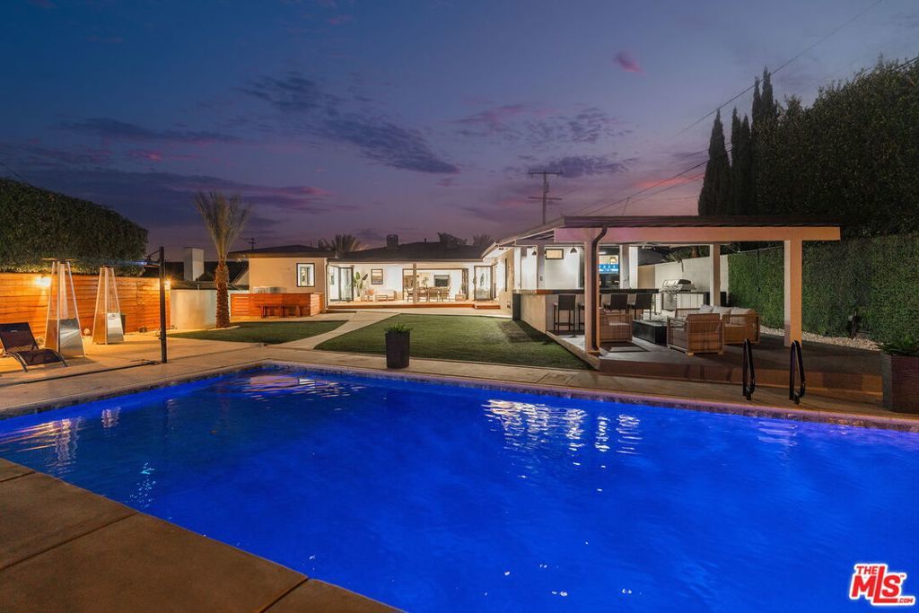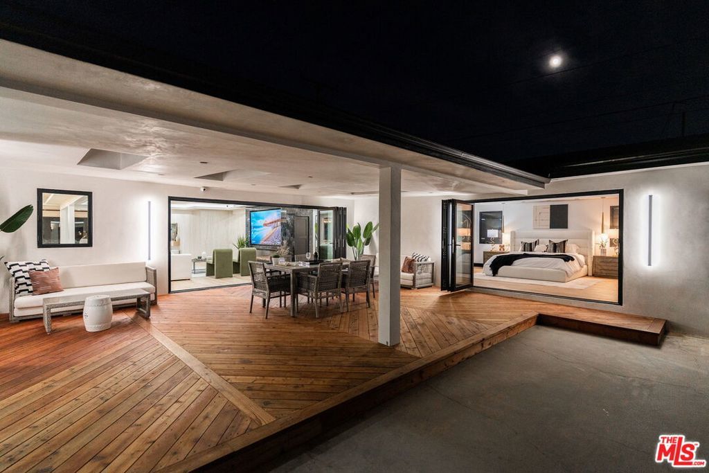 Welcome to this stunning contemporary home in the desirable Ladera Heights neighborhood, where modern elegance meets exceptional functionality. As you walk in through the impressive pivot front door, you are greeted by a sophisticated foyer featuring a wine glass enclosed display and a beautifully designed cove ceiling entry that sets the tone for the rest of the home. The inviting open floor plan seamlessly integrates the family room, which impresses with a state-of-the-art 100-inch TV and a cozy electric fireplace, while the living room features built-in bookshelves and expansive window walls that showcase breathtaking views of city lights and treetops, offering a perfect space for both relaxation and entertainment. Adjacent to the kitchen is a dedicated dining room, thoughtfully designed to accommodate gatherings with seating for eight at the dining table and four at the island counter top. The gourmet kitchen itself is a chef's dream, boasting an over sized island with Taj Mahal stone counter tops and a waterfall edge, complemented by custom cabinets and high-end Thermador appliances including a built-in refrigerator, freezer, wine cooler, and a Wolf 48-inch stove equipped with a pot filler overhead. Additional culinary conveniences include two ovens, a speed oven, two Bosch dishwashers, and a built-in coffee maker for your daily lattes. An accordion window perched above the farmhouse sink adds a unique touch, seamlessly connecting the indoor space to the outdoors, while three additional accordion doors throughout the home invite in natural light and fresh air. The primary bedroom suite serves as a personal sanctuary, complete with a lavish walk-in closet featuring built-in storage, an island, and chandelier, along with a stunning double shower that includes body sprays and a steam feature. Step outside to discover the outdoor space, truly an entertainer's paradise, featuring a spacious deck off the living room and primary bedroom, along with a fully equipped outdoor kitchen that boasts an eat-in bar accommodating approximately 10 or more people, topped with beautiful black onyx granite and a waterfall edge. This space also includes a built-in BBQ, sink, mini refrigerator, and TV, as well as a projector with an impressive 18 to 20-foot wall screen for movie nights. The over sized pool with a dramatic waterfall and beautifully landscaped grounds with palm trees and artificial grass complete this incredible outdoor oasis. This exceptional property also boasts all new electrical, plumbing, and roofing, as well as a new HVAC system with two separate Google thermostats for optimal climate control. Speakers throughout the primary bedroom and powder room enhance your living experience, making this home perfect for modern living. With a 3 car garage equipped with new doors and an EV charger, and conveniently located near shopping options like Trader Joe's, Sprouts, and Amazon Fresh, as well as just minutes from the beaches and LAX, this home offers an unparalleled lifestyle of luxury and convenience.