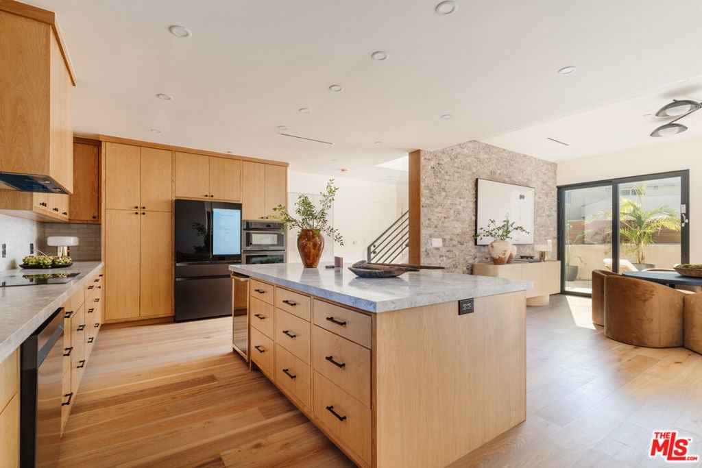 Nestled on a generous corner lot in the heart of Oxford Triangle, this 3,373 modern masterpiece rests in the peaceful pocket minutes away from the hustle and bustle of Venice, Abbot Kinney, and Marina del Rey. A grand custom pivot door opens to soaring ceilings and warm oak floors. The dramatic sunken living room, anchored by a linear gas fireplace, flows seamlessly into the dining area and chef's kitchen, which features elegant marble countertops and white oak Del Mar cabinets. A full wall of floor-to-ceiling pocket doors opens wide, fusing the entire great room with the sun-drenched pool terrace and its pool + spa, built-in outdoor kitchen, gas fire pit, and plush conversation lounge, all privately tucked behind mature palms.The main level features a glass-walled office, powder room and two-car garage with gated driveway access. Upstairs you'll find four spacious, light-filled bedrooms. The primary suite delivers hotel-level luxury with a second fireplace, sitting nook, wraparound balcony for sunset views, soaking tub, dual vanities, water closet, and large walk-in closet.Located in one of L.A.'s most desirable coastal neighborhoods, 726 Howard offers rare walkability. Stroll to the beach, cruise the bike paths and enjoy popular restaurants and shopping. Experience unbeatable charm and refined living by the sea, just minutes from the best of Marina del Rey and Venice. Don't miss out on this modern coastal gem!