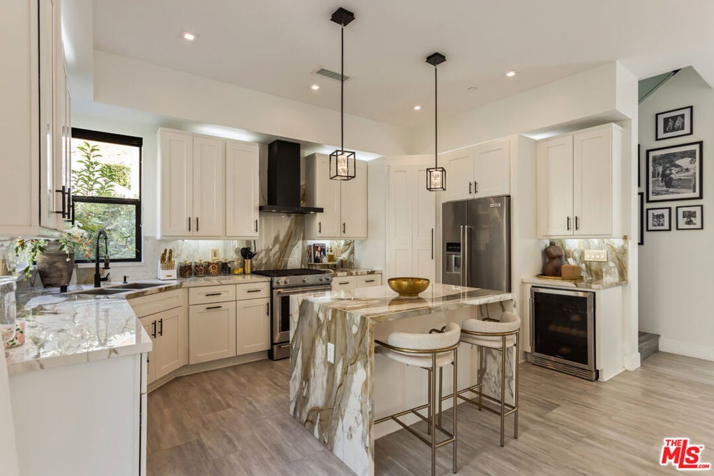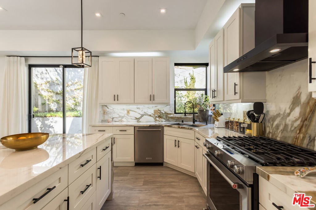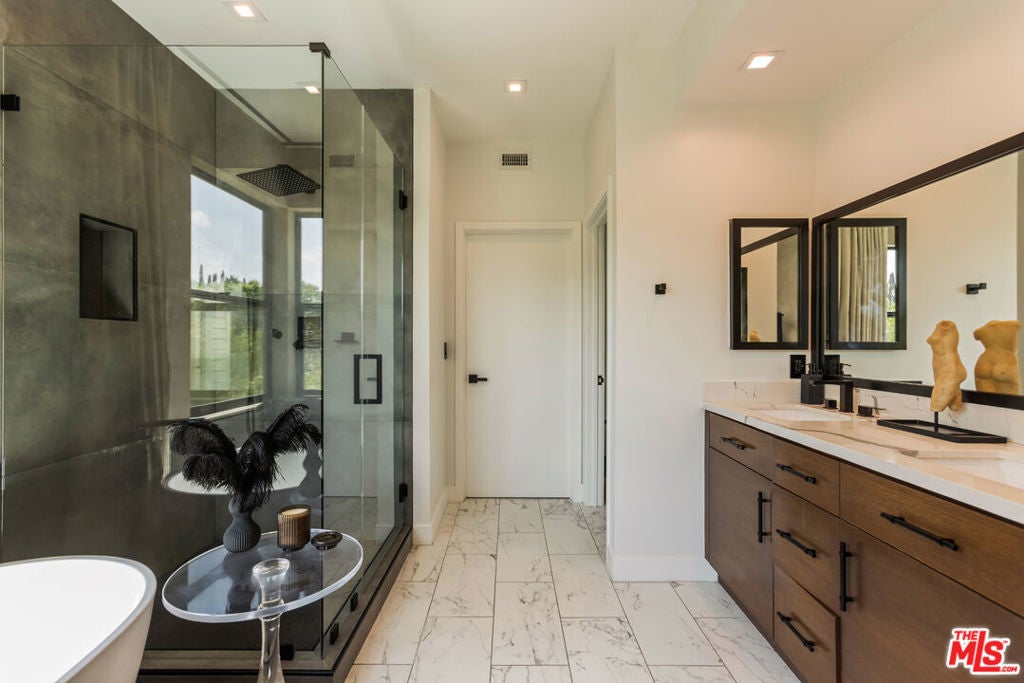 Tucked into the peaceful hills south of Ventura Boulevard, this newly renovated modern home offers an extraordinary blend of style, comfort, and technology. From the moment you enter, you're welcomed by soaring ceilings, abundant natural light, and an open layout that seamlessly connects each living space with effortless flow. Designer touches are found throughout from custom Italian wallpaper accented with 24k gold leaf to refined lime-wash finishes and statement lighting. The chef-inspired kitchen features high-end stainless-steel appliances, a bold center island, and striking Mediterraneo Macchia Antica porcelain surfaces, making it as functional as it is beautiful.The spacious family room, complete with a sleek fireplace, is perfect for cozy nights or entertaining guests. Upstairs, the luxurious primary suite offers a spa-like bathroom with dual vanities, a freestanding soaking tub, walk-in shower, and access to a private balcony with peaceful hillside views. Two additional bedrooms provide ample space, while a separate bonus room/office on the lower level adds flexibility for work or play.A true standout feature is the converted 2-car garage, now a high-performance private gym outfitted with custom flooring, top-tier equipment, and a built-in sauna perfect for fitness enthusiasts or post-workout relaxation.Enjoy complete control and comfort with cutting-edge smart home technology, including Sonos surround sound, NEST thermostat, dual-zone HVAC, tankless water heater, and security-enhancing unbreakable glass.Located just minutes from Westfield Topanga, premium dining, and boutique shopping, this turn-key property offers incredible value in one of Woodland Hills' most sought-after neighborhoods.A rare opportunity at an unbeatable price act fast, this home won't stay on the market for long.
