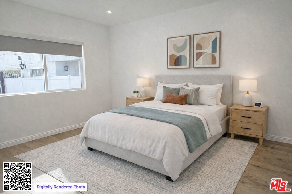 This is the first time in years (if ever) that this beautifully re-imagined 2-bedroom, 1.5-bath residence has been available for lease. A rare, free-standing single-family home within a small triplex, it is ideally located on a quiet, tree-lined residential street while remaining moments from the shops, dining, and nightlife along Santa Monica Boulevard that define West Hollywood living. The home has recently undergone a thoughtful and extensive renovation, creating a bright, cheerful, and inviting living environment. Wide-plank wood flooring and recessed lighting flow throughout, complementing a clean, neutral palette that enhances both volume and continuity. Public spaces are organized within a spacious great room featuring distinct living and dining areas, a generous wall ideal for art or media, and a bank of windows that fills the space with natural light. The newly remodeled kitchen is both stylish and highly functional, showcasing brand-new stainless steel appliances, quartz-style countertops, and abundant cabinetry and storage. A convenient guest bath completes the main living area. Both bedrooms are well-proportioned and charming, offering good closet space, with laundry thoughtfully located just outside their doors. The primary bedroom opens to a sunny rear patio, while the front bedroom overlooks an expansive, gated parking area secured by newly installed metal fencing and gates. Mature specimen trees and lush greenery further enhance the property's sense of privacy. The primary and guest bathrooms have been beautifully remodeled with coordinated finishes and modern fixtures, completing this turnkey offering that blends comfort, style, and location.
