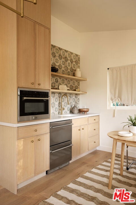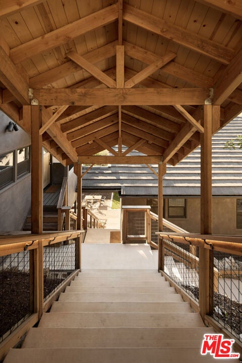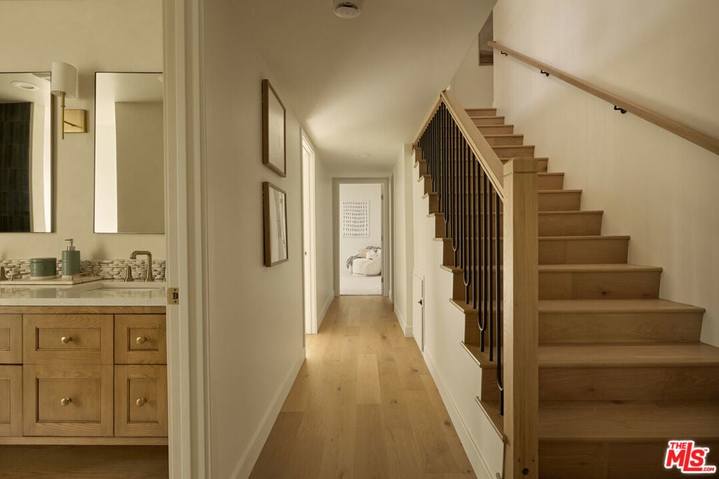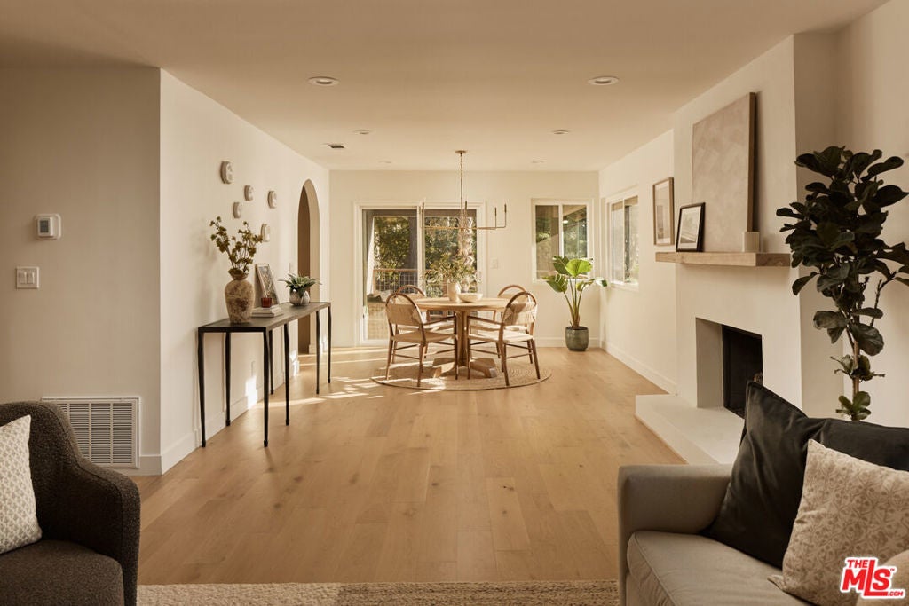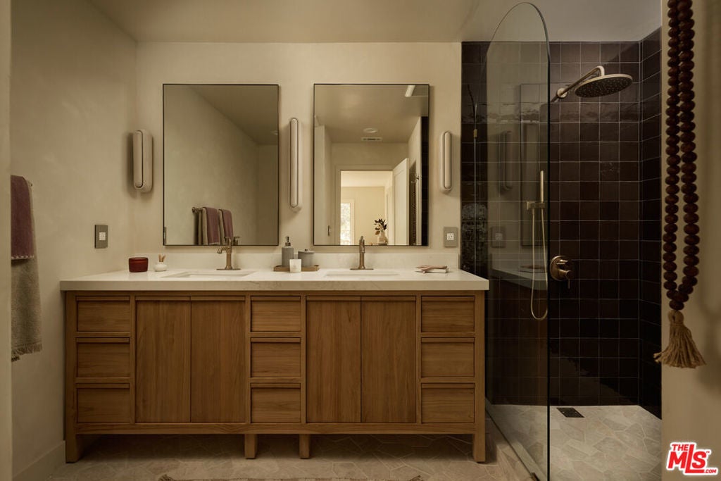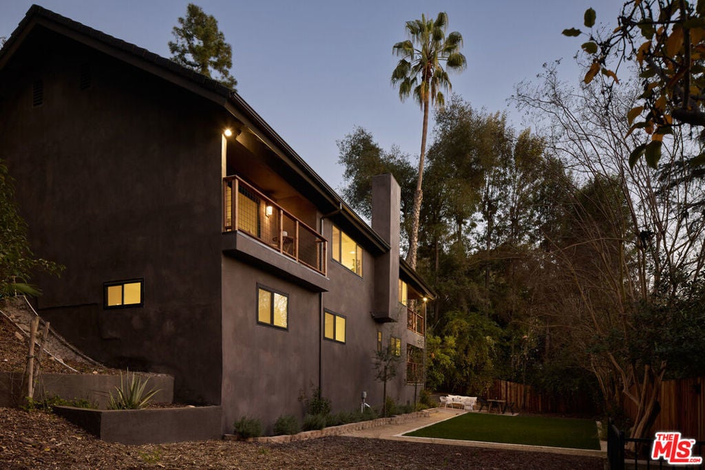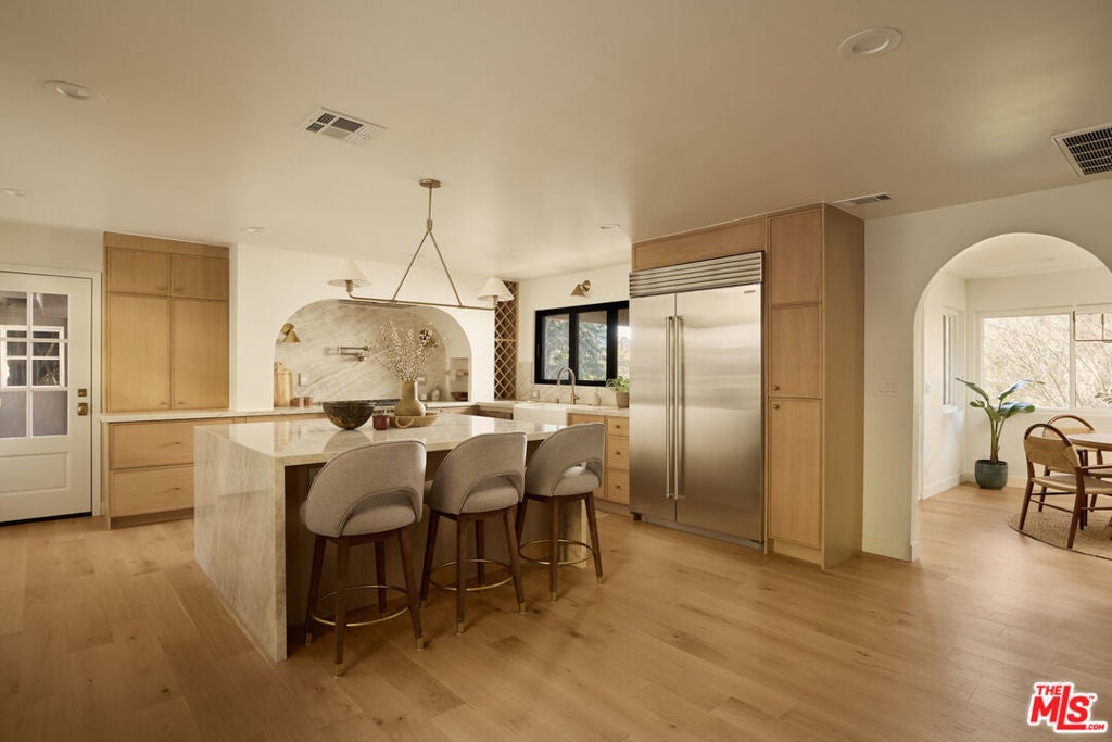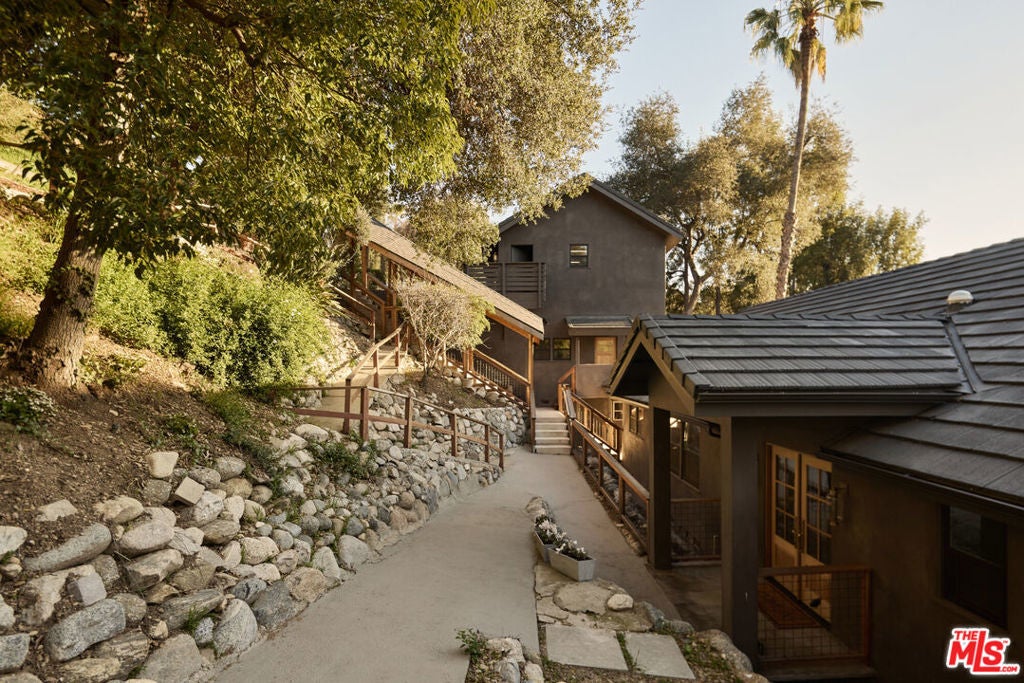 A fully reimagined, multi-level hillside home by Nicole Douglas Designs, defined by craftsmanship, privacy, and its connection to nature. A processional, pavilion-style entry leads through a covered timber passage framed by hand-crafted joinery, descending steps, and filtered light, all signaling a transition into a tranquil retreat. Inside the main house, curved arched doorways and continuous Mullican European White Oak flooring establish a seamless flow between spaces. The kitchen serves as a central gathering point, where materiality and function are thoughtfully designed. A Taj Mahal quartzite island is the focal point, complemented by Wolf and Sub-Zero appliances, custom White Oak Slim Shaker cabinetry, hand-made white oak spice shelves within a carved arched stove hood, integrated vertical wine storage designed for temperature stability, and large windows that bring in abundant natural light. A walk-in pantry is discreetly positioned off the kitchen, providing generous storage and prep capacity. The kitchen opens into the dining area and main living room, where a flame-lit natural gas fireplace finished in Venetian plaster is paired with a solid wood mantel. The primary bedroom is set apart with its own private deck overlooking the grounds. The en-suite bathroom is finished in stone and spa-like tile featuring dual vanities and a glass-enclosed walk-in shower. The lower level includes 3 additional bedrooms, an office, and a flexible space suitable for a media or family room. A lower-level deck extends the living area outward, creating an ideal setting for a wellness or workout space surrounded by nature. A separate guesthouse includes its own kitchenette, living and dining areas, private balcony, and ensuite bedroom, offering flexibility for guests, creative use, or income opportunities. The backyard is designed as a true extension of the home with terraced pathways, multiple seating areas, mature trees, and a grassy lawn area optimal for entertaining. A rare amenity further distinguishes the property: direct private access to Brookside Park, offering additional walking paths, tennis courts, and recreational areas just beyond the property line. Located in one of Pasadena's most desirable residential pockets, 521 Fremont Drive is moments from the Rose Bowl, Old Town Pasadena, and the best of the city's culture and dining.