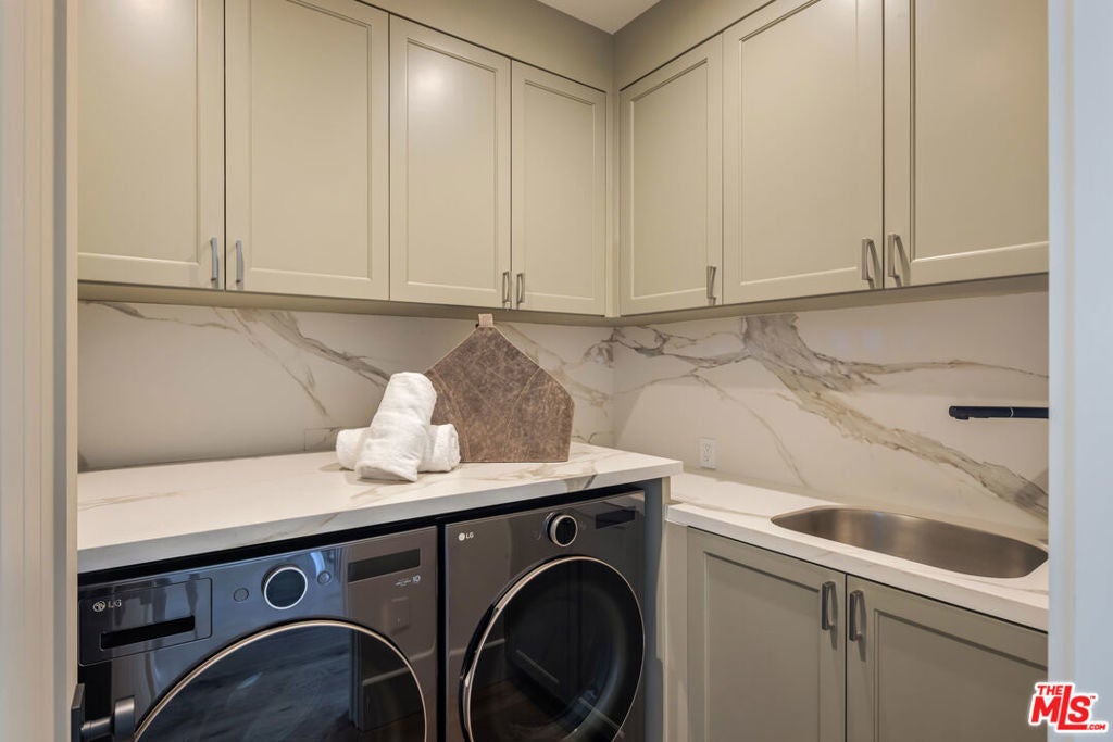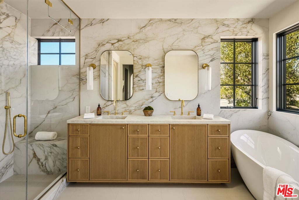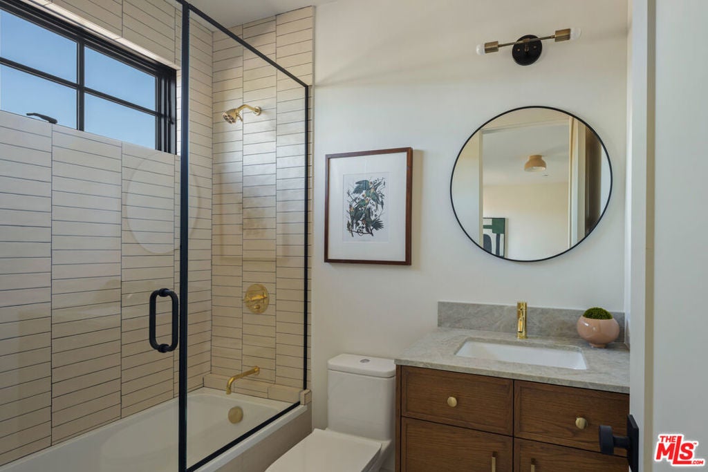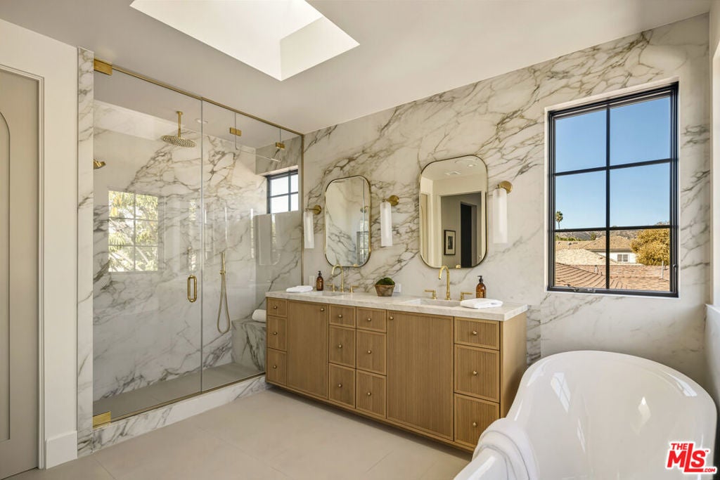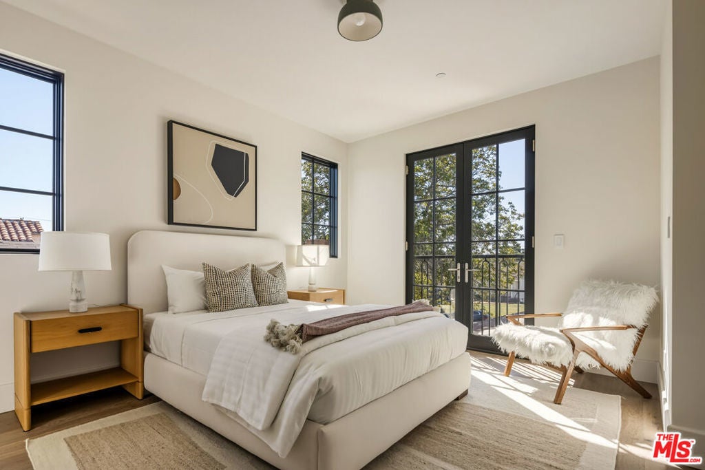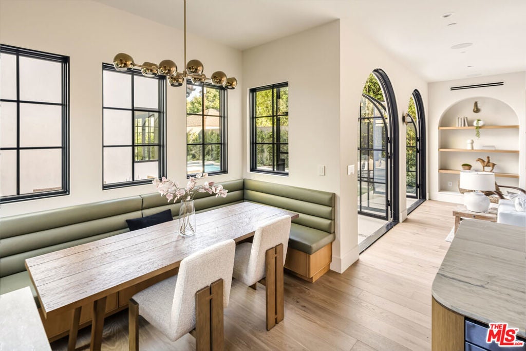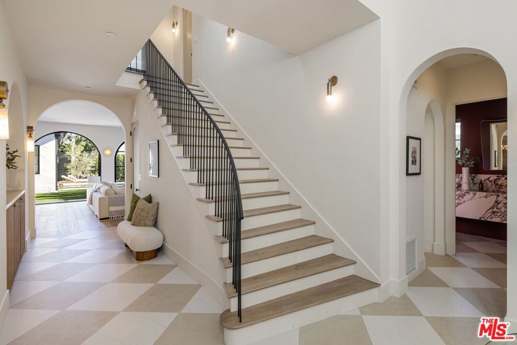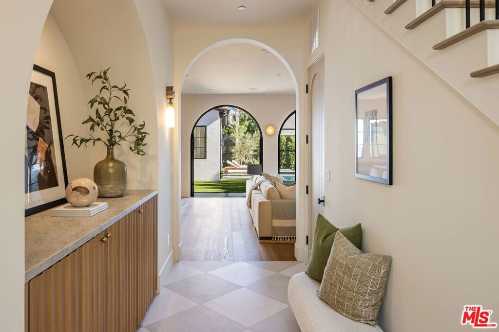 Experience bespoke luxury in this custom-built, modern Mediterranean estate, where exquisite craftsmanship meets timeless design. Sited on a 7,000+ SF lot near premier dining, shopping, and cultural destinations, this new construction residence offers a rare blend of elegance and functionality. A handcrafted wood entry door welcomes you into a grand double-height foyer, featuring checkerboard tile flooring, custom built-ins, and a stunning skylit staircase. Arched doorways lead to a formal living room with vaulted ceilings, while the adjacent dining room connects to a butler's pantry for seamless entertaining. The gourmet kitchen is a chef's dream, boasting a large island with Travertine counters, top-tier appliances, white oak cabinetry, and a built-in breakfast banquette. The open-concept den features arched steel doors that open to the entertainer's patio, complete with outdoor dining, a pool, spa, and a fully permitted ADU, perfect as a guest suite or private retreat. Conveniently located on the first level, a private bedroom with an ensuite bathroom offers flexibility for guests or multigenerational living. Upstairs, the primary suite impresses with vaulted ceilings, a spa-like bath (fluted cabinetry, slab walls, soaking tub), and dual closets. Two additional ensuite bedrooms, a laundry room, and a spacious office complete the upper level. Notable features: Gated entry, secured parking for 3 cars, designer lighting, artisanal tilework, rich wood accents, and a stately mature pine tree. This home is a true celebration of refined living.