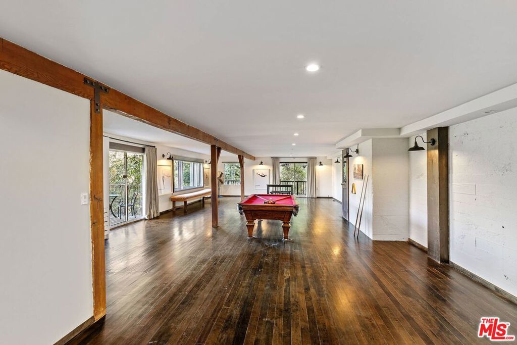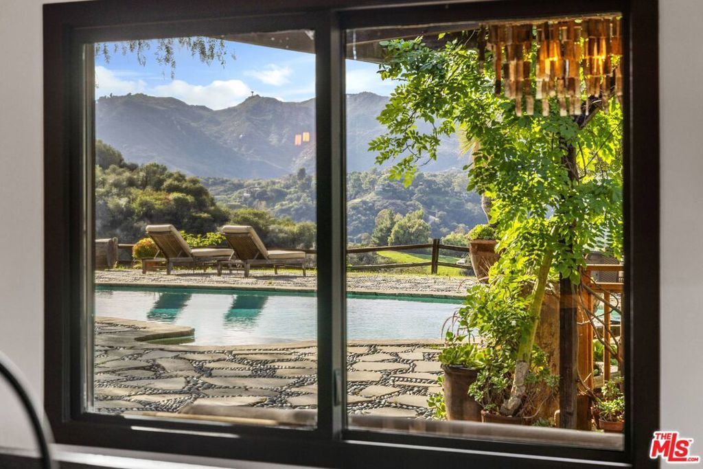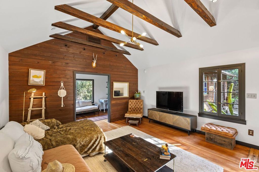 Tucked into the hills of Topanga, this rare 1930s retreat blends timeless character with thoughtfully curated modern updates and sweeping canyon and mountain views. Original hardwood floors, vaulted ceilings and exposed wood beams create a warm and authentic atmosphere, while expansive windows frame the surrounding landscape. The main living level features a dramatic living room with soaring ceilings and a wood-burning stove, flowing into the dining area and remodeled chef's kitchen with custom walnut cabinetry, volcanic stone countertops, a Viking range and an adjacent lounge area ideal for entertaining. Two guest bedrooms on this level enjoy peaceful views, along with a full bathroom with backyard access and a convenient half bath with double sinks. The lower level offers a serene primary suite with a spa-like en-suite bath featuring dual sinks, a clawfoot tub and a glass-enclosed shower, plus an oversized flexible room perfect for a screening room, office or creative space. Outdoors, enjoy a private, resort-style setting with lush landscaping, a saltwater pool and spa, expansive patios and multiple outdoor living areas. A true Topanga escape approximately six miles to Woodland Hills and ten miles to the beach.