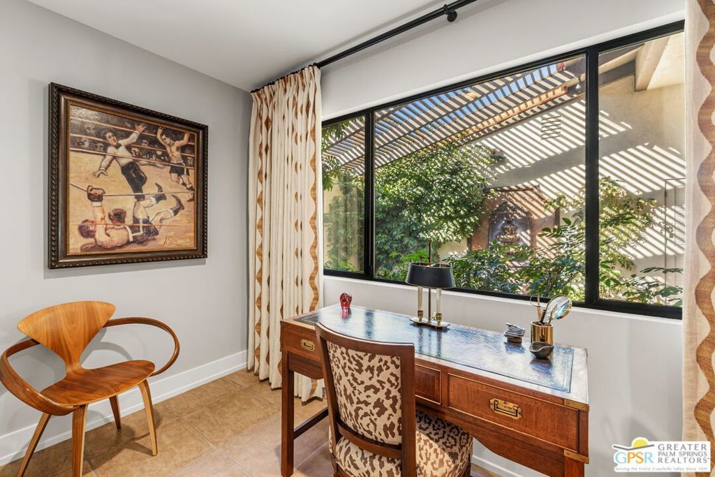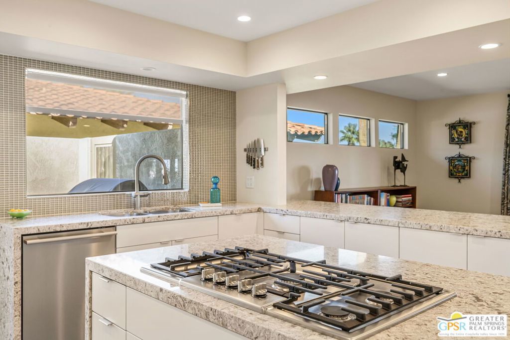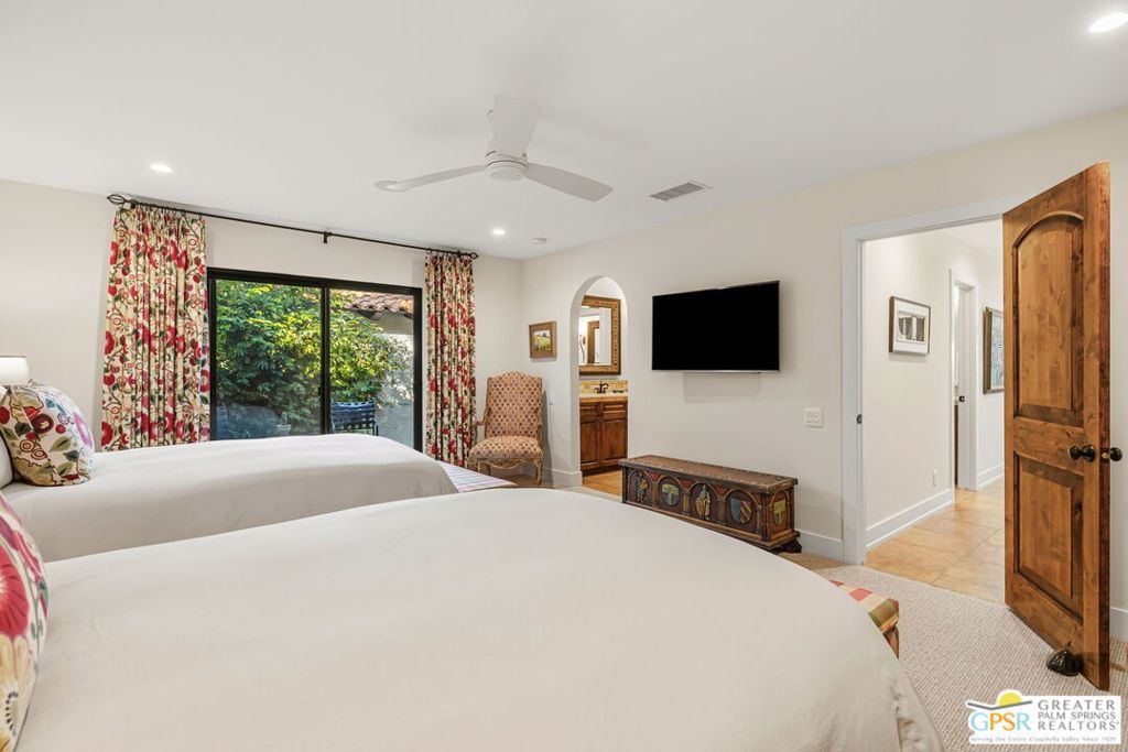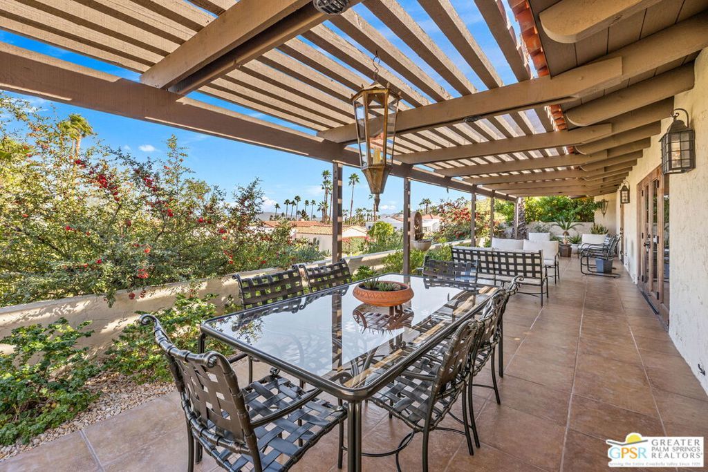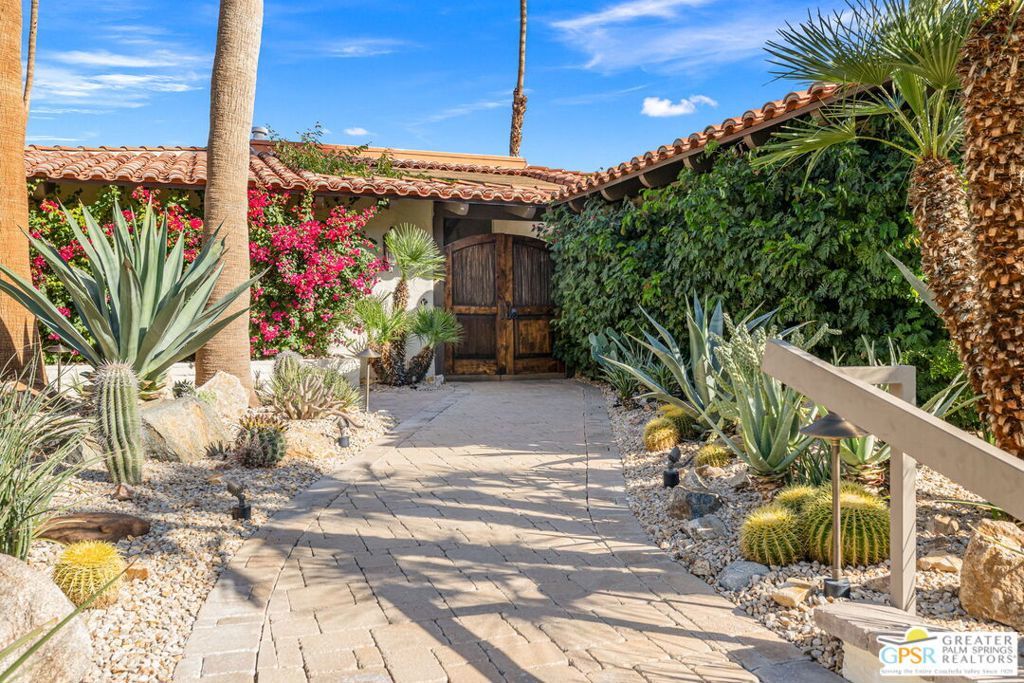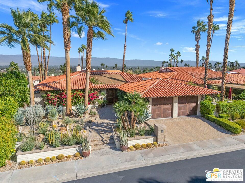 Perched above the valley floor on Fee Land in the prestigious Thunderbird Villas, this beautifully updated hillside 3 bedroom, 3 bath residence delivers a rare blend of privacy, views, and effortless desert living - all on fee simple land. From the moment you arrive, an ultra-private south-facing courtyard sets the tone, creating a peaceful outdoor retreat framed by dramatic mountain scenery. Double doors open to a light-filled living space designed for entertaining, featuring vaulted ceilings with exposed wood beams, a gas fireplace, a custom bar, and French doors that lead to a long view-oriented patio overlooking the valley and surrounding mountains. The adjacent kitchen is both stylish and functional with modern cabinetry, quartz countertops, stainless steel appliances, and a large detached island, flowing seamlessly to the dining area and outdoor BBQ that is ideal for indoor-outdoor gatherings. The Primary Ensuite enjoys mountain and valley views, built-in speakers, direct patio access, a walk-in closet, and a private bath with walk-in shower. Junior Ensuite Two also offers views, a walk-in closet, and its own ensuite bath. Junior Ensuite Three is positioned for added privacy with its own patio access and a bath featuring split vanities and a walk-in shower. An attached two-car garage adds everyday convenience. Thunderbird Villas offers a guard-gated setting, lush landscaping, community pools, cable and trash service, and golf-cart access to Thunderbird Country Club. Just minutes from dining, shopping, and the best of Palm Springs and Rancho Mirage, too! With panoramic valley views out back and dramatic mountain scenery out front, this turnkey hillside retreat offers the best of desert living in one of the area's most sought-after enclaves, on Fee Land.