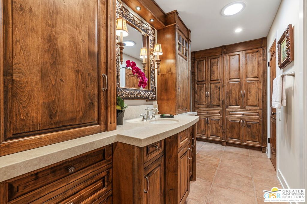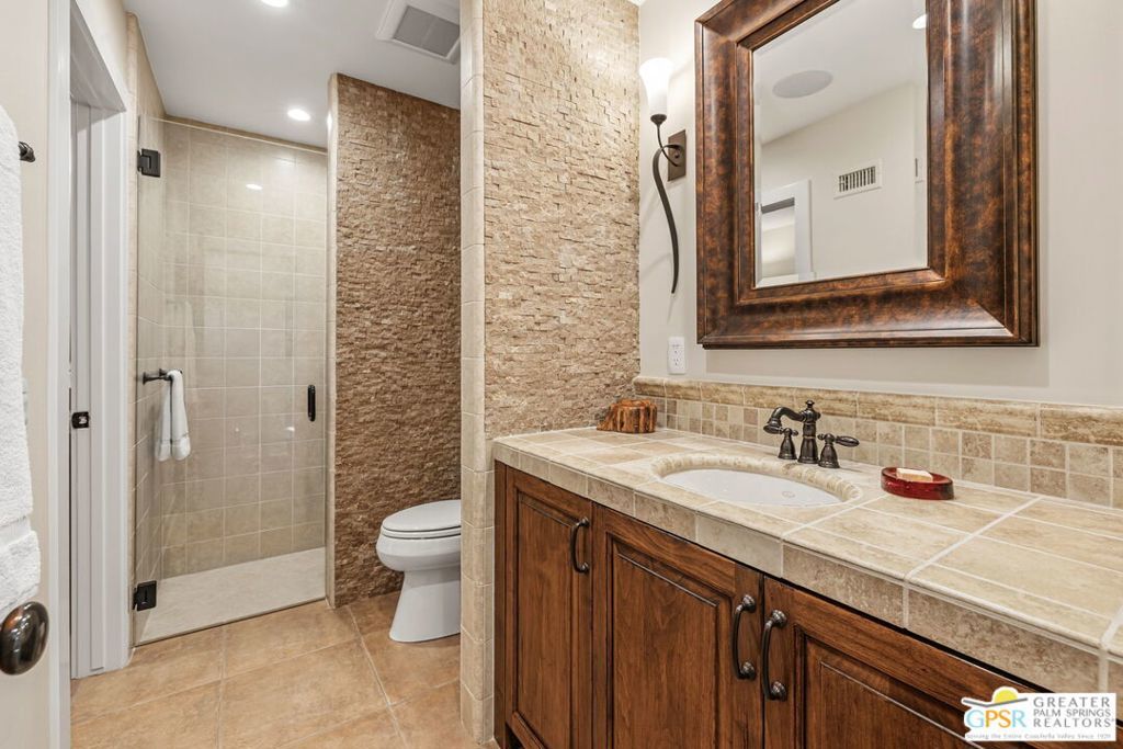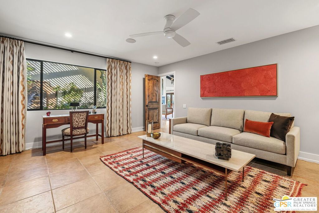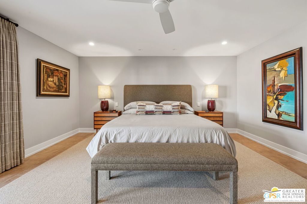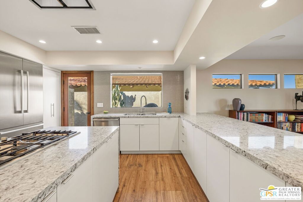 Perched above the valley floor on Fee Land in the prestigious Thunderbird Villas, this beautifully updated hillside 3 bedroom, 3 bath residence delivers a rare blend of privacy, views, and effortless desert living - all on fee simple land. From the moment you arrive, an ultra-private south-facing courtyard sets the tone, creating a peaceful outdoor retreat framed by dramatic mountain scenery. Double doors open to a light-filled living space designed for entertaining, featuring vaulted ceilings with exposed wood beams, a gas fireplace, a custom bar, and French doors that lead to a long view-oriented patio overlooking the valley and surrounding mountains. The adjacent kitchen is both stylish and functional with modern cabinetry, quartz countertops, stainless steel appliances, and a large detached island, flowing seamlessly to the dining area and outdoor BBQ that is ideal for indoor-outdoor gatherings. The Primary Ensuite enjoys mountain and valley views, built-in speakers, direct patio access, a walk-in closet, and a private bath with walk-in shower. Junior Ensuite Two also offers views, a walk-in closet, and its own ensuite bath. Junior Ensuite Three is positioned for added privacy with its own patio access and a bath featuring split vanities and a walk-in shower. An attached two-car garage adds everyday convenience. Thunderbird Villas offers a guard-gated setting, lush landscaping, community pools, cable and trash service, and golf-cart access to Thunderbird Country Club. Just minutes from dining, shopping, and the best of Palm Springs and Rancho Mirage, too! With panoramic valley views out back and dramatic mountain scenery out front, this turnkey hillside retreat offers the best of desert living in one of the area's most sought-after enclaves, on Fee Land.