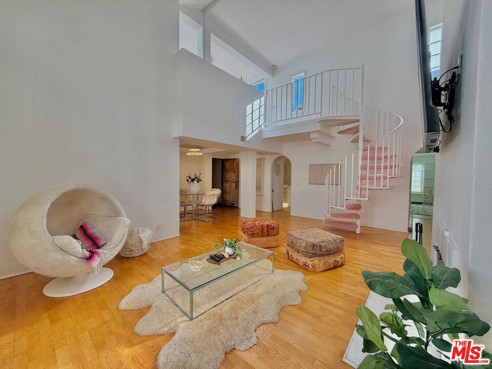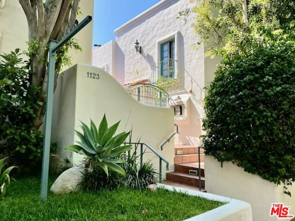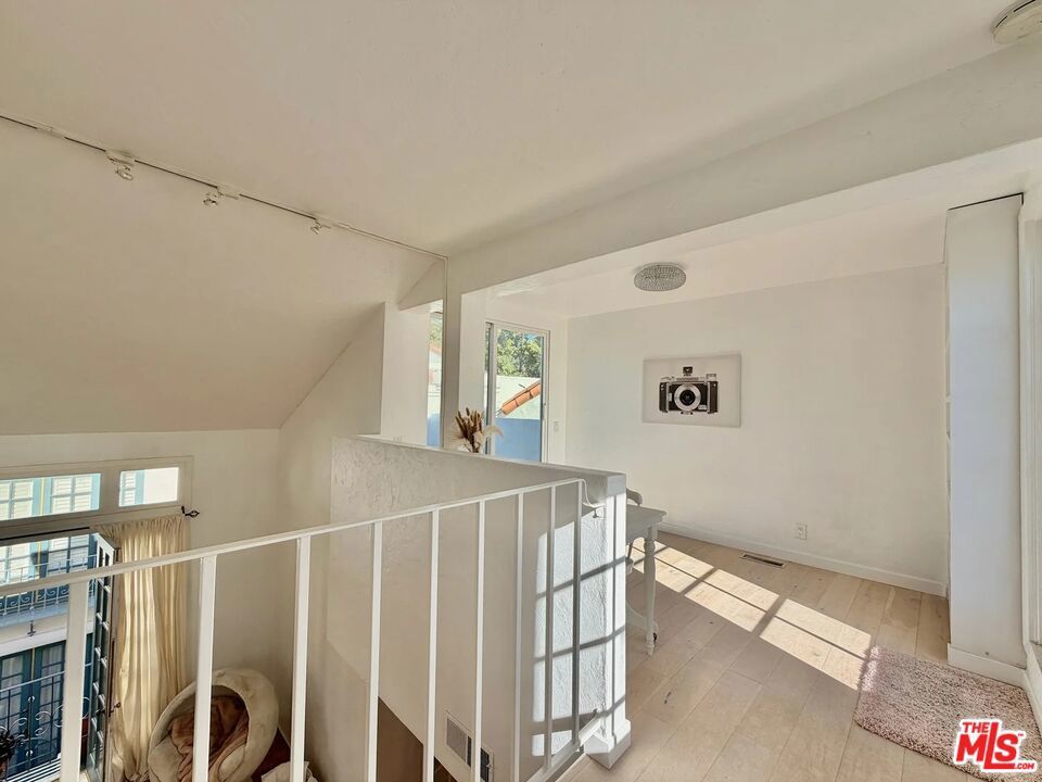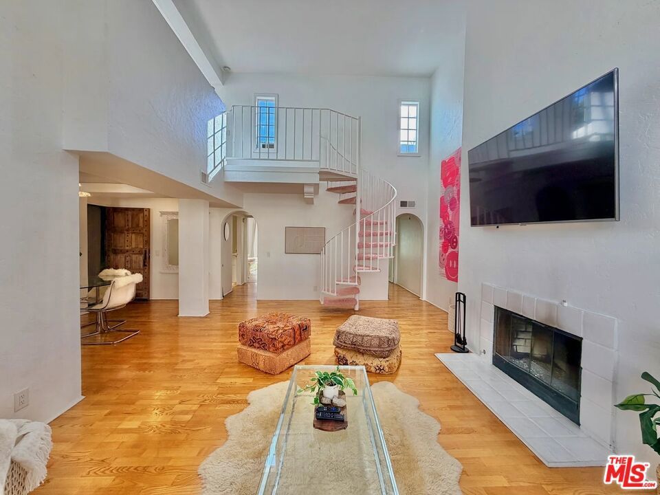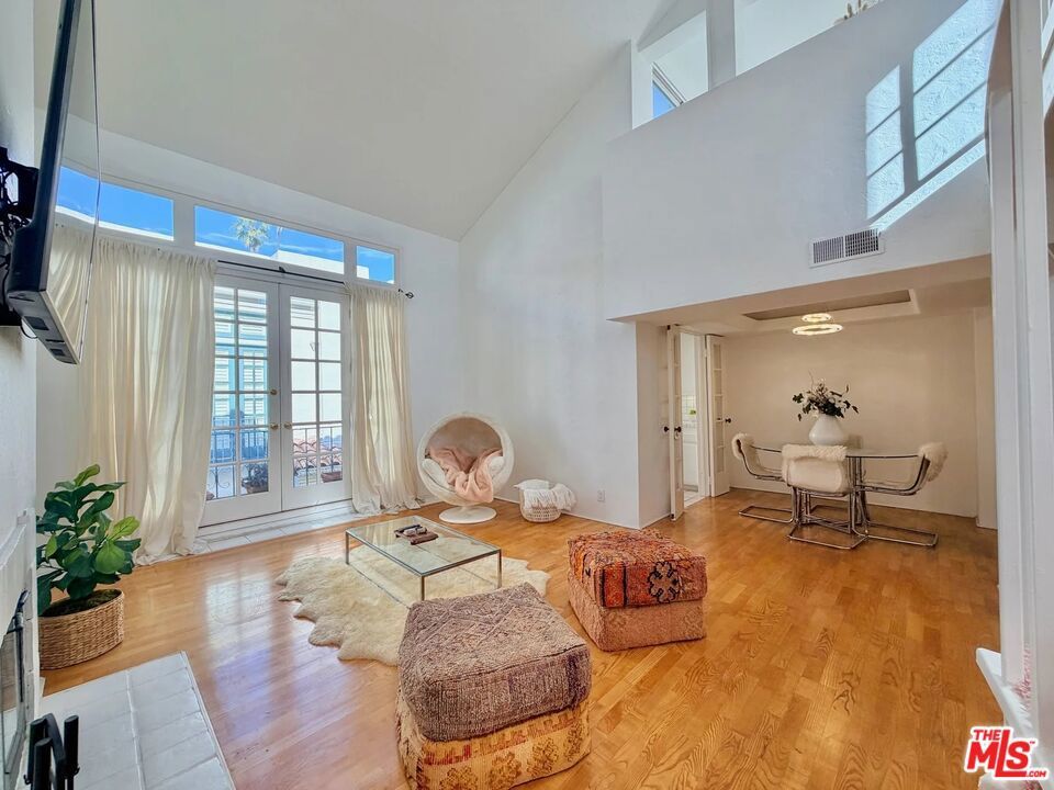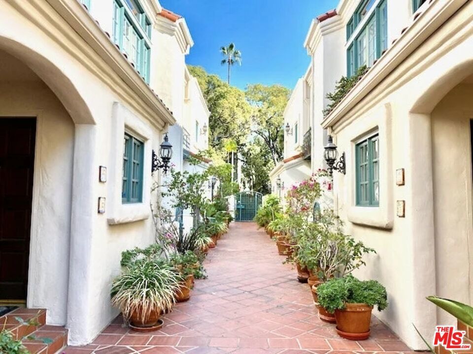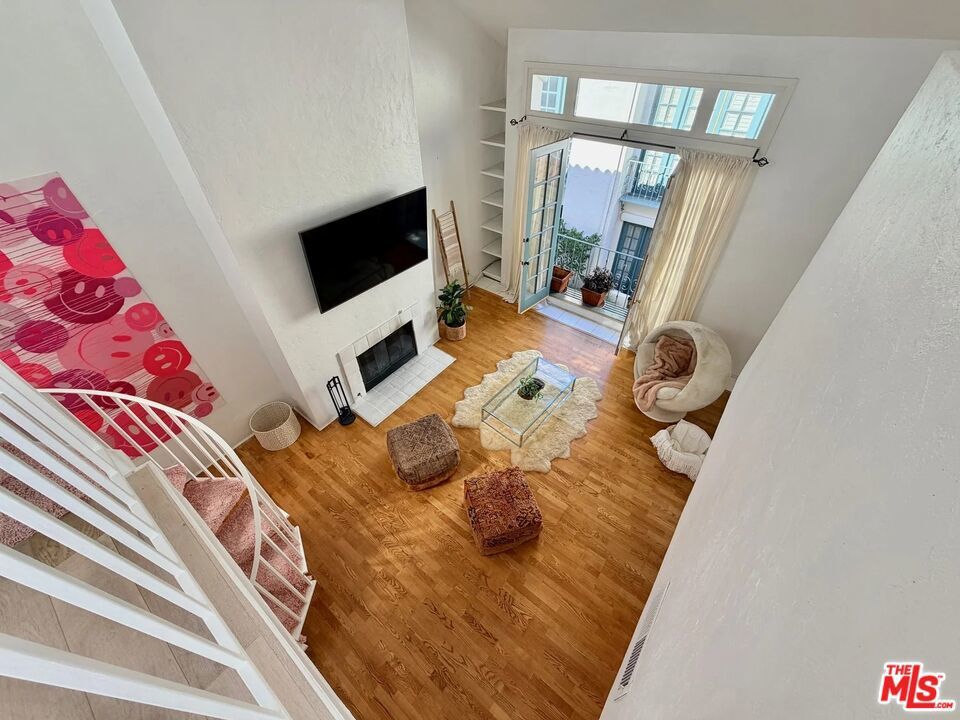 Rare, unique, award-winning, have all described the Villa Flores architecture surrounded by its prime West Hollywood location. The courtyard steeped in Spanish Mediterranean character leads you to the top floor two-story home that exudes the quality and influence of its surroundings. Twenty-foot ceilings, French doors and windows, bring natural light into the space continuously highlighting the textured walls, spiral stairs and fireplace. The master and guest bedroom boast private living areas with en-suite bathrooms and large closets. Up the wide spiral stairs leads you to the open loft/office/media room with two separate rooftop patios ideal for entertaining; one south facing, one north facing, showering you with blue sky, city lights, and views of the hills towering over the Sunset Strip. Taking advantage of this opportunity would be an understatement. Walk to shops, restaurants & groceries etc. Laundry in unit. 2 parking spots. Rooftop Deck.