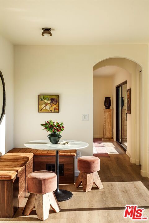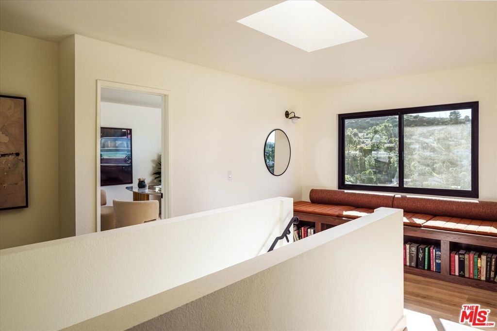 Spectacular Spanish home by Decente Designs perched at the top of the hill with incredible natural light and panoramic views from every room. Flanked by greenery and gardens with exceptional privacy, the main level is elevated off the street and features a reclaimed antique entry door with iron hardware. Enter into the designer remodeled home to find all new flooring, bespoke light fixtures, all new finishes, stunning views out every new Milgard window, with thoughtful and stylish touches throughout. The kitchen features granite countertops, walnut cabinetry, Rejuvenation bronze hardware, Zia tile backsplash and island tile, brass light fixtures, all new appliances, accented by open shelving and plentiful natural light. Off of the kitchen opposite the sitting area is a built-in breakfast nook looking out to the large deck through a sliding glass door with room for al fresco dining and lounging overlooking the expansive hillside views in complete privacy. Through the arched doorways there is a formal dining room complete with fireplace clad in stunning cotto tile, and adjacent to that a classic step down living room featuring another fireplace with custom tile shelving and flanked by wall sconces and large windows. Upstairs the bedroom level features a built-in sitting nook under a view window at the top of the staircase, and a generous primary bedroom with its own balcony, walk-in closet, and en suite bathroom. The primary bathroom is highlighted by limestone flooring, custom cement tile shower with brass hardware, and a double vanity with artisanal light fixtures. The three guest bedrooms and additional guest bathroom, all with stunning views, complete the bedroom floor. Downstairs there is a den off of the larger second deck which has a tiled built-in exterior kitchen area and built-in hot tub all in complete privacy with 180 degree deep views of the surrounding green hillsides. Direct entry two car garage, secluded yard areas on either side of the home, and just a short drive to markets, restaurants, coffee shops, hikes, and more at the bottom of the hill. A special home in the Los Angeles hills awash in natural light and greenery.