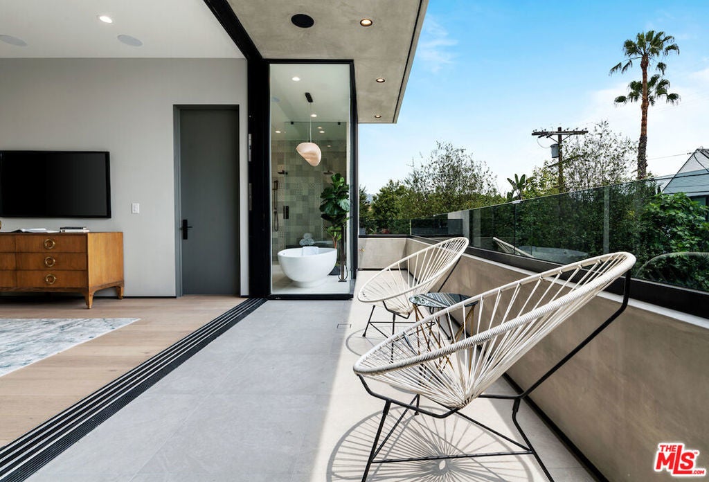 Gated architectural residence designed for the discerning buyer. Enter through a grand pivot door into an inviting home thoughtfully finished with rich wood elements and expansive second-floor and rooftop decks totaling approximately 1,500 additional square feet, offering sweeping views of the Los Angeles skyline and Hollywood Hills. The interior features white oak floors, Spanish tile accents, custom imported Italian vanities, and a chef's kitchen with an oversized island and counter seating that opens seamlessly to the family room and out to the pool, spa, cabana, and deck. The dining room opens to a private lounge deck, while a full suite on the main levelideal as an office or guest suitealso enjoys deck access.The primary suite showcases a striking white oak accent wall and a spa-like bath with a freestanding soaking tub and a tiled shower with dual shower heads. Two additional en-suite bedrooms feature private balconies. Additional features include crestron home automation, alarm and security camera systems, and mature. Centrally located in Beverly Grove, just minutes from Beverly Hills and some of the city's best restaurants and shopping!