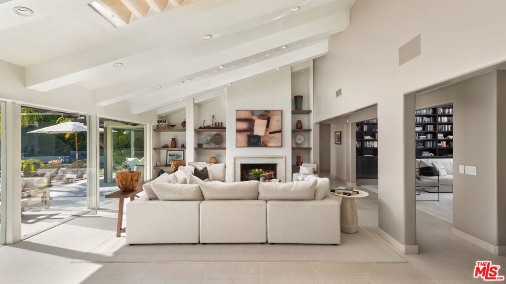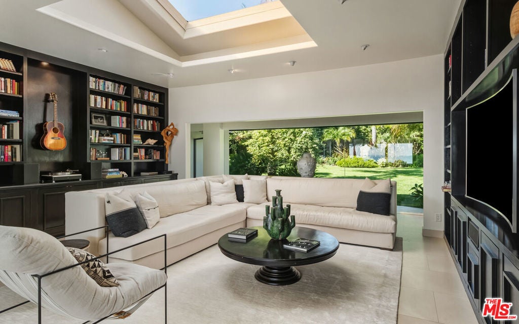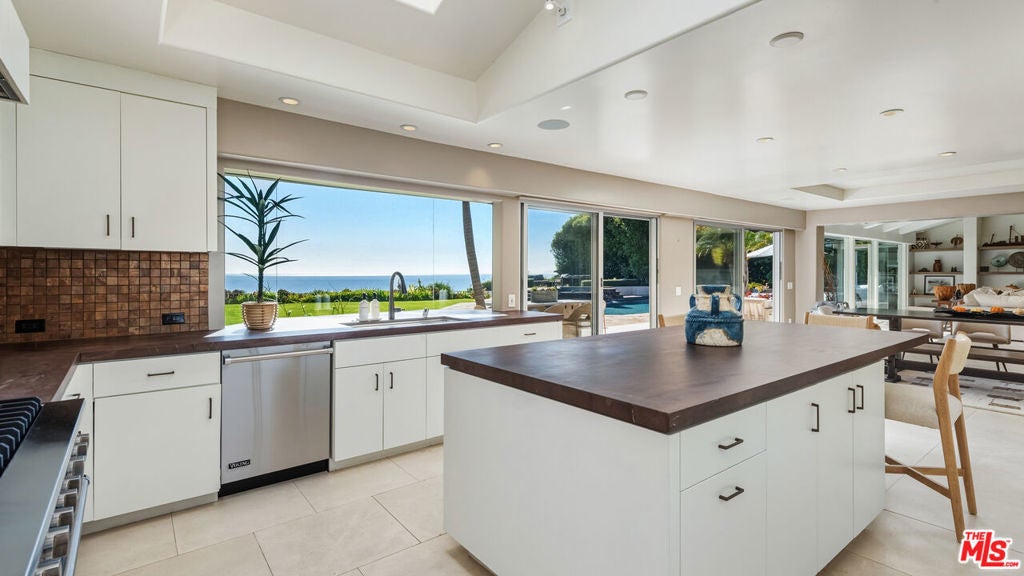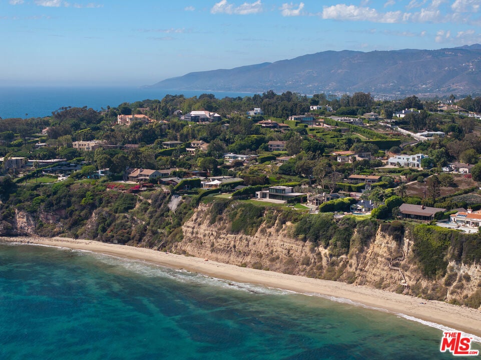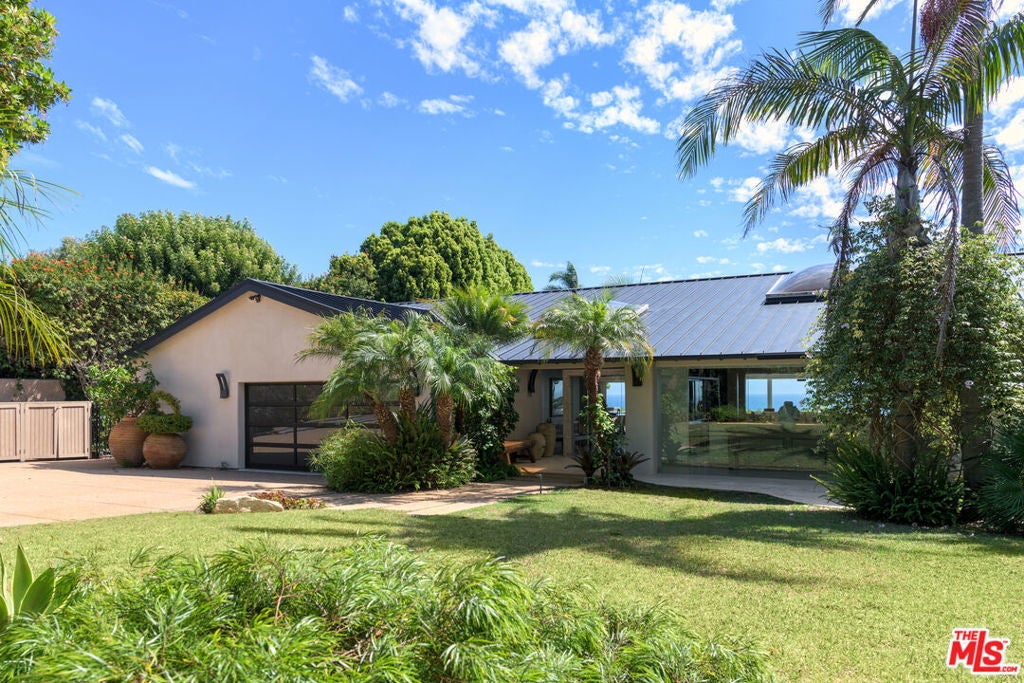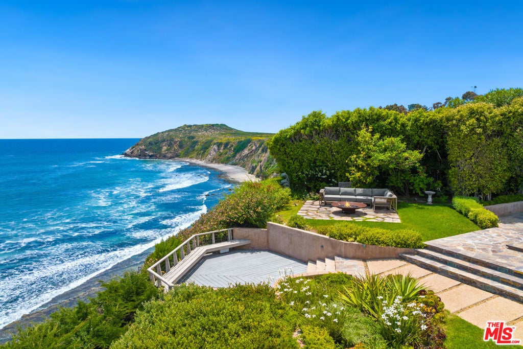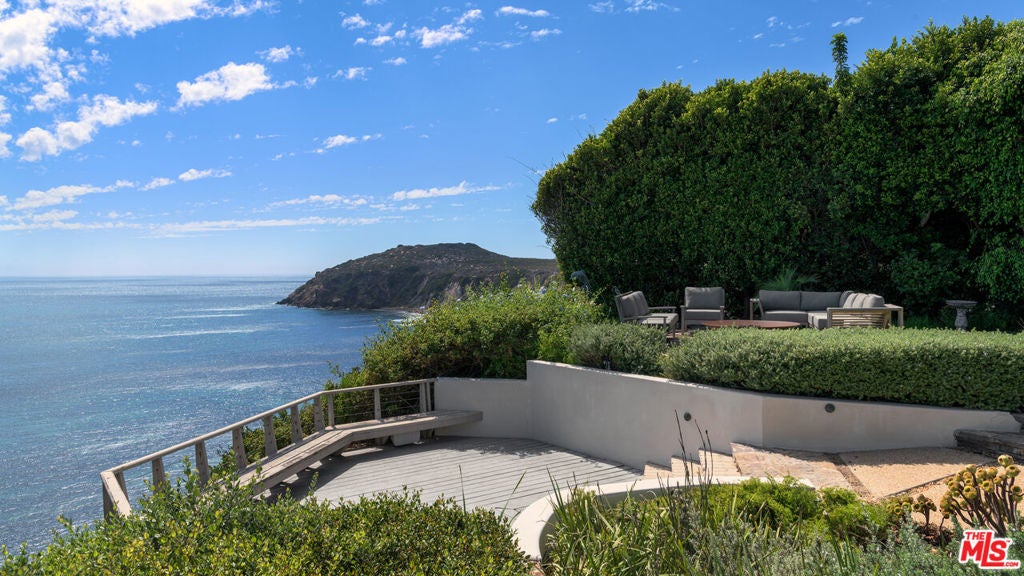 Exceptionally private and awash with natural light, this gated Point Dume blufftop estate provides over an acre of indoor-outdoor living with absolutely spectacular ocean, island, and Queen's Necklace views. Surrounded by expansive lawns and manicured landscaping, the single-level home has a large swimming pool and a huge entertaining deck overlooking the shoreline and the sea. Gracious, open interiors with high ceilings, many skylights, generous built-ins, picture windows, and wraparound walls of glass offer wonderful sight lines to the pool, gardens, and views. Furnished for elegant comfort, the main living area flows seamlessly between the large living room with a fireplace, the dining area with a tray ceiling and service bar, the spacious media room/library with a wall of book shelves, and the marvelous chef's kitchen. Equipped with top-quality appliances and an island with bar seating, the kitchen enjoys backyard, pool, and ocean views, and opens to the patio for poolside al-fresco dining. The home's four bedrooms include a private guest suite with kitchenette and bath. The primary suite is a tranquil, ocean-view retreat with a walk-in closet and an amazing spa-like bath complete with skylights, gorgeous stonework, a spectacular garden-view sauna, and enormous windows facing the pool and ocean views. In addition to the huge front lawn, with a garden bench and swing-set, the home's resort-like backyard is the perfect setting for large and small gatherings, dining, recreation, and undisturbed relaxation. With its amazing views, the backyard centers around the large waterfall pool and spa with a flagstone pool deck. There is a partially covered patio lounging area, a pergola with built-in couches, a step-up seating area with a fire pit, a barbecue, an outdoor shower, and a stunning blufftop entertaining deck with benches and views, views, views. Additional features include a mud room, a two-car garage with a washer and dryer plus an extra refrigerator and freezer, guest parking for six cars, and lifestyle amenities such as a full-house sound system and camera security, plus a coveted beach key.