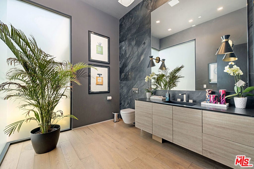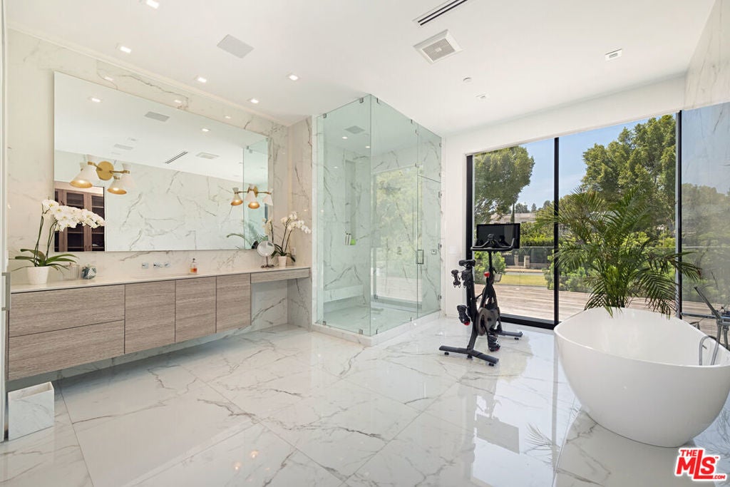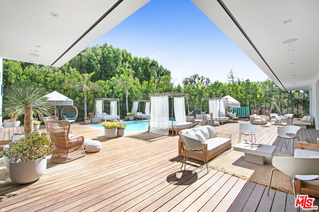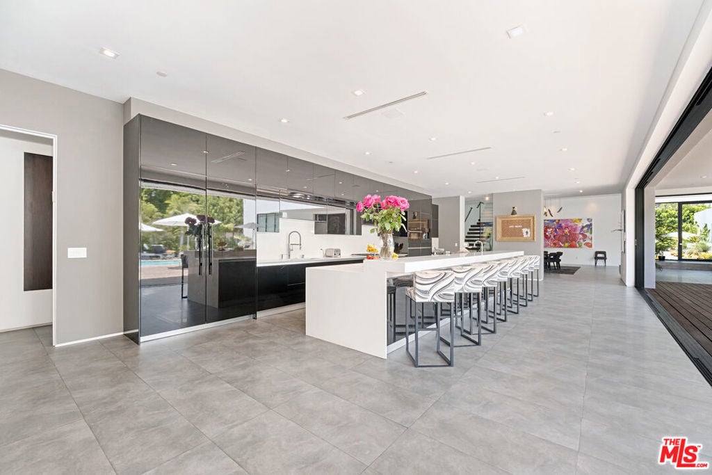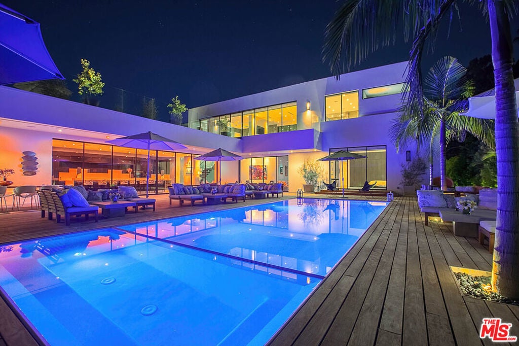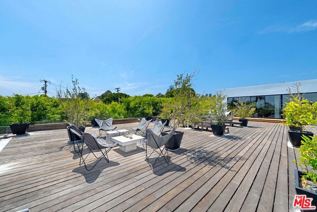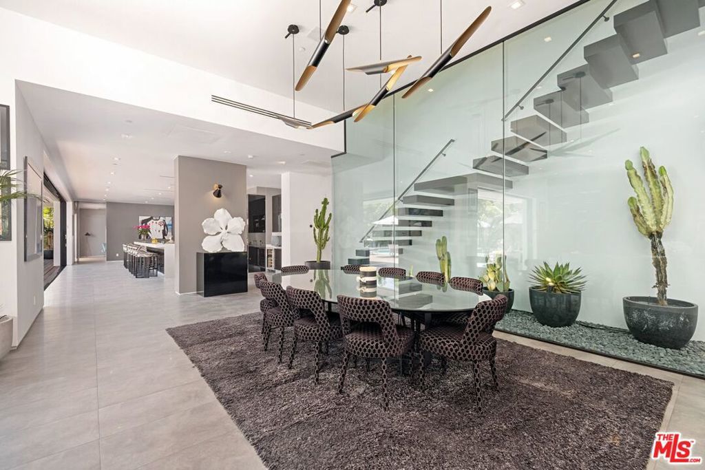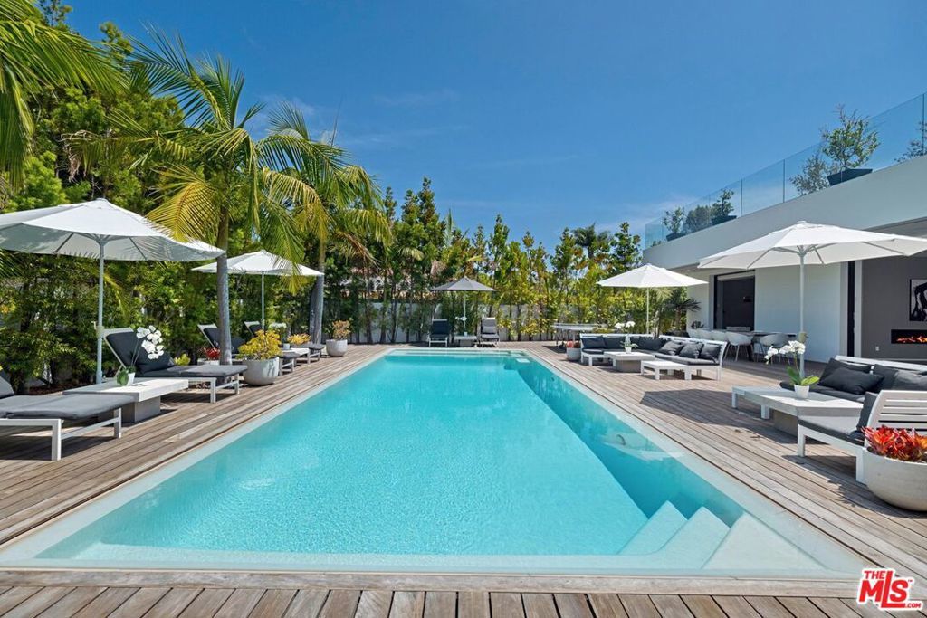 Walk through a perfectly landscaped front yard to enter an entertainer's paradise! The grand spacious floor plan offers open living & dining areas w/ high ceilings, & marble floors throughout. The staircase with glass paneling takes you up to a private master suite w/ a lounge area that features a dual sided contemporary fireplace, textured tile walls, bright hardwood floors & glass doors that guide you to a private 2,000 sqft terrace that overlooks the pool area along w/ spectacular city views. The master suite features dual bathrooms, one w/ a romantic bath tub, sliding glass doors to a large balcony, both w/ glass showers, marble walls & floors that leads to an ultra modern, avant-garde walk-in closets. The bright & light kitchen has a 15ft island w/ bar seating , w/ top of the line appliances, dual sinks, wine cooler, and floor to ceiling windows that lead to the pool area. This architectural masterpiece is perfect for enjoying the Beverly Hills lifestyle!