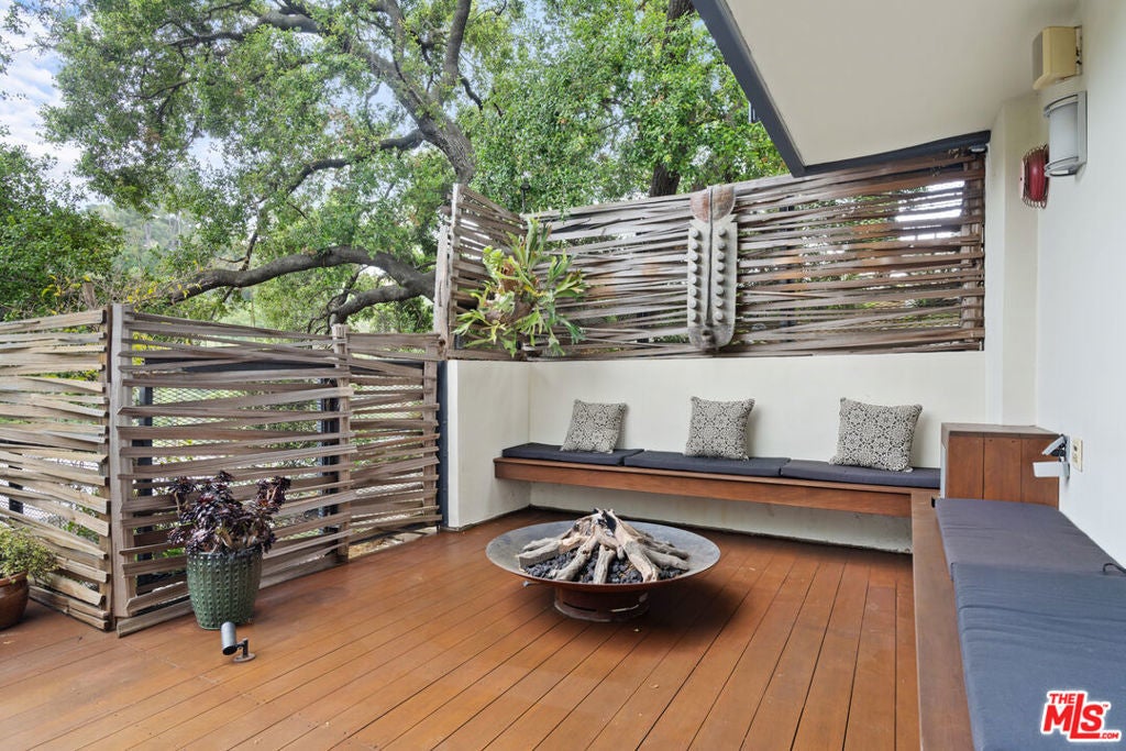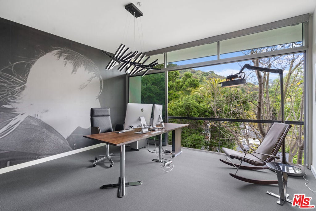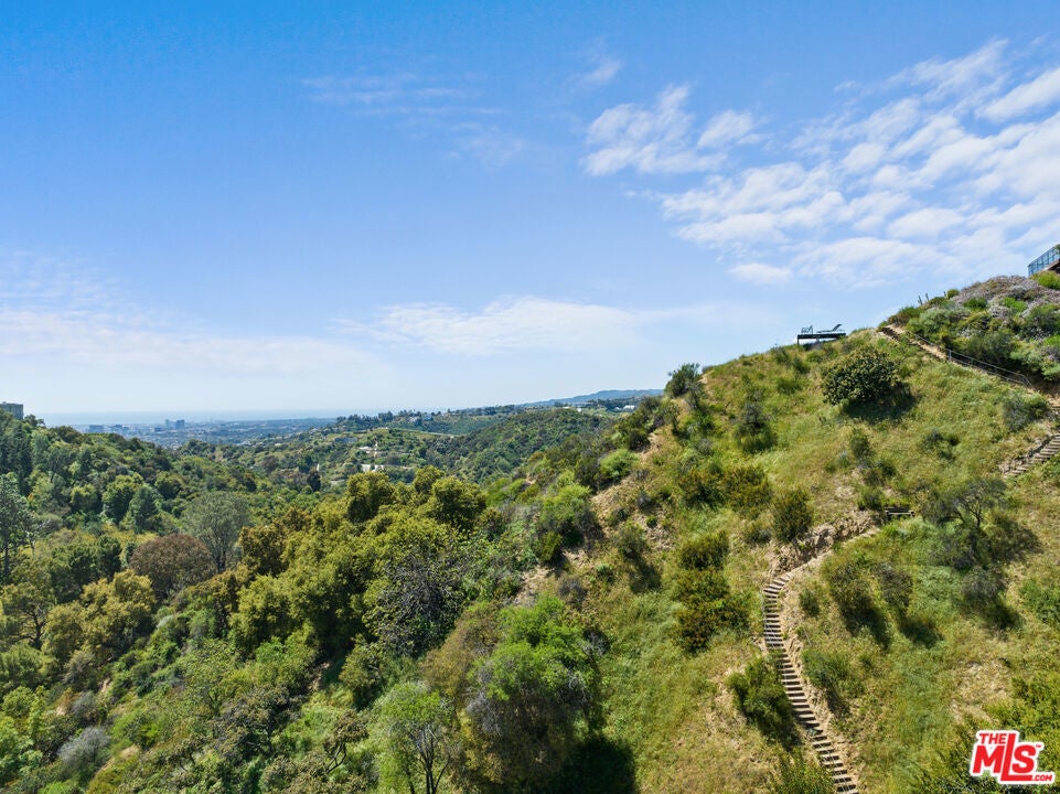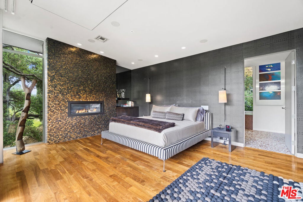 This secluded modern residence, crafted by renowned architect Steven Ehrlich after time spent in Africa with interiors by Mark Brunetz, offers unparalleled privacy at the end of a gated long driveway while surrounded by lush greenery. Floor-to-ceiling windows flood the living spaces with natural light and treetop views of the surrounding hills. The main level features a grand living room with a magnificent Murano glass chandelier, a functional fireplace, a massive family room with an adjacent crocodile leather imprint walled powder room, and a formal dining room. The custom kitchen boasts top-of-the-line Miele stainless steel appliances, Gaggenau and Fisher & Paykel, and an oversized island for casual dining. Additionally, the residence features a motorcourt for convenient parking and easy access to the home. Upstairs, the primary suite offers automatic shades along with blackout curtains, a TV that elegantly descends from the ceiling, as well as a walk-in closet with built-in walls. A spa-like en-suite bathroom adjoins with exquisite Bisazza tilework which cascades from light to dark as you walk through the room, plus a spa bathtub, steam shower and an in-wall Ariston espresso maker. The outdoor space includes a heated spa and pool with outdoor entertaining areas and a viewing deck that offers panoramic views from the top of the hill behind the home connected by a charming staircase. Three guest bedrooms, one with an en-suite bath, provide ample accommodation, while the additional guest bedrooms share a bathroom complete with both a shower and a bathtub. Underneath, a versatile space awaits, with a room equipped with a bathroom and shower which has easy access to the pool and can serve as a workout room or workplace. With meticulous attention to detail and modern conveniences throughout, this exceptional residence epitomizes luxury living in a serene oasis.