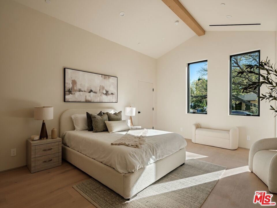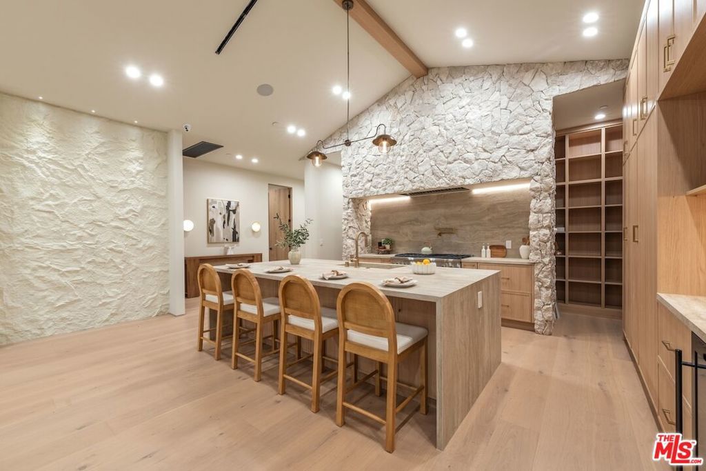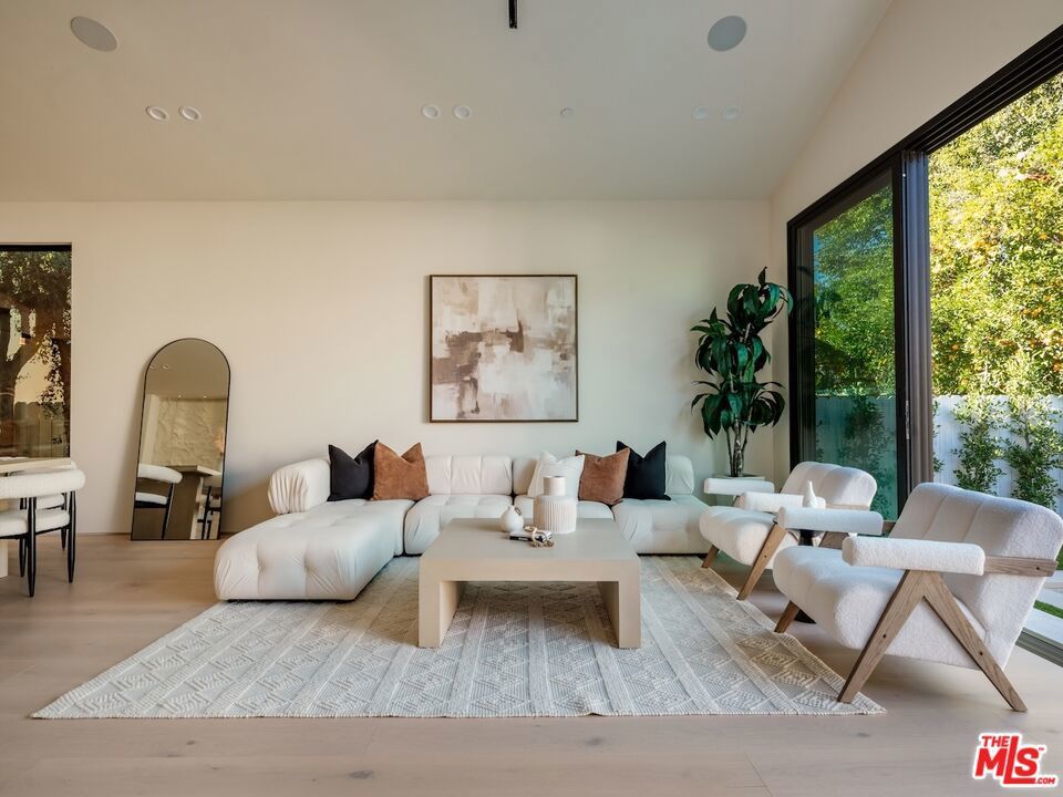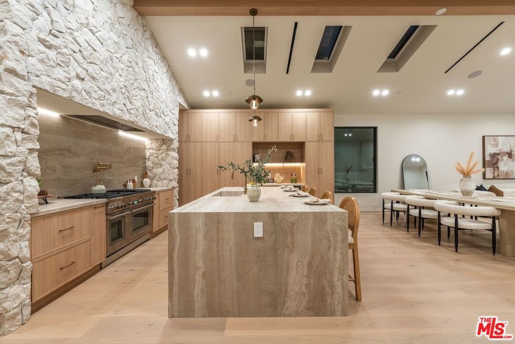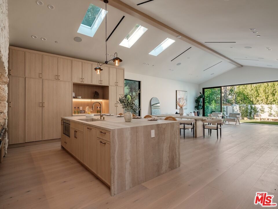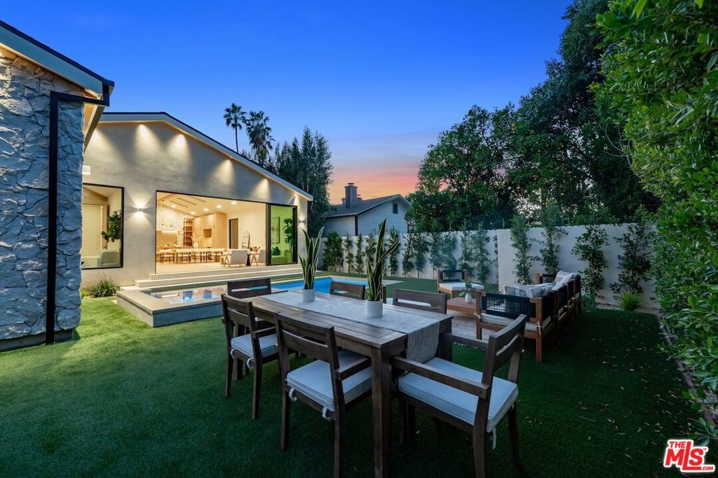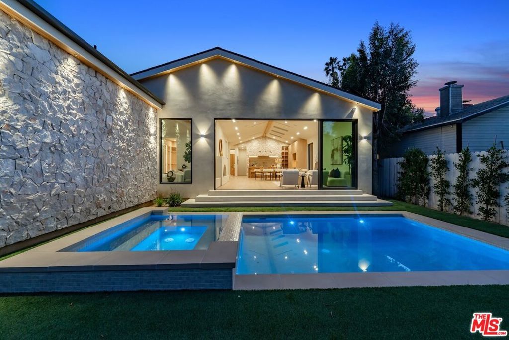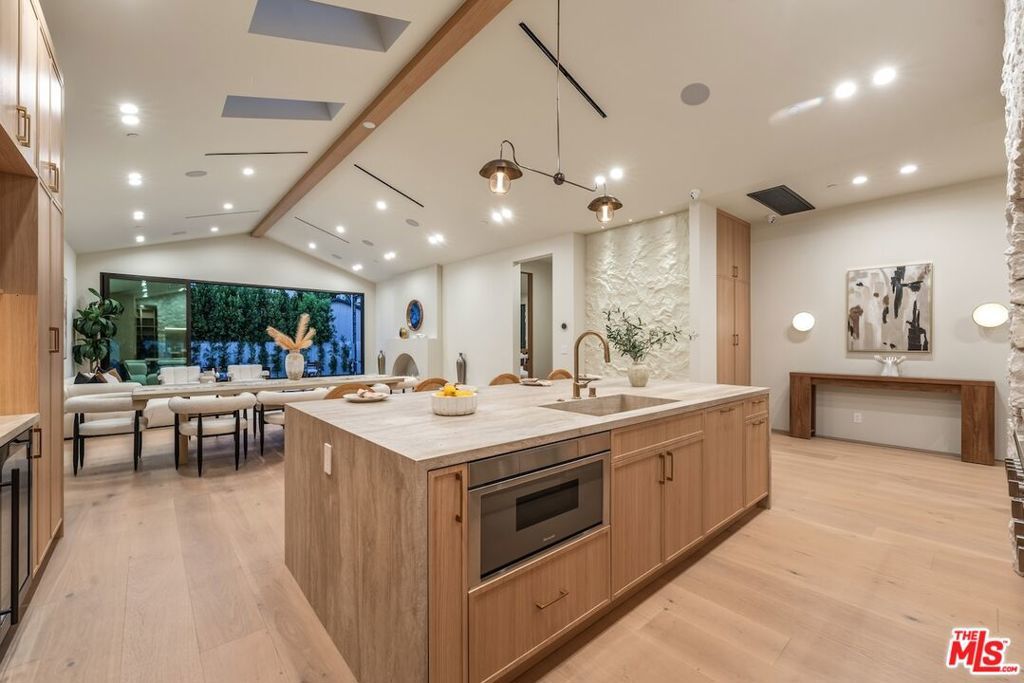 Architectural Organic-Modern Residence with Pool & Private ADU | Sherman Oaks. Tucked away on a quiet residential street, this newly constructed architectural home is a masterclass in organic-modern design, blending warm natural materials with refined contemporary lines. The main residence offers 3 bedrooms and 3.5 bathrooms, thoughtfully curated for effortless California living. Vaulted ceilings with exposed beams, skylights, and expansive walls of glass flood the interiors with natural light, while wide-plank hardwood floors and custom millwork create a calm, elevated aesthetic throughout. The open-concept living and dining areas seamlessly connect to the outdoors through oversized sliding glass doors, creating a true indoor-outdoor lifestyle. At the heart of the home, the chef's kitchen stuns with an oversized natural stone island, custom light-oak cabinetry, designer brass fixtures, and a sculptural stone hood framing the professional-grade range. Integrated appliances, abundant storage, and architectural details make this space as functional as it is beautiful. The primary suite is a private retreat, featuring vaulted ceilings, serene garden views, and a spa-like ensuite with a double vanity, custom cabinetry, and a glass-enclosed walk-in shower. A thoughtfully designed walk-in closet completes the suite with both style and practicality . Step outside to a private resort-style backyard, where a sparkling pool, lush landscaping, and multiple lounging areas create an intimate setting for entertaining or quiet relaxationperfectly framed by the home's clean architectural lines. An attached, fully permitted 1-bedroom, 1-bathroom ADU includes a private entrance, separate address, and individual water and electric meters, offering exceptional flexibility for extended family, guests, or rental income. Finished with designer lighting, custom stonework, energy-efficient upgrades, and timeless materials throughout, this turnkey property delivers architectural sophistication, lifestyle versatility, and long-term value, all just moments from top-rated schools, dining, shopping, and major commuter routes.