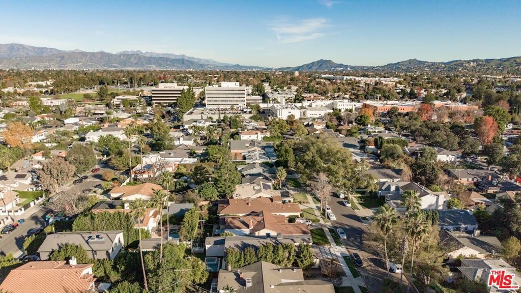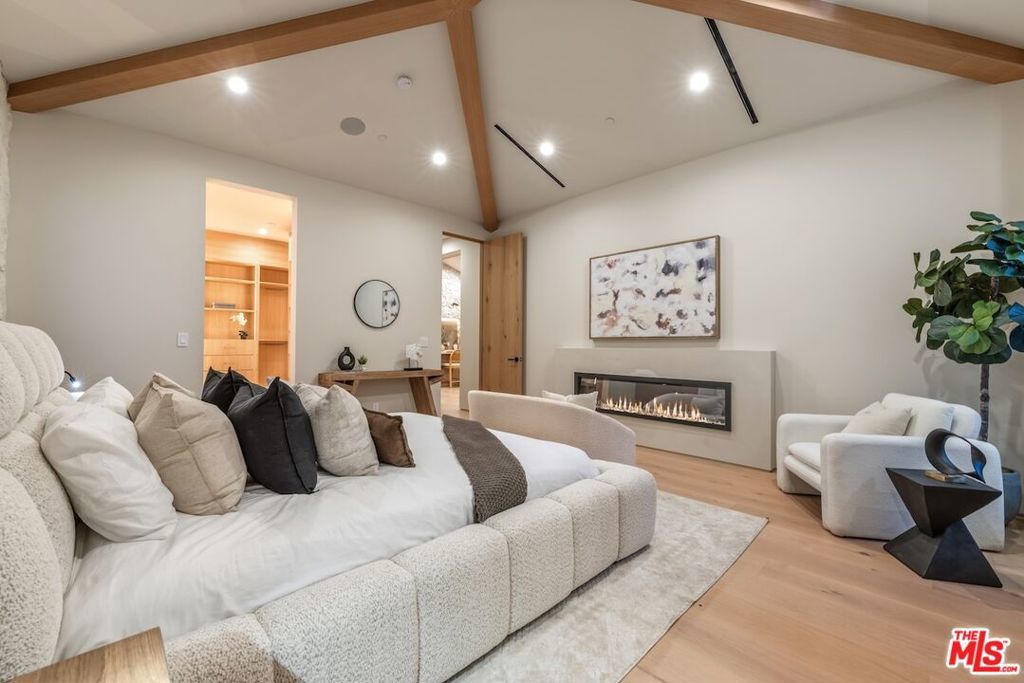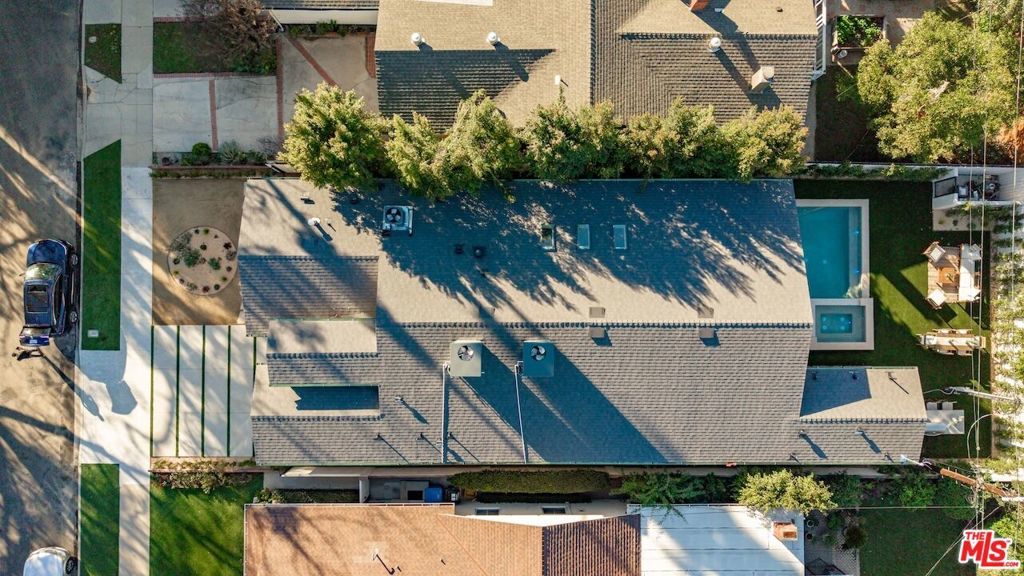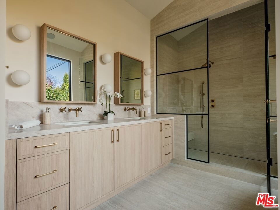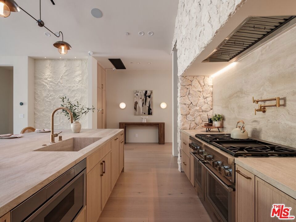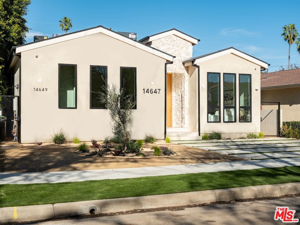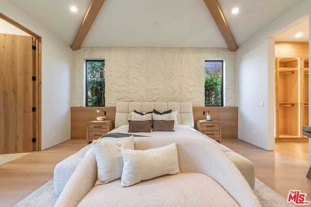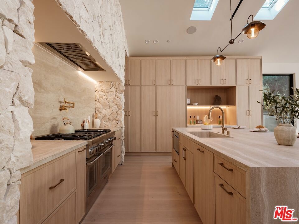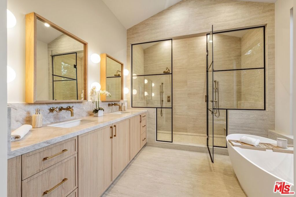 Architectural Organic-Modern Residence with Pool & Private ADU | Sherman Oaks. Tucked away on a quiet residential street, this newly constructed architectural home is a masterclass in organic-modern design, blending warm natural materials with refined contemporary lines. The main residence offers 3 bedrooms and 3.5 bathrooms, thoughtfully curated for effortless California living. Vaulted ceilings with exposed beams, skylights, and expansive walls of glass flood the interiors with natural light, while wide-plank hardwood floors and custom millwork create a calm, elevated aesthetic throughout. The open-concept living and dining areas seamlessly connect to the outdoors through oversized sliding glass doors, creating a true indoor-outdoor lifestyle. At the heart of the home, the chef's kitchen stuns with an oversized natural stone island, custom light-oak cabinetry, designer brass fixtures, and a sculptural stone hood framing the professional-grade range. Integrated appliances, abundant storage, and architectural details make this space as functional as it is beautiful. The primary suite is a private retreat, featuring vaulted ceilings, serene garden views, and a spa-like ensuite with a double vanity, custom cabinetry, and a glass-enclosed walk-in shower. A thoughtfully designed walk-in closet completes the suite with both style and practicality . Step outside to a private resort-style backyard, where a sparkling pool, lush landscaping, and multiple lounging areas create an intimate setting for entertaining or quiet relaxationperfectly framed by the home's clean architectural lines. An attached, fully permitted 1-bedroom, 1-bathroom ADU includes a private entrance, separate address, and individual water and electric meters, offering exceptional flexibility for extended family, guests, or rental income. Finished with designer lighting, custom stonework, energy-efficient upgrades, and timeless materials throughout, this turnkey property delivers architectural sophistication, lifestyle versatility, and long-term value, all just moments from top-rated schools, dining, shopping, and major commuter routes.