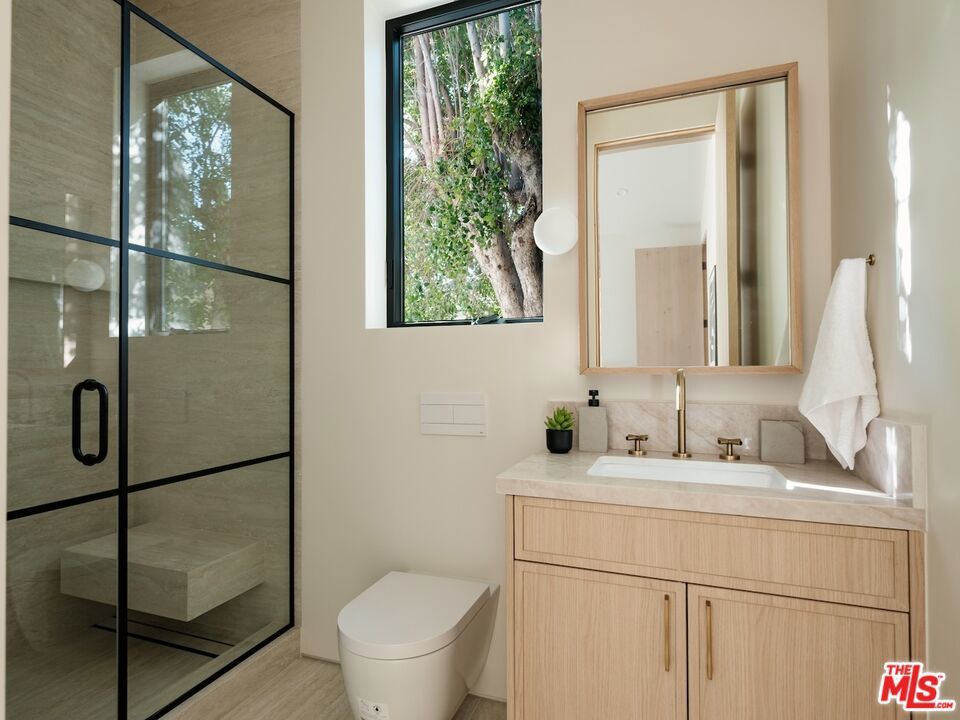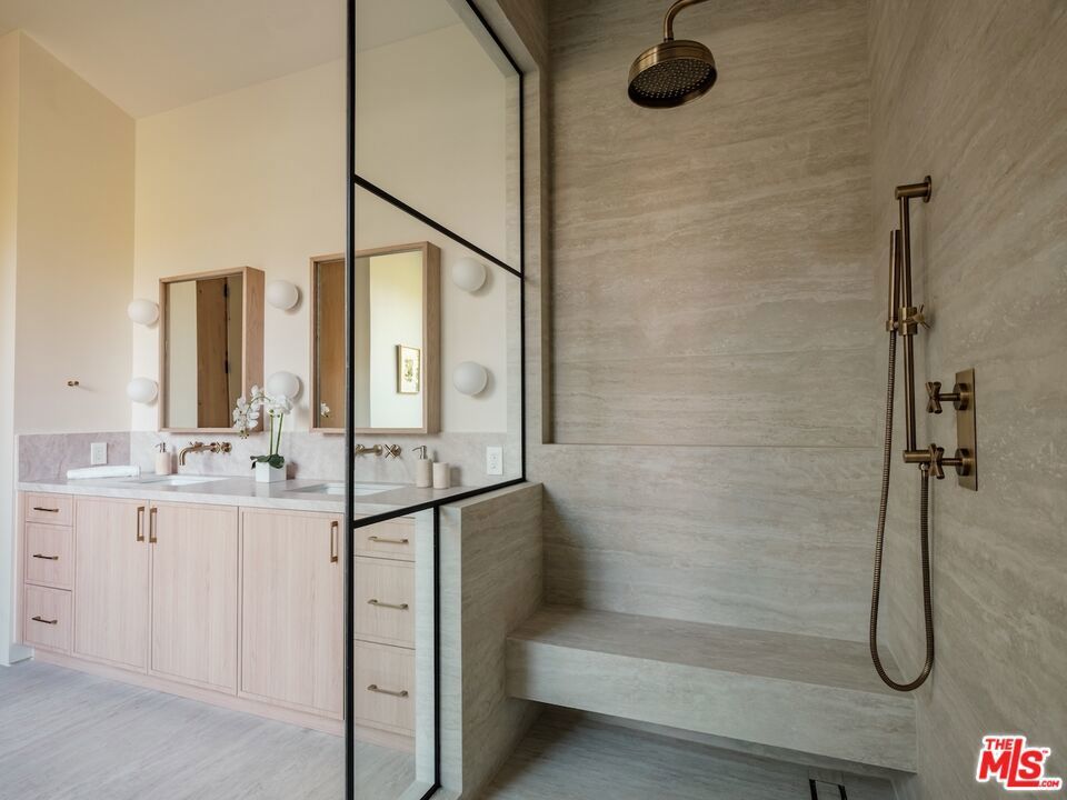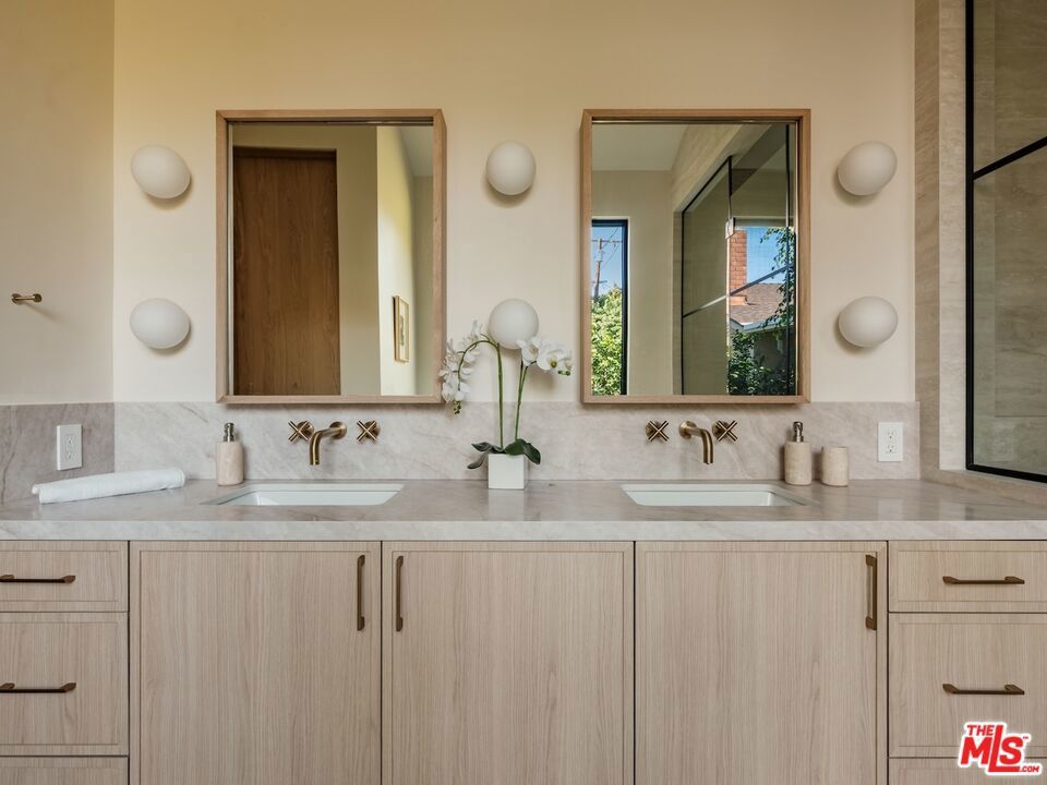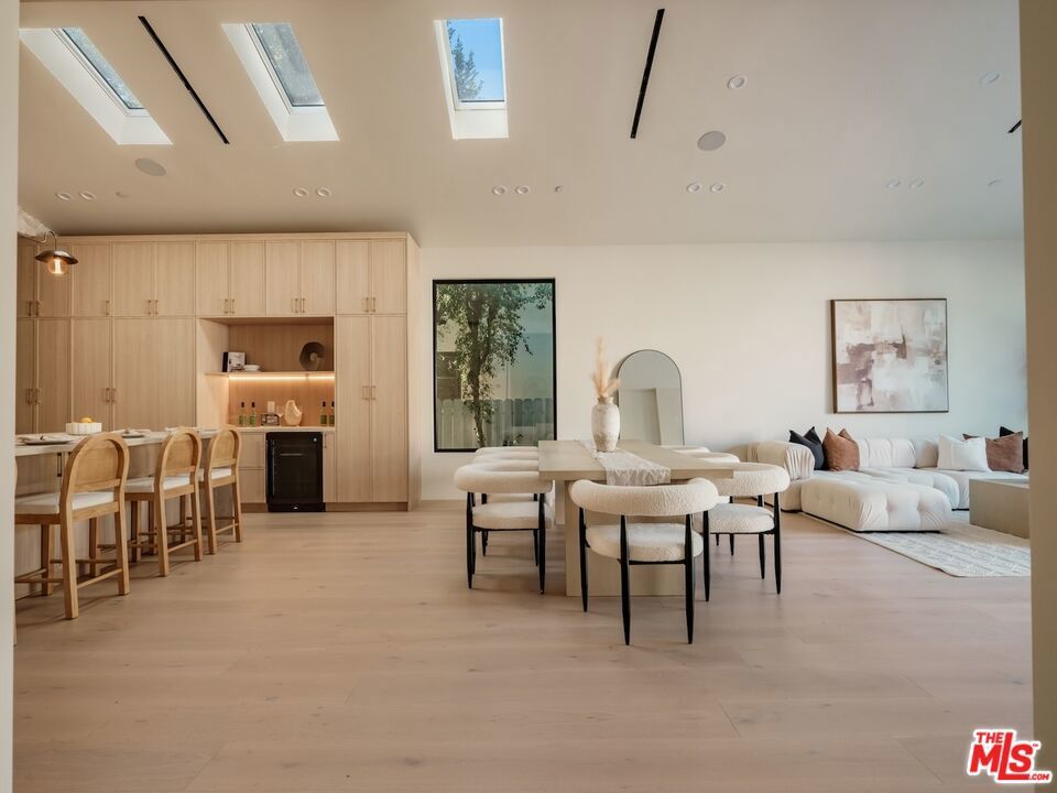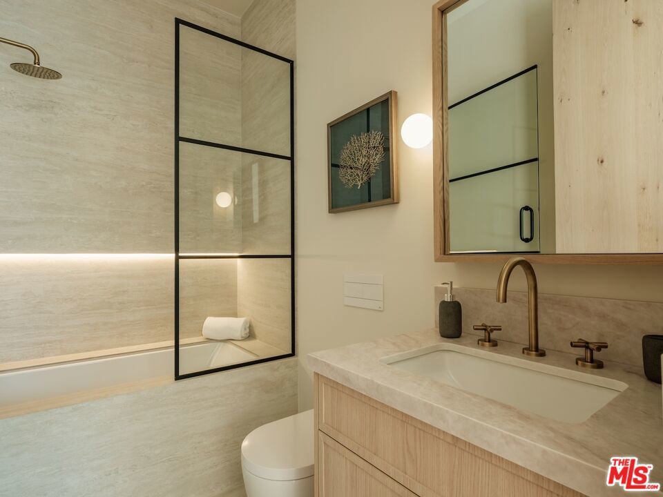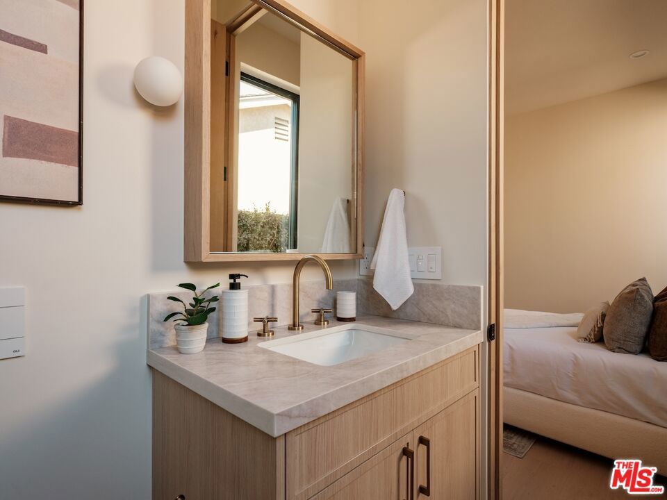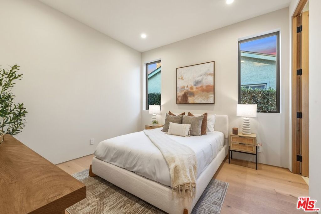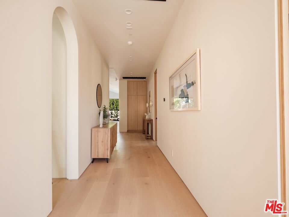 Architectural Organic-Modern Residence with Pool & Private ADU | Sherman Oaks. Tucked away on a quiet residential street, this newly constructed architectural home is a masterclass in organic-modern design, blending warm natural materials with refined contemporary lines. The main residence offers 3 bedrooms and 3.5 bathrooms, thoughtfully curated for effortless California living. Vaulted ceilings with exposed beams, skylights, and expansive walls of glass flood the interiors with natural light, while wide-plank hardwood floors and custom millwork create a calm, elevated aesthetic throughout. The open-concept living and dining areas seamlessly connect to the outdoors through oversized sliding glass doors, creating a true indoor-outdoor lifestyle. At the heart of the home, the chef's kitchen stuns with an oversized natural stone island, custom light-oak cabinetry, designer brass fixtures, and a sculptural stone hood framing the professional-grade range. Integrated appliances, abundant storage, and architectural details make this space as functional as it is beautiful. The primary suite is a private retreat, featuring vaulted ceilings, serene garden views, and a spa-like ensuite with a double vanity, custom cabinetry, and a glass-enclosed walk-in shower. A thoughtfully designed walk-in closet completes the suite with both style and practicality . Step outside to a private resort-style backyard, where a sparkling pool, lush landscaping, and multiple lounging areas create an intimate setting for entertaining or quiet relaxationperfectly framed by the home's clean architectural lines. An attached, fully permitted 1-bedroom, 1-bathroom ADU includes a private entrance, separate address, and individual water and electric meters, offering exceptional flexibility for extended family, guests, or rental income. Finished with designer lighting, custom stonework, energy-efficient upgrades, and timeless materials throughout, this turnkey property delivers architectural sophistication, lifestyle versatility, and long-term value, all just moments from top-rated schools, dining, shopping, and major commuter routes.