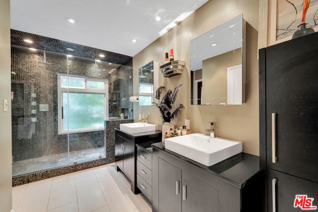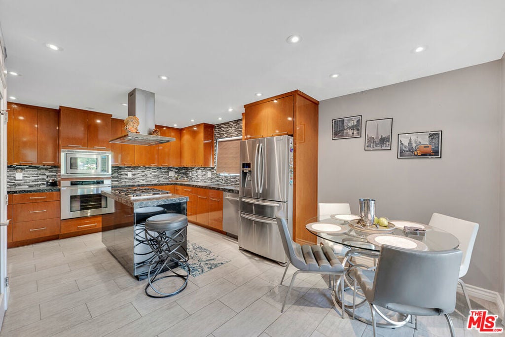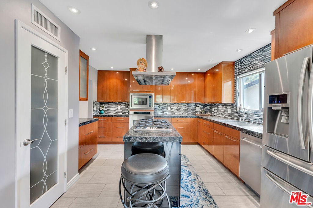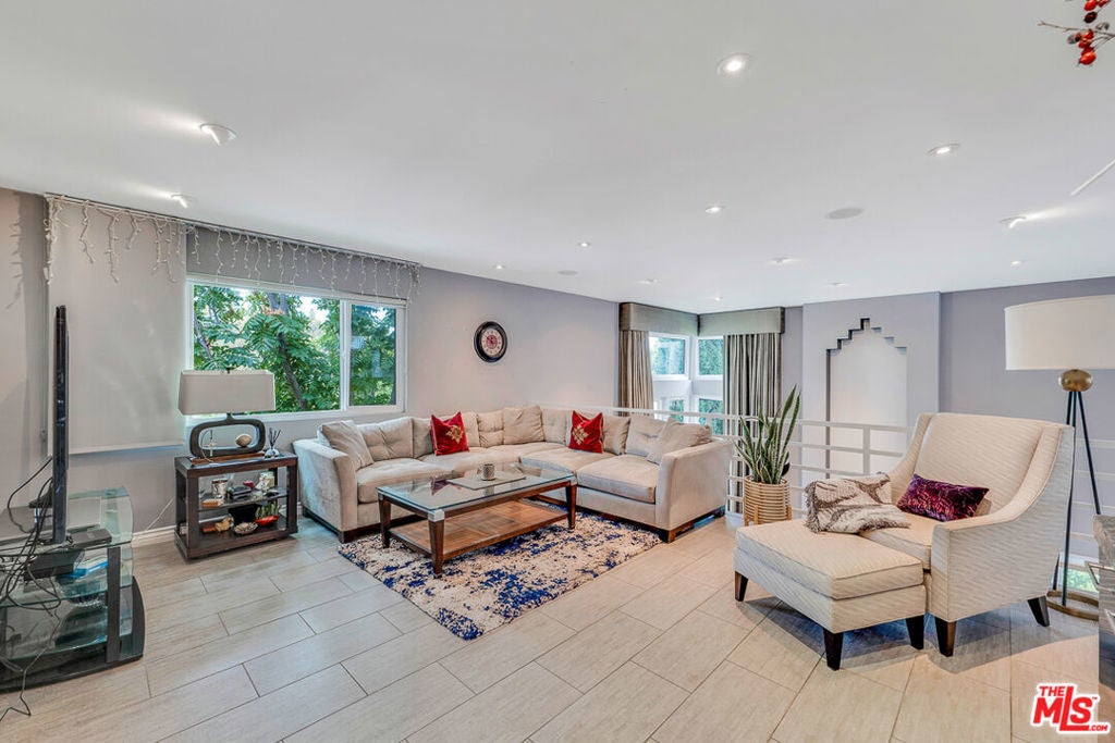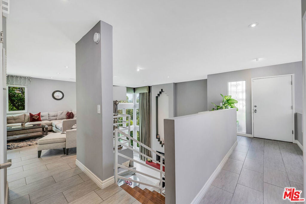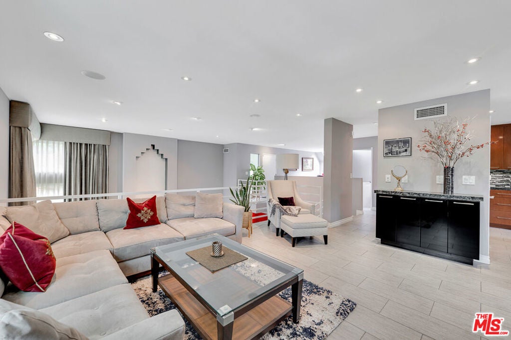 Nestled south of Ventura Boulevard in the highly coveted Sherman Oaks neighborhood, this move-in-ready home offers an exquisite blend of style, comfort, and breathtaking hillside views. Every corner of this residence has been thoughtfully designed to elevate your living experience. On the top floor, a sun-drenched dining room takes center stage, framed by floor-to-ceiling skylight windows that flood the space with natural light which creates a perfect space for memorable meals with loved ones. The chef's kitchen is a culinary dream, boasting premium appliances, a generous center island with a six-burner stove, and abundant storage and walk-in pantry. Step onto the spacious balcony, where your mornings will begin with a cup of coffee and panoramic views that embrace the home. The lower level impresses with dramatic two-story vaulted ceilings and a dedicated living area tailor-made for entertaining. Complete with a stylish bar, wine fridge, and a cozy fireplace, it's the perfect setting for hosting guests or enjoying relaxed evenings. All three bedrooms are conveniently located on a lower level. The primary suite is a retreat unto itself, offering a refined ensuite bathroom with a double vanity, two closets including a walk-in, and a luxurious walk-in shower with a waterfall showerhead and striking black tile design. The second bedroom features a walk-in closet and an elegant ensuite bathroom with a sizable walk-in shower. Third bedroom is just as specious. Outside, the charm continues with a private yard oasis, ideal for weekend barbecues and unwinding amidst the tranquil hillside scenery. Located mere moments from Sherman Oaks' vibrant restaurants, trendy bars, boutique shopping, entertainment, and a top-rated charter school, this home combines unparalleled convenience with the allure of scenic living. Don't miss the chance to make this exceptional property your home! The property now features different furniture.