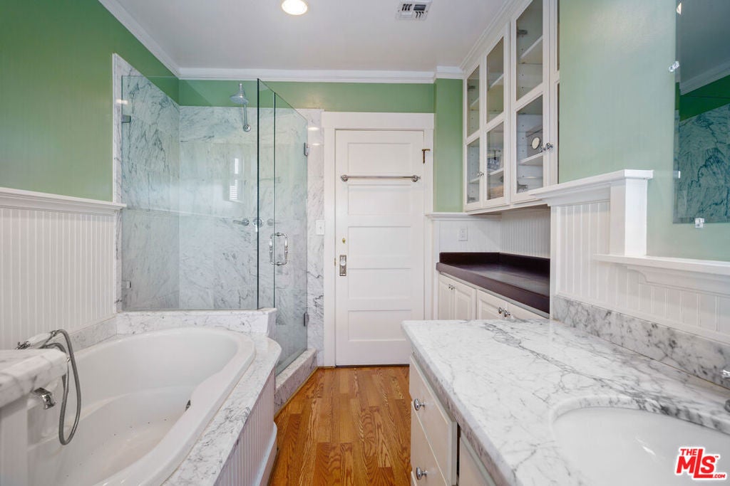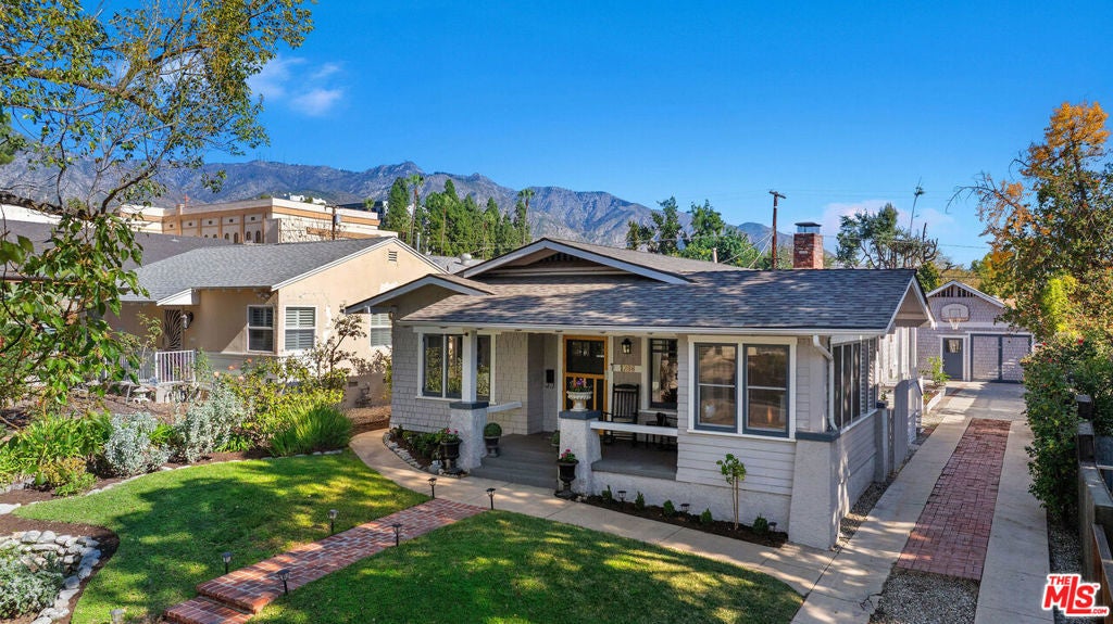 Brigden Ranch Craftsman full of charm and warmth, ideally located on a serene, tree-lined street framed by the San Gabriel Mountains. This 4-bedroom, 2-bath home blends enduring character with thoughtful modern upgrades. An inviting covered front porch sets the tone, leading into a warm and welcoming living room featuring a classic brick fireplace, refinished oak hardwood floors, crown molding, and abundant natural light. The floor plan flows seamlessly into a formal dining room with original built-ins and a remodeled gourmet kitchen showcasing white cabinetry, granite countertops, stainless-steel appliances, and a custom banquette. A private and extraordinary study off the living room, flooded with sunlight, creates the ideal home office. The primary bedroom offers a walk-in closet and a beautifully updated bath with designer finishes. Three additional bright secondary bedrooms and a stylish guest bath with Carrera marble, an oversized jetted Whirlpool tub, modern shower complete the interior, and a whole-house fan provides efficient cooling for comfortable summer living throughout the home. The rear covered patio features a built-in misting system that overlooks a lush, private, fenced backyard with citrus trees and mountain views, creating an ideal setting for both entertaining and relaxing. The property also offers abundant storage, a LifeSource water filtration system, and a flourishing vegetable garden. The rear garage provides approximately 450 sq. ft. of finished space with even more storage. Enjoy close proximity to Lavender & Honey, Millie's Cafe, Woon, Bacchus, Italian Deli Co., Bloomfield Creamery, Connal's, 786 Degrees Pizza, Deluxe 1717, and other local favorites, along with easy access to EF International Language Campus, Huntington Library, Old Town, South Lake Ave, Paseo, Rose Bowl, Hastings Ranch, and the 210/134 freeways. This special home is an eternal gem in a fantastic location, close to all that Pasadena has to offer.