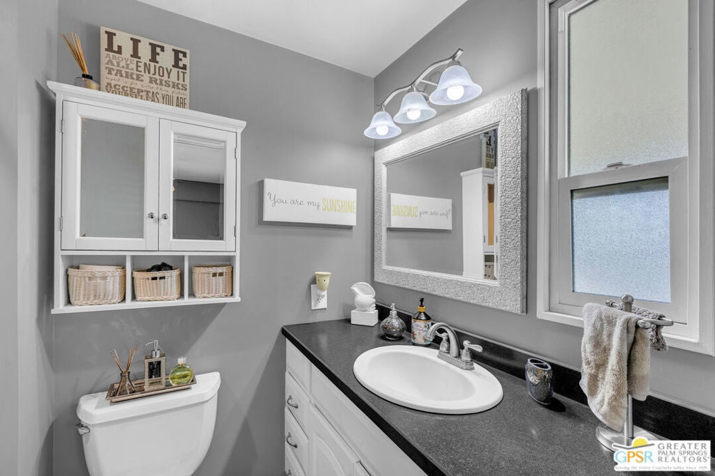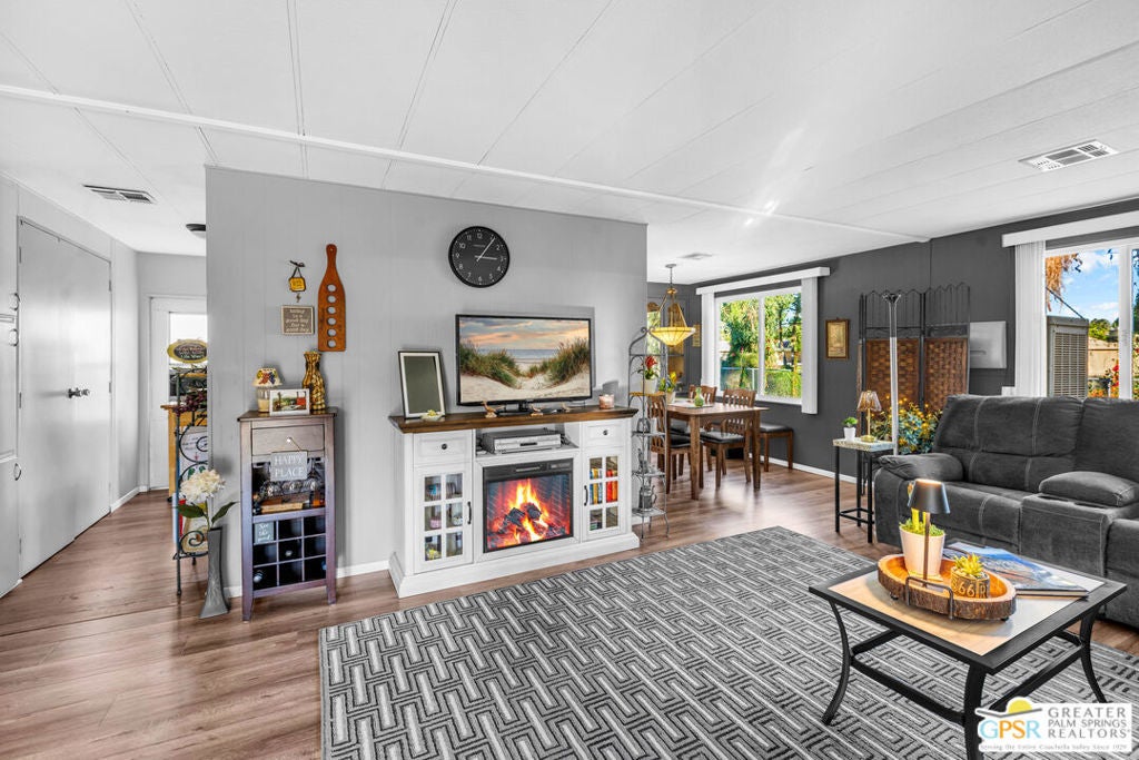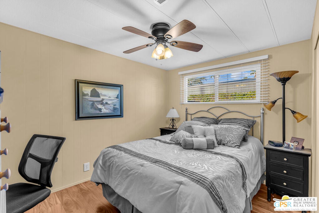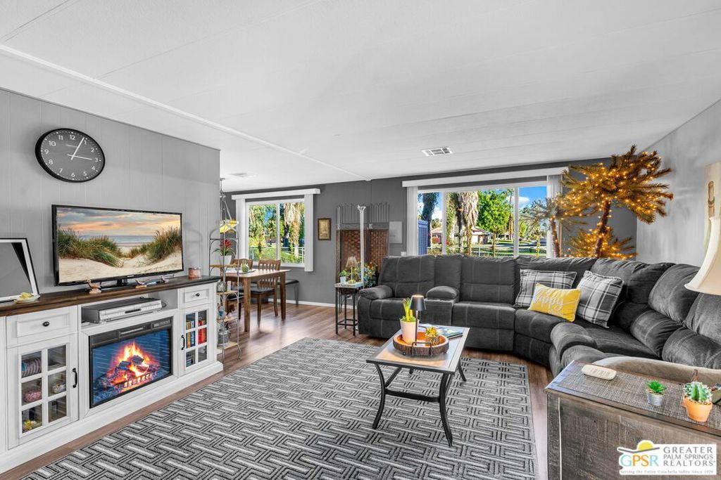 Stylish Traditional Home in Tramview Mobile Home Park. Tucked away on one of the most desirable streets in Tramview Mobile Home Park, this upgraded and well-kept 2-bedroom, 2-bath home offers a serene desert retreat with exceptional charm. Located toward the quiet back end of the community, the property enjoys peaceful surroundings, beautifully maintained landscaping, and paved walkways all framed by sweeping mountain views and vistas overlooking Cathedral Canyon Country Club. Inside, the home features updated bathrooms and a refreshed kitchen, complemented by laminated hardwood floors that add warmth and modern appeal. The standout feature is the expansive two-level, covered outdoor deck, an ideal space for relaxing, dining, or entertaining year-round. Comfort is ensured with central air conditioning and thoughtful amenities throughout, making this an excellent choice for full-time living or a perfect desert getaway. Residents enjoy access to the community clubhouse, ground-level pool, and spa, all included in the HOA. Please note that all future residents must be approved by park management. A clean, contemporary home in a peaceful setting this is low-maintenance desert living at its best. Residents enjoy a beautifully maintained community featuring a large swimming pool and spa, along with a clubhouse designed for entertaining, complete with two full kitchens, a piano, pool table, and multiple card tables for owners' use. Ideally located near Target, Trader Joe's, and Starbucks, with Palm Springs International Airport and Downtown Palm Springs just a short drive away, offering effortless access to shopping, dining, and travel.