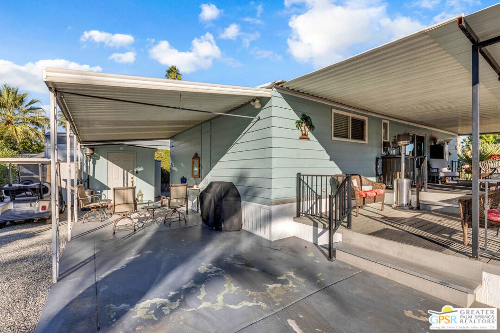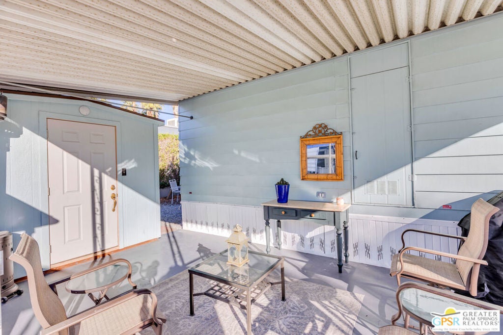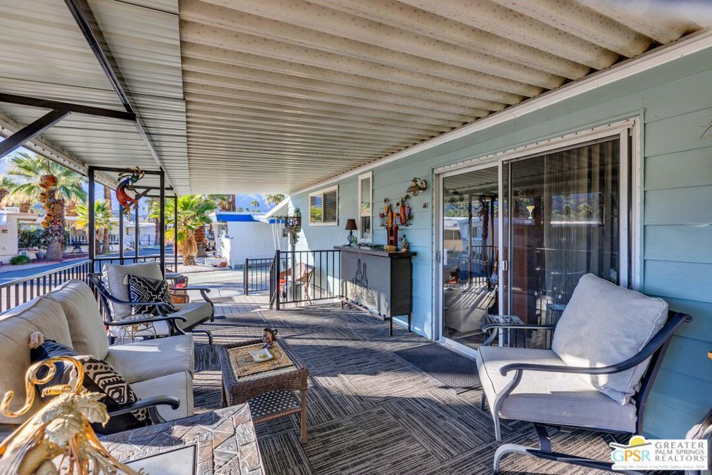 Stylish Traditional Home in TramView Mobile Home Park. Tucked away on one of the most desirable streets in TramView Mobile Home Park, this upgraded and well-kept 2-bedroom, 2-bath home offers a serene desert retreat with exceptional charm. Located toward the quiet back end of the community, the property enjoys peaceful surroundings, beautifully maintained landscaping, and paved walkways all framed by sweeping mountain views and vistas overlooking Cathedral Canyon Country Club. Inside, the home features updated bathrooms and a refreshed kitchen, complemented by laminated hardwood floors that add warmth and modern appeal. The standout feature is the expansive two-level, covered outdoor deck, an ideal space for relaxing, dining, or entertaining year-round. Comfort is ensured with central air conditioning and thoughtful amenities throughout, making this an excellent choice for full-time living or a perfect desert getaway. Residents enjoy access to the community clubhouse, ground-level pool and spa, shuffleboard courts, all included in the HOA. Please note that all future residents must be approved by park management. The large clubhouse is designed for entertaining, complete with two full kitchens, a piano, pool table, and multiple card tables for owners' use. Ideally located near Target, Trader Joe's, and Starbucks, with Palm Springs International Airport and Downtown Palm Springs just a short drive away, offering effortless access to shopping, dining, and travel. A clean, contemporary home in a peaceful setting this is low-maintenance desert living at its best. PLEASE NOTE: This community is undergoing a conversion of gas and electric utility so that each home will be connected directly to SoCal Electric and SC Gas which will greatly improve the living experience here at TramView. The Sellers are offering an incentive of 12 months of paid lease payments to mitigate any inconvenience during the construction. All of the amenities with none of the cost for one year! This unit should not be missed! Call LA1 for an appointment to view.