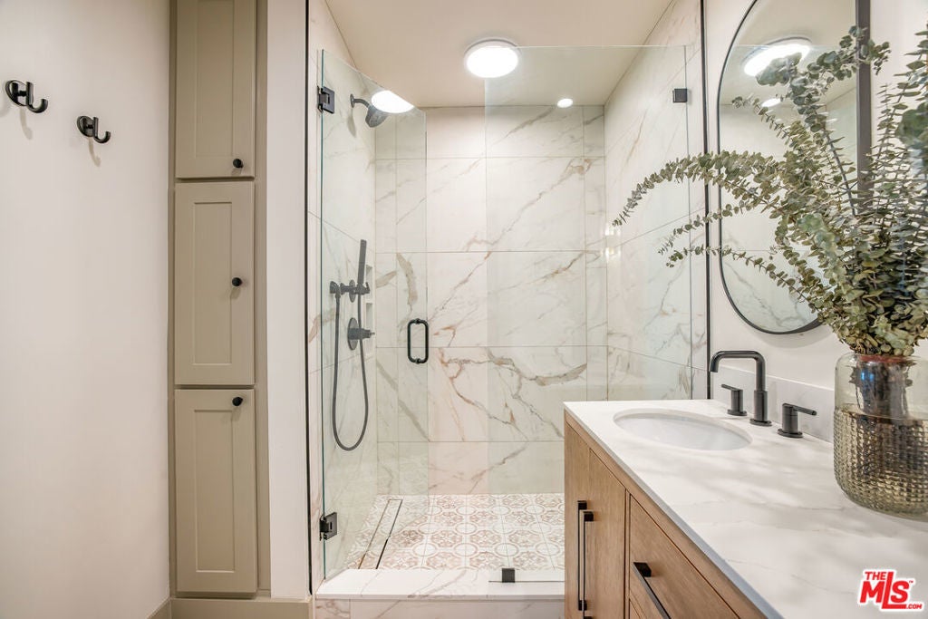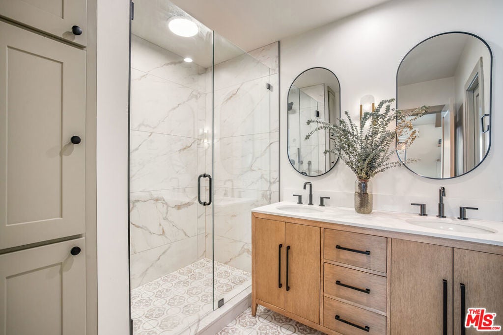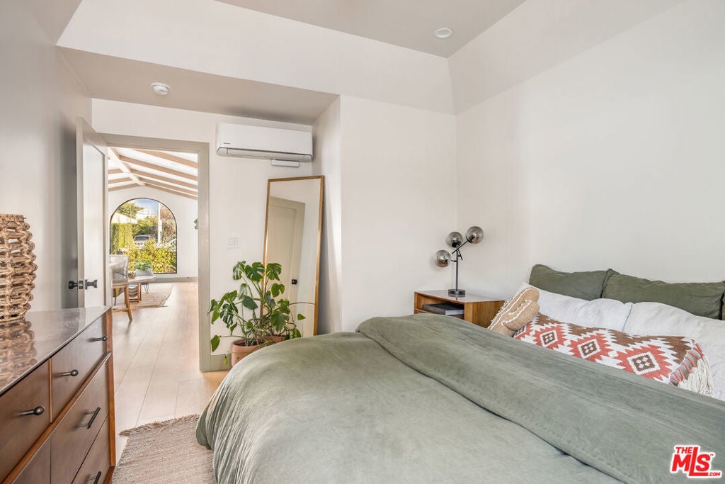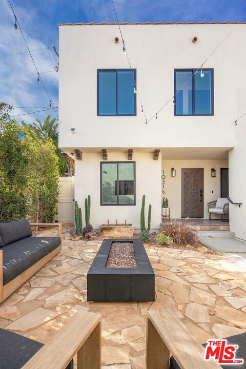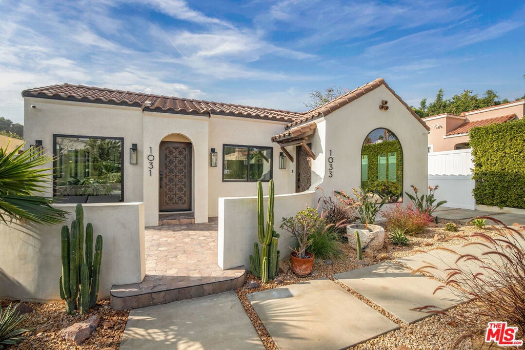 Welcome to Villa Galicia, a beautiful new construction, modern Spanish-style villas offering the perfect blend of luxury, Spanish design and privacy. This two-bedroom, one- bathroom gem is located in the front house duplex. Villa Galicia is the first of an exclusive new development of four resort-style villas being offered for lease. Each villa boasts impeccable finishes and thoughtful design details, giving each villa unique and individual charm, yet cohesive flow. Villa 1033 features a spacious, open-concept living area that seamlessly connects the kitchen, dining, and living spaces. Immediately you will be greeted with tall vaulted ceilings throughout with white oak beams. The dining area hosts a large island with counter seating and ample storage and the restored original built in china cabinet. The open concept kitchen is equipped with high-end Samsung appliances including a gas range with air-fry capabilities, a French door refrigerator with cube and nugget ice, and a purified water pitcher. The kitchen also offers ample storage. The living room is a true focal point, showcasing an oversized Spanish-style arched picture window with Spanish style fireplace that adds warmth and ambiance. Enjoy cinematic entertainment with the Samsung Frame TV and Sonos sound system, perfect for movie nights or unwinding after a long day. Both bedrooms are generously sized with walk in closets. The large central bathroom features a private water closet, large double vanity, marble sconce, linen closet, and an oversized luxurious shower with a tiled trench drain for a spa-like experience. The villa is equipped with smart home features, including Schlage electronic deadbolts for keyless entry that can be unlocked from smart phone, app, or Apple Watch. A LG washer and dryer tower is strategically located by the back door with ample storage surrounding it. Step outside onto your private front porch with traditional Spanish tile. It's the perfect spot for morning coffee or evening cocktails, offering a serene retreat in the comfort of your own home. The expansive backyard is perfect for outdoor living, featuring West Elm outdoor furniture, a gas fire pit, and a Blackstone grill all for common use. It's an ideal space for entertaining guests or simply relaxing and enjoying the beautiful surroundings. Villa Galicia offers the ultimate resort-style living with modern comforts and unparalleled privacy, making it the perfect home for those seeking both luxury and convenience in one of West Hollywood's most desirable locations, walking distance to many shops, restaurants and new Erewhon opening.