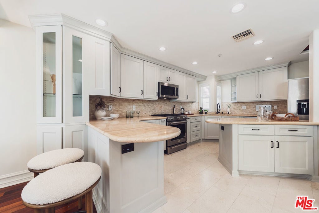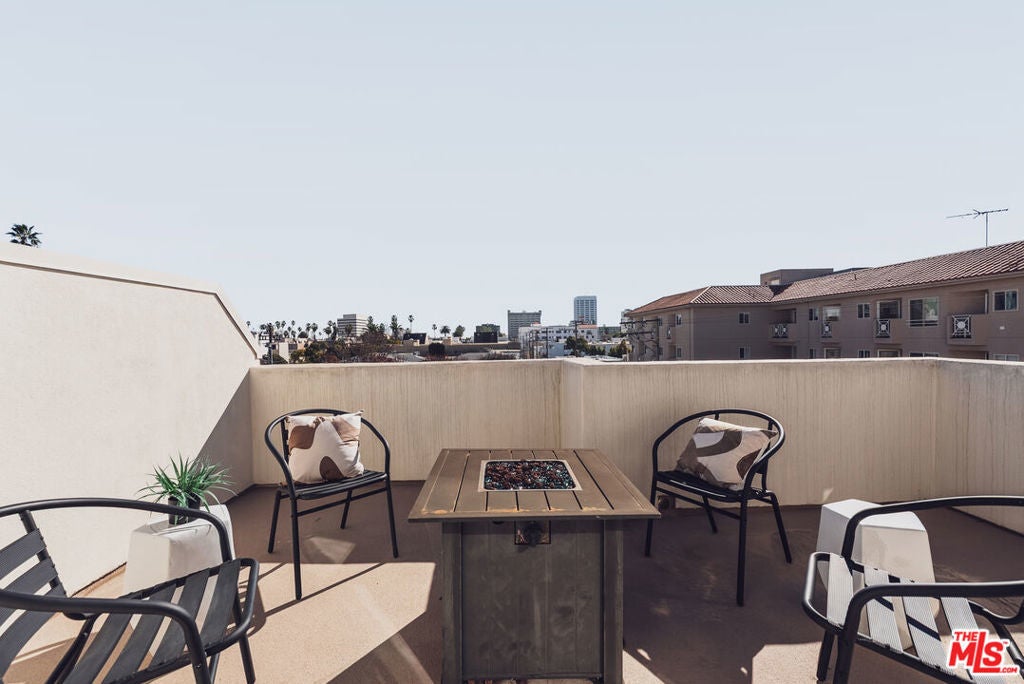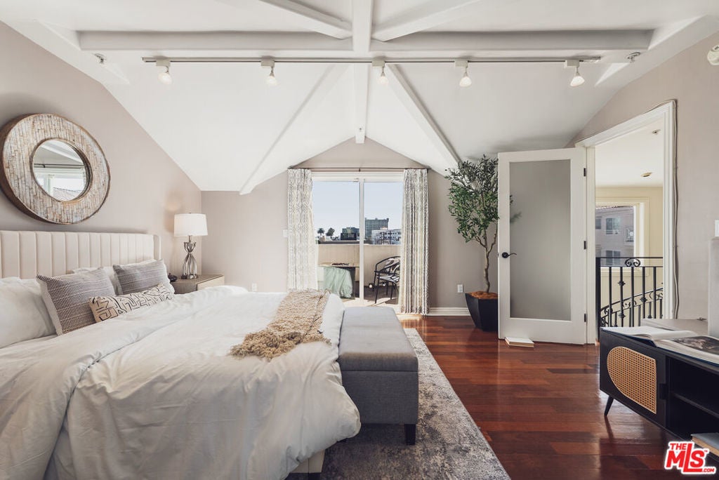 Located just moments from the ocean, Palisades Park, Montana Avenue, and the 3rd Street Promenade, this move-in-ready Santa Monica townhome offers the privacy and feel of a single-family residence within an exclusive five-unit gated community. The spacious 3-bedroom plus loft, 3-bath layout features a dramatic light-filled living room with soaring 20-foot ceilings, a double-sided fireplace, and hardwood flooring throughout. The recently remodeled chef's kitchen includes stainless steel appliances, wine refrigerator, stone countertops, center island, and opens seamlessly to the dining area for entertaining. An expansive loft overlooks the living space and provides flexible use as a den, office, or media area, with balconies on both ends. The primary suite is a private retreat with a beautifully updated spa-like bathroom with dual vanities, free standing tub, and dreamless glass shower with rainfall shower head, while the top-floor bedroom opens to a large rooftop terrace with city views and peek-a-boo ocean vistas. Additional highlights include EV-ready secure parking with direct access, in-unit laundry, ample storage, low HOA dues, abundant natural light, and excellent walkability to the beach, shops, restaurants, and weekly farmers market.