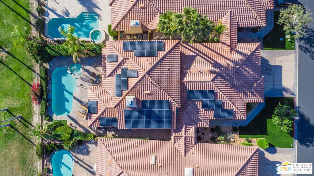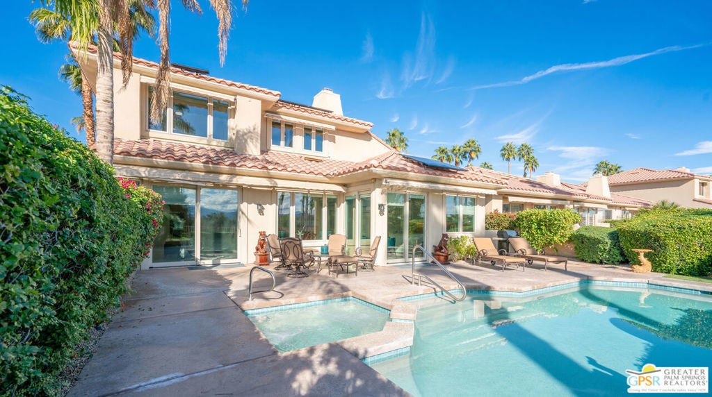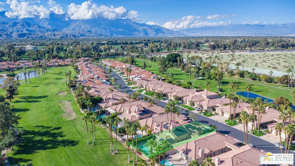 72 Kavenish. Located within Rancho Mirage Country Club, this rare four-bedroom residence offers a balanced combination of space, thoughtful updates, and modern systems within a meticulously maintained gated community. The home has been updated with a focus on efficiency and long-term comfort. A fully owned 47-panel Hyundai solar array, producing approximately 14.1 kW, supports lower energy costs, while two American Standard HVAC systems provide reliable climate control. Pella windows and doors enhance natural light and overall energy performance. The garage is air-conditioned via a Mitsubishi split system, adding flexibility for temperature-sensitive use, storage, or workspace needs. Interior spaces are clean and functional, featuring updated lighting and fixtures, refreshed railings, vaulted ceilings, and a redesigned fireplace in the main living area. The den includes a surround sound system, and the kitchen cabinetry has been professionally resurfaced, offering a refreshed, modern look. The home is hardwired for a security system, allowing owner-selected monitoring. Outdoor features include a newly resurfaced pool supported by a Pentair high-efficiency smart pool pump, designed for dependable, low-maintenance operation. Power-operated retractable awnings provide added sun control and usability of the outdoor living areas. Additional improvements include a point-of-use reverse osmosis system, full-house water conditioning, a LiftMaster garage system, a renovated downstairs bathroom, and new carpeting on the staircase. Located within an established country club community, the property offers controlled access, maintained grounds, and proximity to golf and club amenities, supported by a $950 monthly HOA. This home presents a well-rounded opportunity for buyers seeking a four-bedroom residence with modern systems and thoughtful upgrades in a private, resort-style setting. Easy to show.
