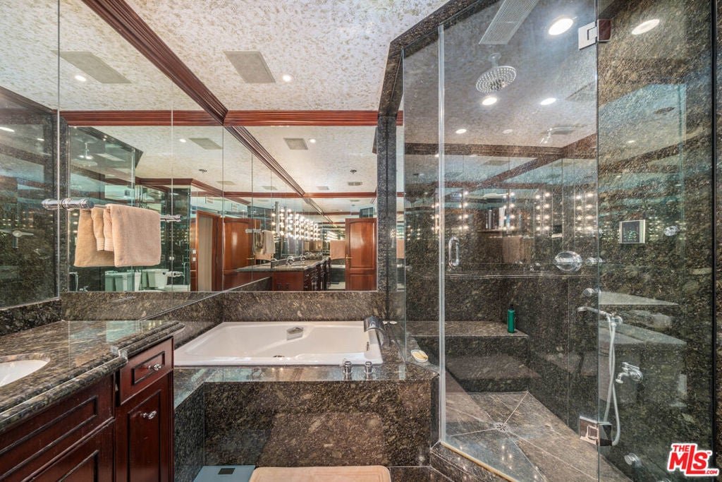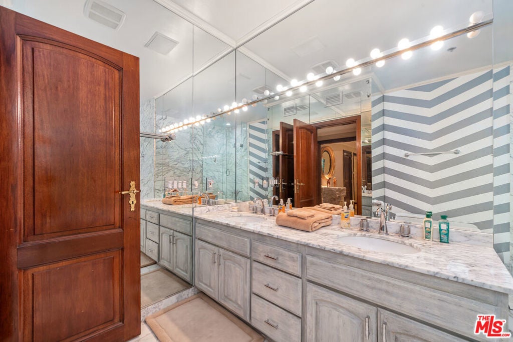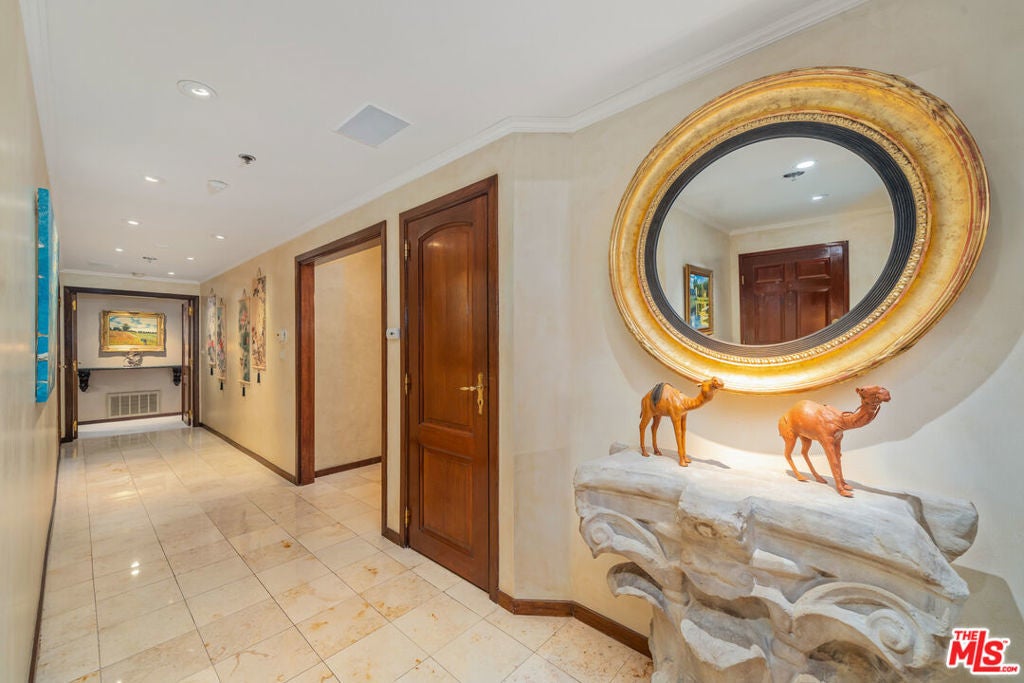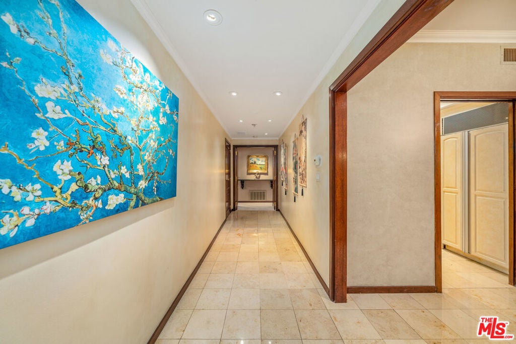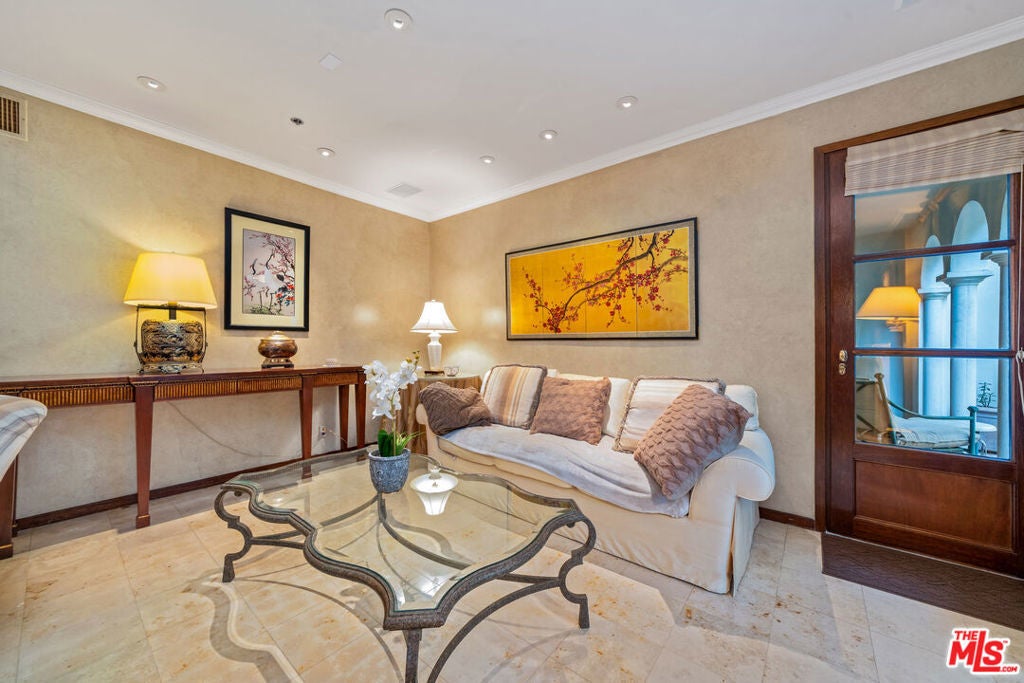 An inviting foyer sets the tone for this quiet Beverly Hills residence. The unit feels warm and comfortable from the moment you enter, carrying the atmosphere of a boutique five-star hotel with its calm, elegant flow. The foyer leads into a spacious living room with a fireplace and French doors that open to two large private terraces, creating a natural harmony between indoor and outdoor spaces for relaxing or entertaining. Surround sound enhances the ambiance, lifting the experience of every room. Adjacent to the living area is a generous kitchen with ample counter space and storage. The layout offers two true primary bedrooms positioned on opposite sides for privacy. Each suite includes a marble bath and an oversized cedar walk-in closet. Both bedrooms open to the outdoor spaces, and the main suite features a steam shower. Building amenities include a weekday concierge, a well-equipped gym, robust security, a large private storage unit, two side-by-side parking spaces, and plenty of guest parking. The interior is lovingly maintained and move-in ready, yet its thoughtful layout offers the perfect canvas for future personalized updates if desired. The location next to the well-known L'Ermitage Hotel adds to the convenience. Ideally located moments from Beverly Hills world-class shopping, dining, and lifestyle amenities. Offered fully furnished!