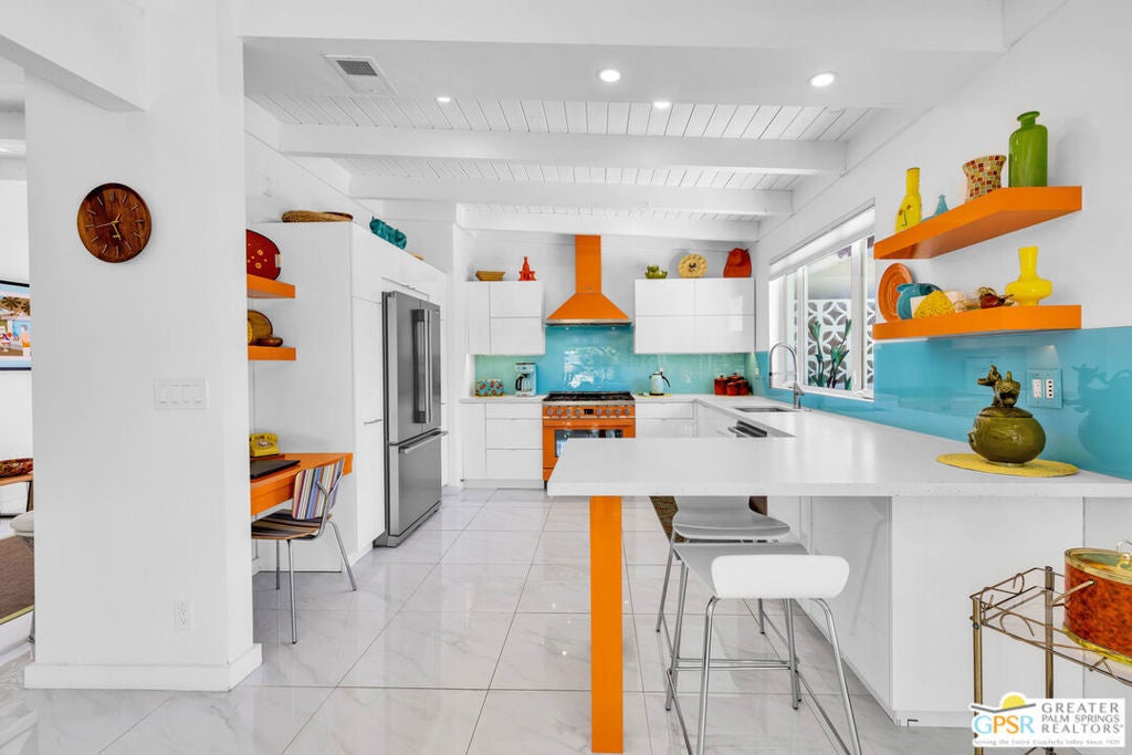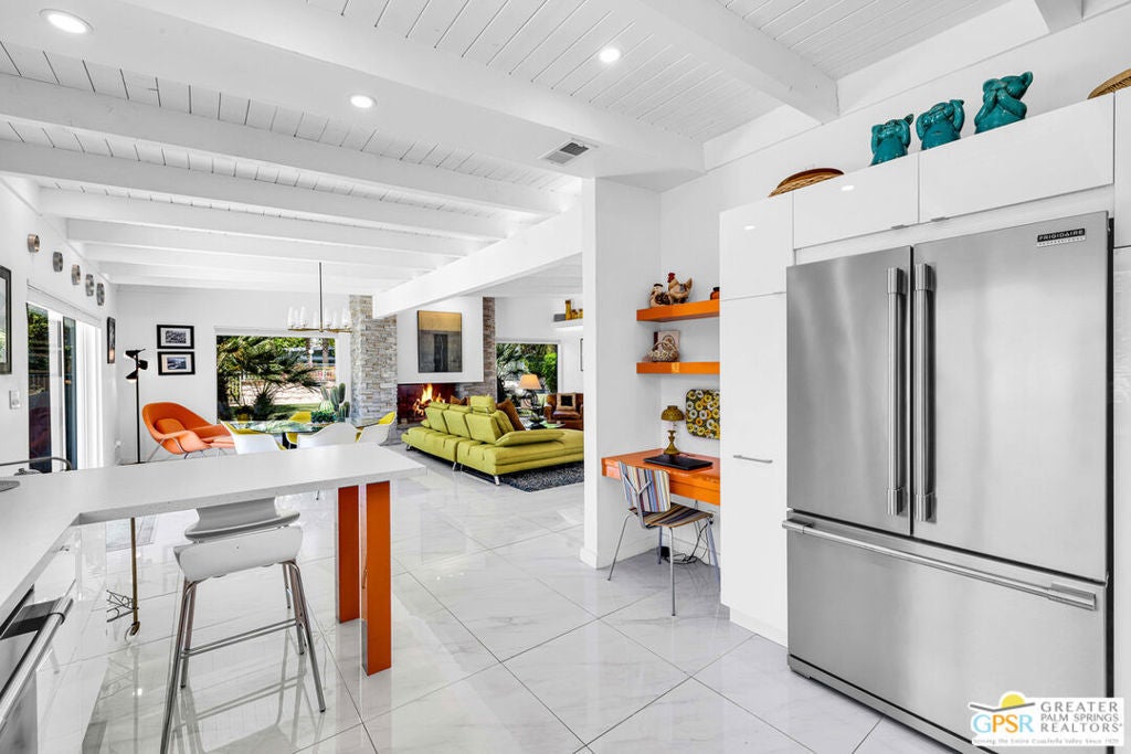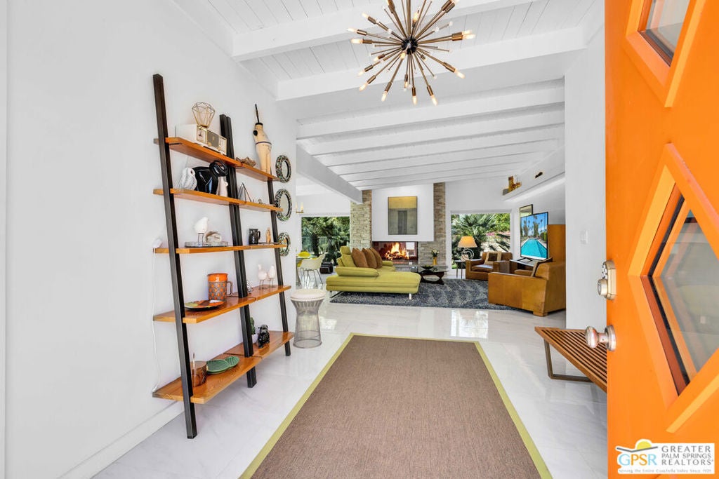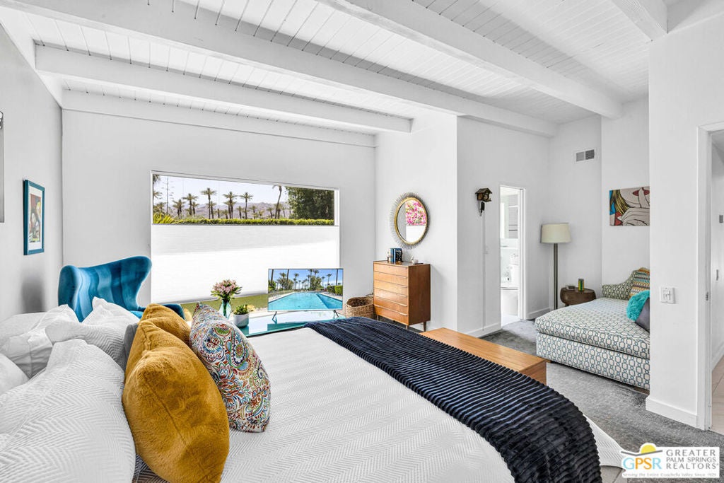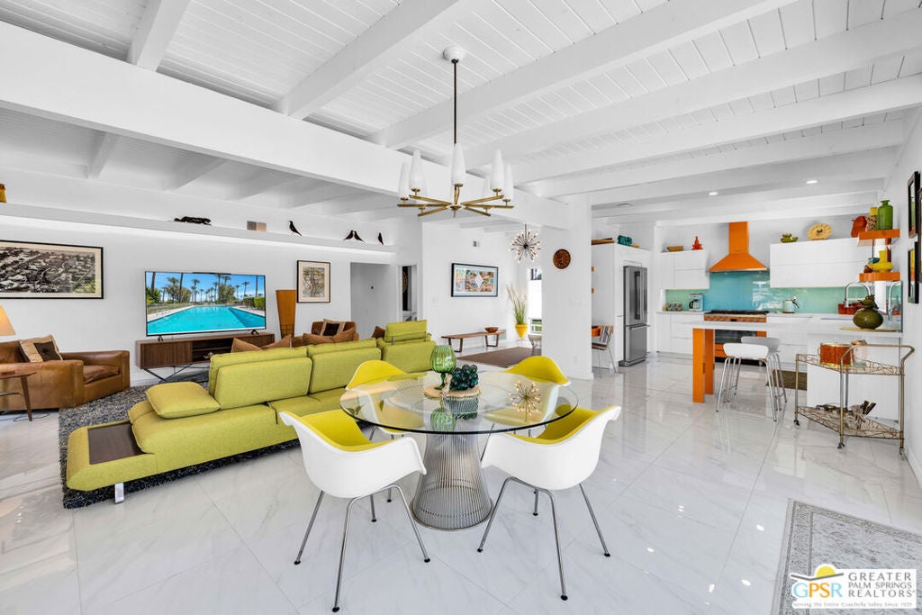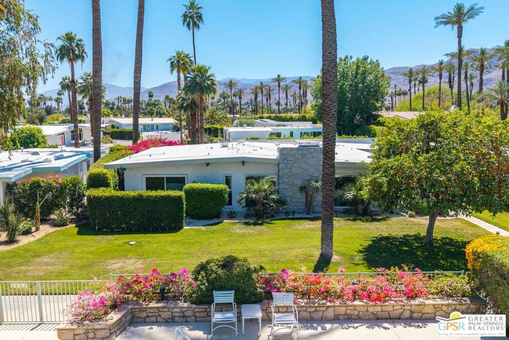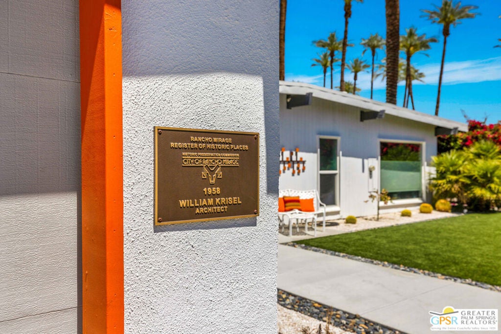 Rare opportunity to own your own piece of history. This meticulously restored 1958 iconic architectural home, designed by William Krisel, offers the perfect blend of Mid Century history coupled with modern elegance. The large open great room features a grand classic fireplace. The vibrant gourmet kitchen offers high end chef's appliances as well as large peninsula seating and a stylish work nook, all open and flowing to the dining area. This home is filled with natural light through the large windows all around. Additionally, there are two large primary suites, both en suite with full baths. The powder room off the great room is a wonderful addition for parties and get togethers. Hang out on the gorgeous patio outdoor living area, surrounded by lush landscape and citrus trees, ideal for evening outdoor dining. The front yard is privately secluded with its own hedge, landscaped with plush astro turf, perfectly inviting for hanging out with family, friends and pets. A two car garage included to house pool toys, bikes, and your dream sports car. Tamarisk Ranchos 1958 by William Krisel is a resort-style community featuring 16 homes around the central pool area, with illustrious views of the San Jacinto mountains. This architectural historical home has been prominently featured on the Palm Springs Modernism Tour, and also carries it's own historical designation, allowing the owner to benefit from the Mills Act. Nestled in Rancho Mirage, the Playground of the Presidents, on Fee land (you own the land), within close proximity to world class shopping, dining, golf, hiking and culture