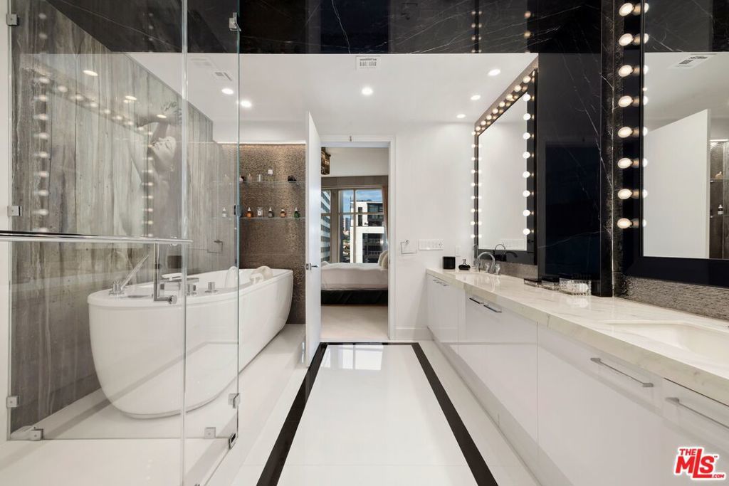 Residence 403 at The Carlyle offers a rare blend of privacy, design, and full-service luxury living within one of Los Angeles' most iconic buildings. Completely remodeled and offered fully furnished with custom pieces from Roche Bobois and Visionnaire, this residence is accessed by a private elevator foyer that opens directly into expansive living and dining spaces with nearly eleven-foot ceilings, rich wood flooring, custom built-ins, and a striking onyx fireplace. The chef's kitchen features Sub-Zero and Miele appliances, a dedicated espresso station, and a Snaidero design highlighted by a dramatic Panda marble waterfall island. The primary suite is designed as a private retreat with an oversized custom walk-in closet and a spa-inspired bath showcasing an Unbescheiden soaking tub imported from Germany, sculptural stone surfaces, TOTO toilets, and Swarovski crystal fixtures. Additional highlights include a private salon and wellness suite with infrared and traditional saunas, advanced European spa technologies, and a fully soundproofed professional recording and production studio. The residence is equipped with a fully integrated smart home system, surround sound, and security. Building amenities include 24-hour concierge and valet, a residents' lounge by Fendi Casa, a fitness center with Pilates reformer, a temperature-controlled wine cellar with private lockers and dining room, a landscaped outdoor terrace with pool and spa, and dedicated on-site staff. Ideally located along the Wilshire Corridor near UCLA, Beverly Hills, Bel Air, and Santa Monica.