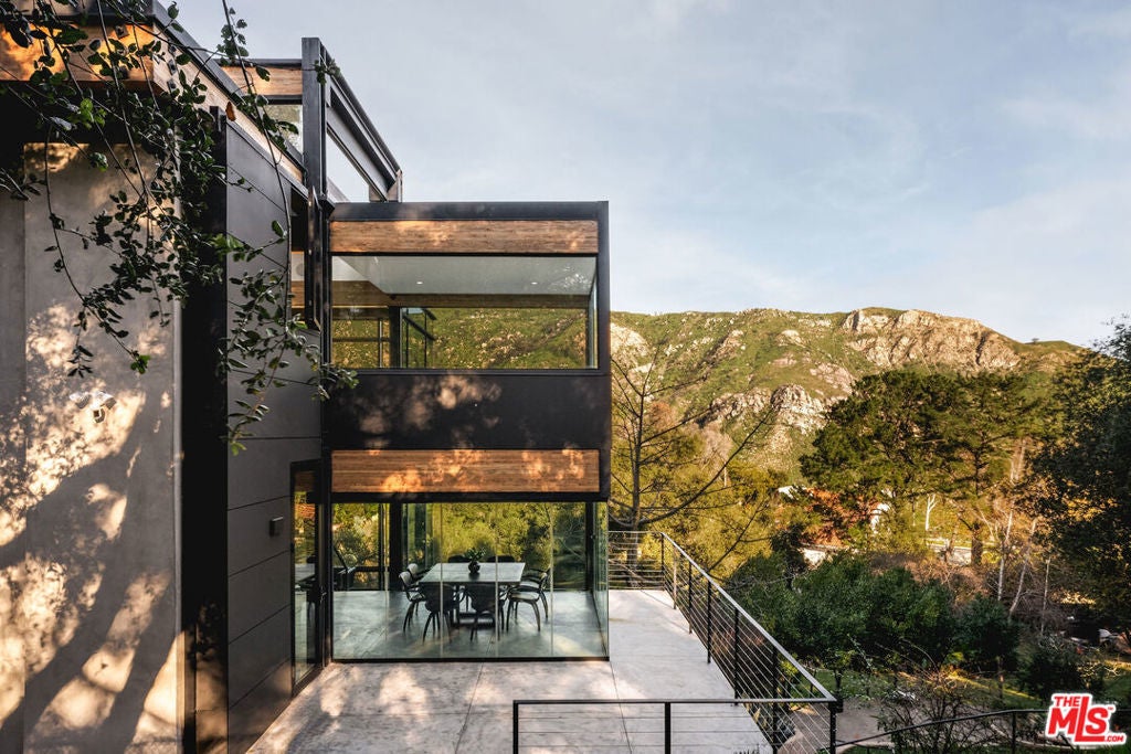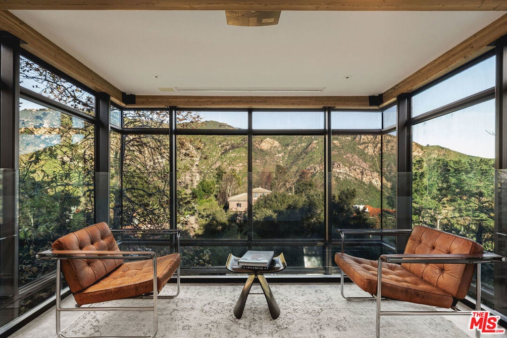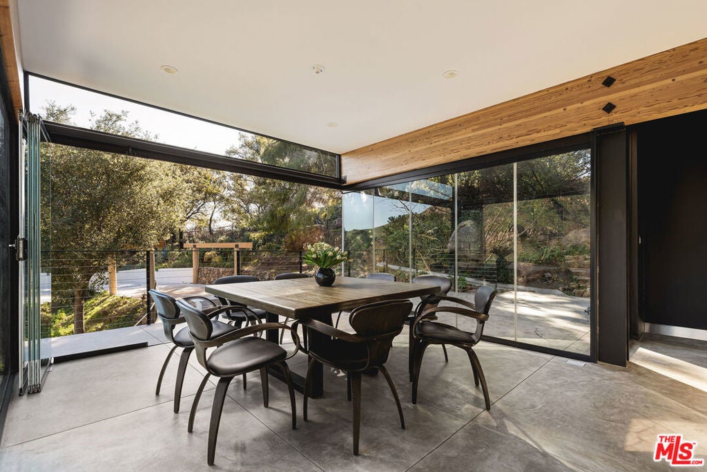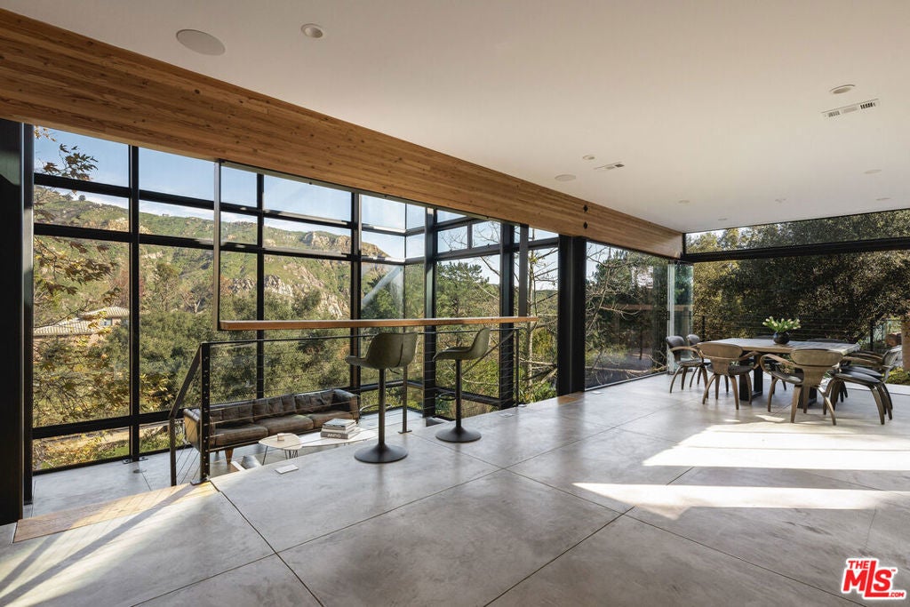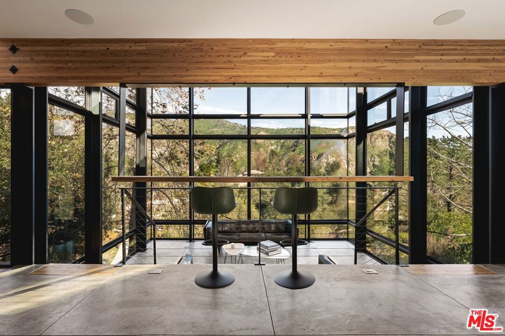 A striking expression of Southern California modernism, 2315 Live Oak Meadows Road is a rare architectural residence designed by Finn Kappe, set on an acre in the secluded hills of eastern Malibu. Framed by mature oaks and canyon terrain, the glass-wrapped home offers an exceptional sense of privacy, light, and connection to nature-while remaining remarkably accessible, just a six-minute drive down Las Flores Canyon to PCH, Malibu's beaches, and the area's most sought-after dining and lifestyle destinations. Walls of glass, dramatic volumes, and layered indoor-outdoor spaces define the home's architecture. Natural light moves throughout the residence, capturing canyon and hillside views and reinforcing a seamless dialogue between the interior and its natural surroundings. Multiple terraces, decks, and outdoor living areas extend the home into the landscape, creating an environment that feels both expansively open and deeply private. The residence is currently configured as two bedrooms and three bathrooms, arranged in an open, modern layout ideal for both everyday living and entertaining. The main living spaces are anchored by a custom Arclinea kitchen with bespoke Gaggenau appliances and a sculptural marble block island, opening directly to a custom deck and outdoor entertaining areas. Concrete floors with radiant heat, integrated lighting, and immersive audio-visual systems support a refined yet relaxed living experience. The home underwent a comprehensive down-to-the-studs renovation in 2018, preserving its architectural integrity while integrating modern systems and curated finishes. Improvements include commercial-grade glazing throughout, a new roof, new electrical and plumbing systems, all-new septic plumbing, re-imagined bathrooms with custom slab and tile work, custom interior and exterior railings, an oversized pivot entry door, a full Lutron lighting system, a dedicated home theater, embedded speakers, and dual-zone HVAC. All interior and exterior wood surfaces were professionally sanded and re-stained. The fully fenced acre features a gated drive, landscaped grounds, and a collection of mature trees and plantings that reinforce the home's peaceful, retreat-like setting. The property also offers potential opportunities for a future swimming pool and for conversion of the existing carport into a garage or possible guest house (buyer to verify). Tucked away in a quiet hillside enclave yet moments from Carbon Beach, Nobu, Soho House, and central Malibu, 2315 Live Oak Meadows Road presents a rare opportunity to own a true architectural residence where design, landscape, and location converge.