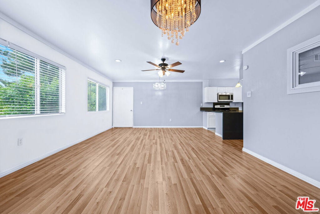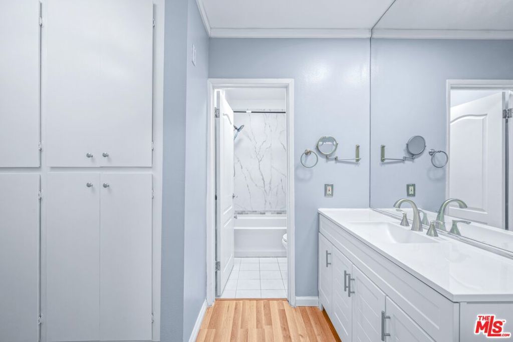 Welcome to this beautifully updated top-floor 2-bedroom, 1-bath condo in the heart of Studio City, offering privacy, treetop views, and a peaceful retreat with a private balcony to enjoy morning coffee or evening downtime. The modern kitchen features contemporary cabinetry, quartz countertops, and stainless steel appliances, opening to a bright living area highlighted by recessed lighting and a statement chandelier. The primary bedroom includes newly installed recessed lighting, a ceiling fan, and a spacious walk-in closet, while the second bedroom offers its own closet and a flexible layout ideal for guests or a home office. New vinyl plank flooring throughout adds a clean, modern look while minimizing noise, and the upgraded bathroom showcases a new bathtub, ceramic tile, modern vanity, and stylish fixtures. Additional highlights include a newer HVAC system, added hallway cabinetry, and thoughtful storage upgrades. Community amenities include a heated pool, sauna, two assigned parking spaces, secure access, and laundry facilities on every floor. Ideally located near Ventura Boulevard, The Shops at Sportsmen's Lodge, Ralphs, Whole Foods, Fryman Canyon, and with easy access to the Westside, this move-in-ready condo delivers stylish, convenient Studio City living.