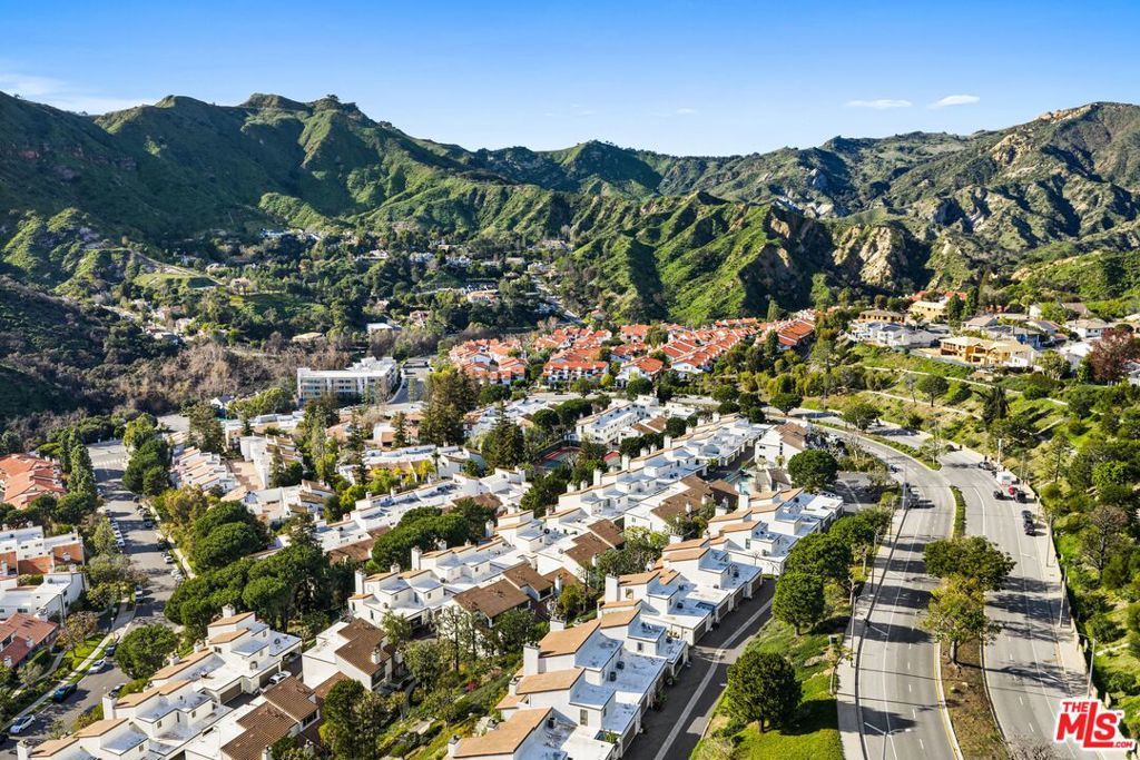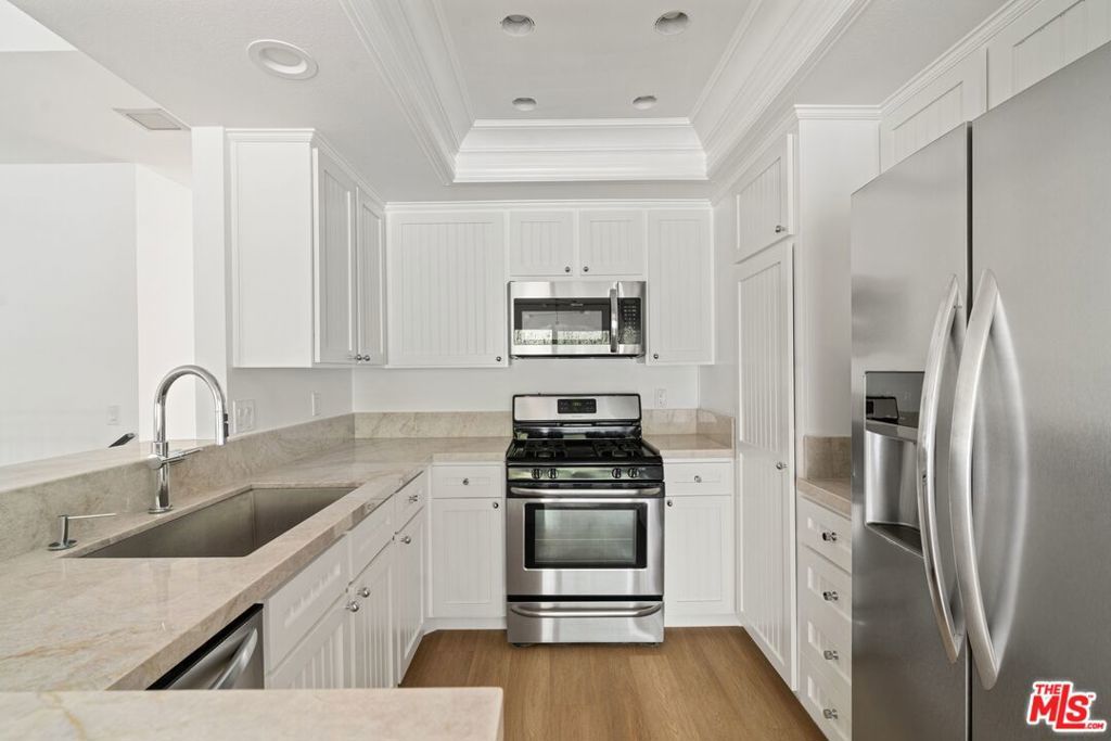 Set within a sought-after Palisades community, this light-filled residence showcases a clean, modern aesthetic with soaring ceilings, warm wood floors, and a thoughtfully open layout designed for effortless living. The home offers 2 bedrooms and 2 bathrooms, all on the main level, with an airy living space defined by architectural volume and abundant natural light. The entry opens into a spacious living and dining area anchored by a charming fireplace and enhanced by high ceilings and modern lighting. The kitchen sits just off the main living space and features stone countertops, ample cabinetry, and stainless steel appliances open enough for connection while remaining subtly set apart for everyday functionality. Both bedrooms are located on the main level, offering comfort and convenience. The primary suite serves as a private retreat with generous proportions, elevated ceilings, and an en-suite bath designed for comfort and ease. A second bedroom and full bathroom provide ideal space for guests, a home office, or flexible use. Additional highlights include direct-access garage parking, in-home laundry, and access to resort-style amenities, including a pool, spa, fitness center, and tennis courts. Ideally located moments from Palisades Village, scenic hiking trails, the beach, and award-winning schools, this home offers relaxed coastal living in one of Pacific Palisades' most desirable settings. Photos with furniture are virtually staged.