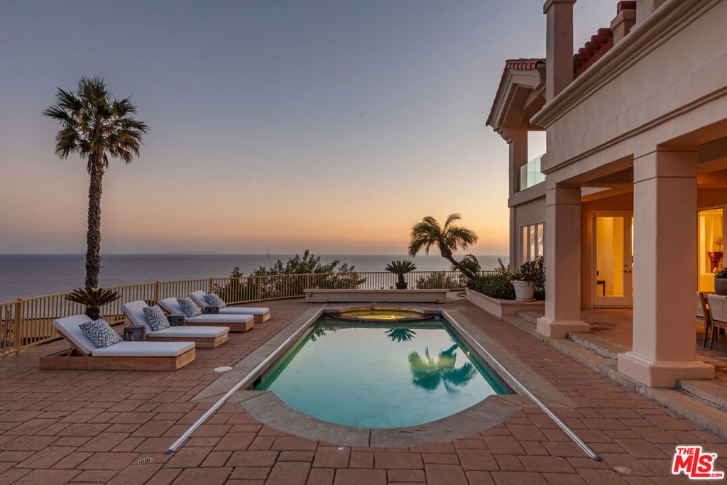 This exquisite Mediterranean-contemporary residence in one of Malibu's most prestigious, celebrity-favored gated communities commands sweeping panoramic ocean, dramatic coastline, and crashing whitewater views from nearly every room. A grand two-story foyer with palatial spiral staircase opens to a formal dining room, fireplace-warmed living room with sit-down bar, cozy family room, and a spacious island kitchen with junior dining area all flowing seamlessly to expansive patios and decks that embrace the breathtaking vistas. Highlights include an ocean-view living room with grand piano nook, a large ocean-view office opening to a private deck over the water, a versatile first-floor bedroom/gym with bath and patio access, and an upstairs primary suite retreat featuring a sitting area, expansive shaded terrace, dual spa-like bathrooms, and generous his-and-hers closets, plus three additional en-suite bedrooms each with jaw-dropping views. Outdoors, a covered entertainment patio with built-in BBQ adjoins a sparkling pool overlooking the endless blue, complemented by a three-car garage, motor court all just minutes from the Country Mart, Nobu, and the exclusive Little Beach House for the ultimate in private, luxurious coastal living.