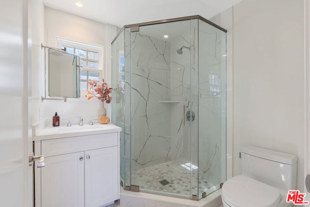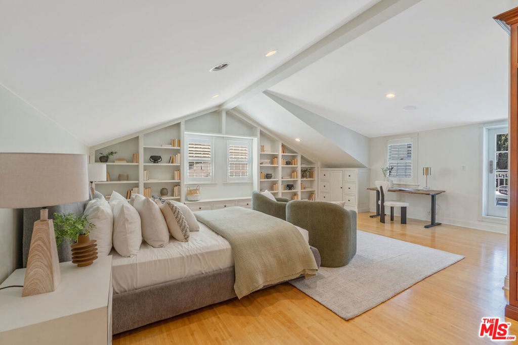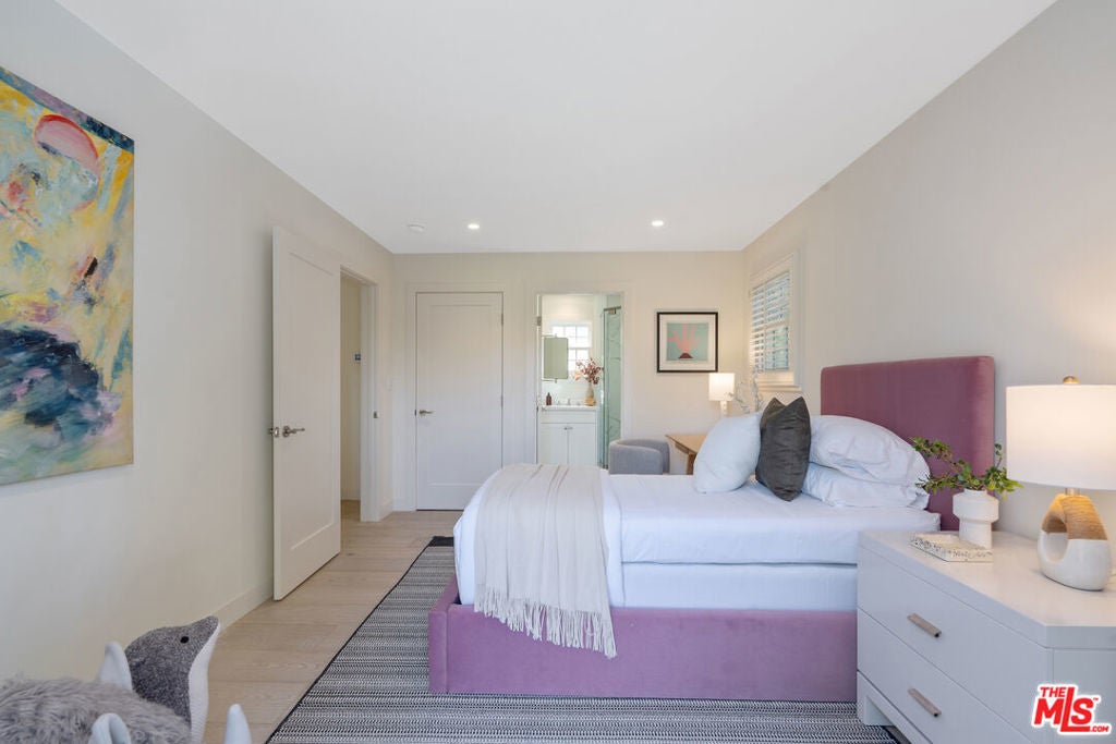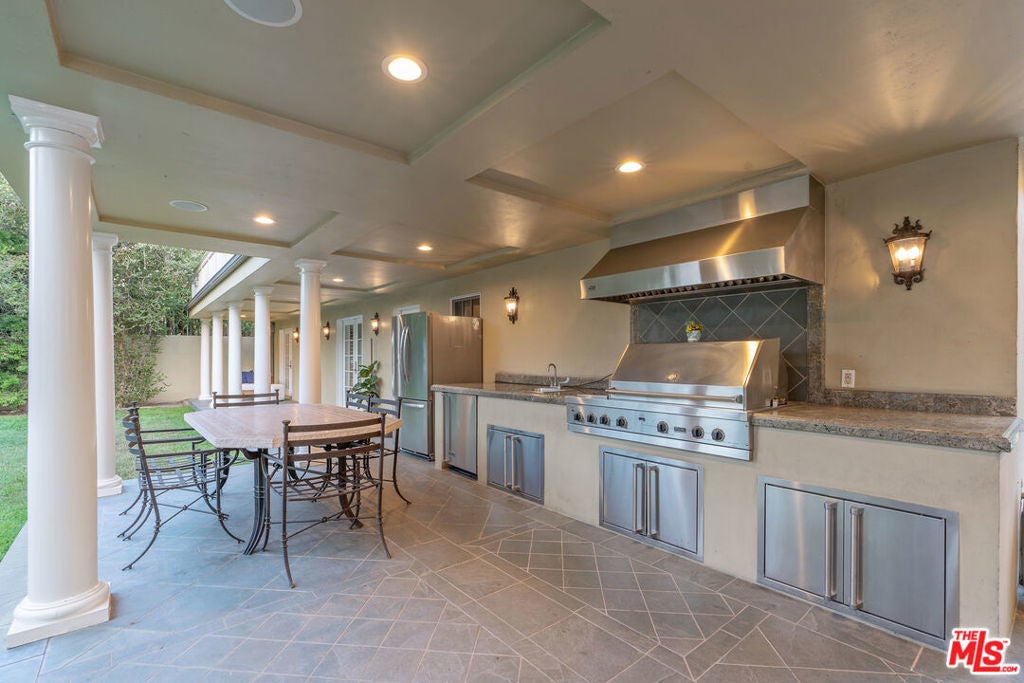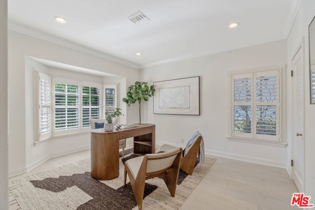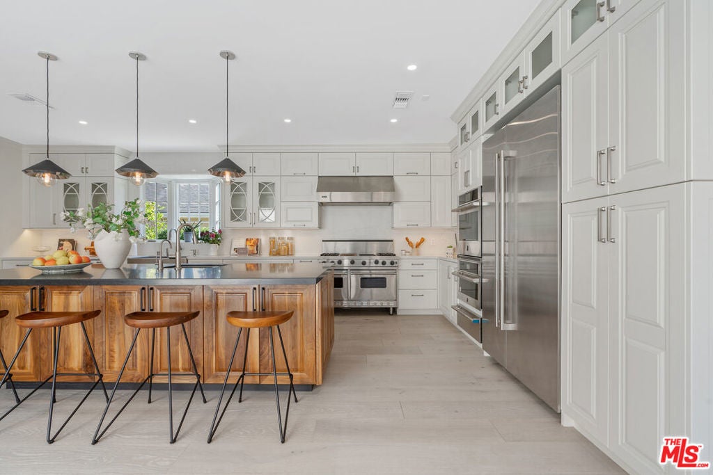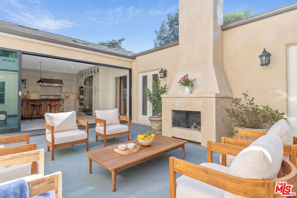 Graciously set back from the street, lies this classic Windsor Square traditional. The refined yet contemporary interior has been extensively remodeled. The home features wide plank wood floors and recessed lighting throughout. Large formal dining and living room with French doors leads to a cozy interior courtyard with fireplace. The heart of the home features an expansive great room with true chef's kitchen with double wide Viking Range, three ovens, two sinks, large island and two wine fridges. The adjoining family room has custom built-ins with access to the large grassy backyard. The first floor features two en-suite bedrooms, including a secondary primary, with spa-like bathroom with steam shower, soaking tub, red light sauna and large walk-in closet. The second floor has three large ensuite bedrooms, including the primary with walk-in closet and private balcony. The resort like backyard has a covered loggia ideal for alfresco dining, with built-in BBQ, and outdoor kitchen. Grassy backyard with room for a pool. Detached guest suite/office with ensuite bathroom and separate ADU with kitchen. Electric gated driveway with two-car garage + ample off-street parking. Home features a LifeSource water system and smart home security. Minutes to Larchmont Village and all the city has to offer. Would make a wonderful place to call home!