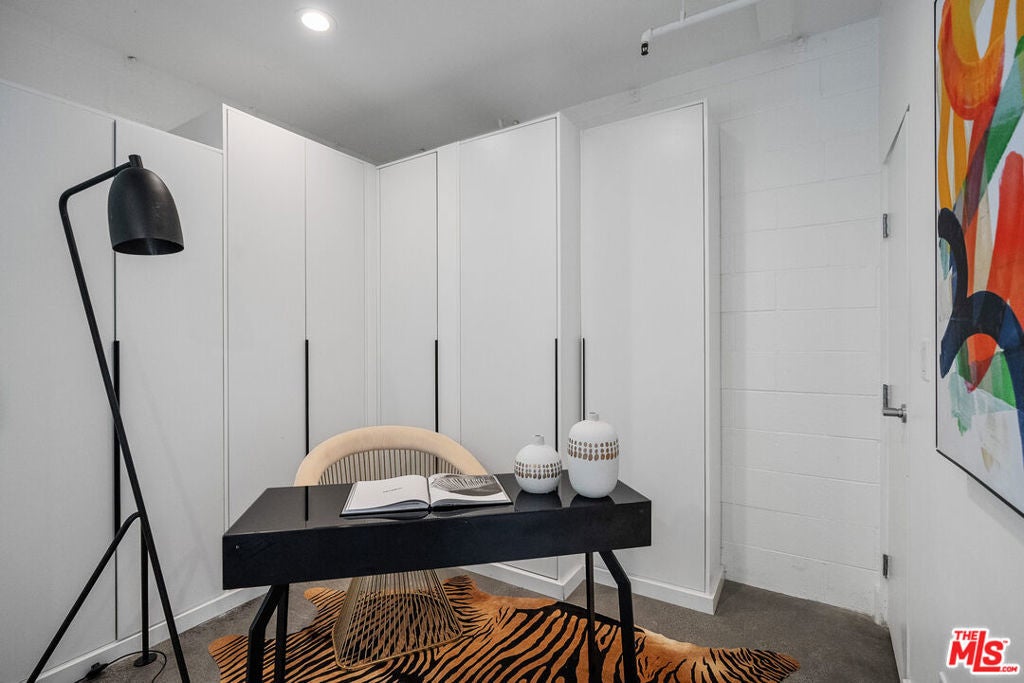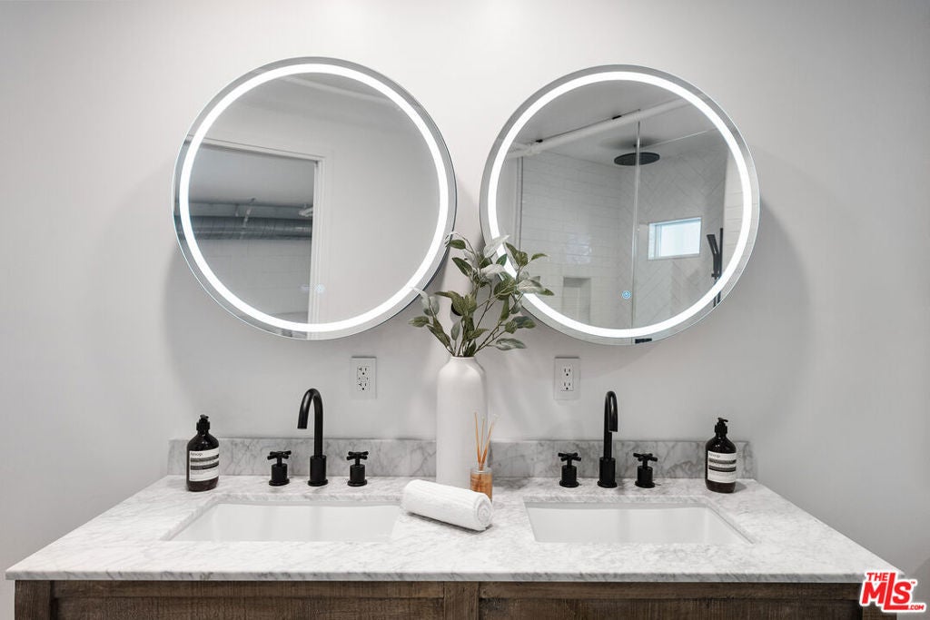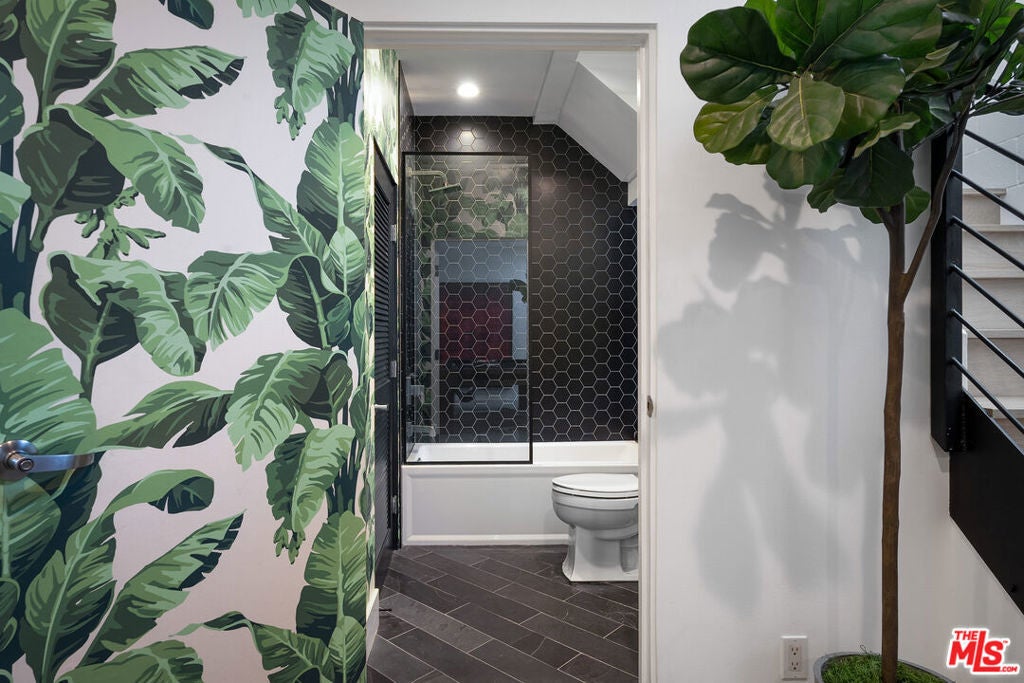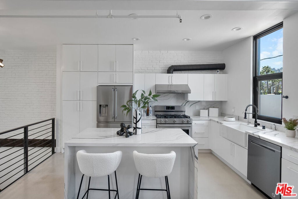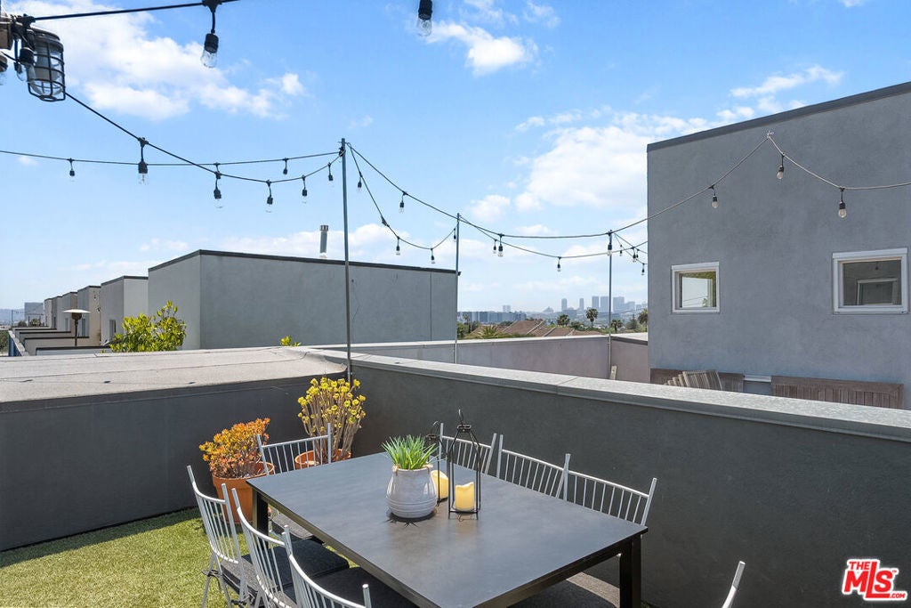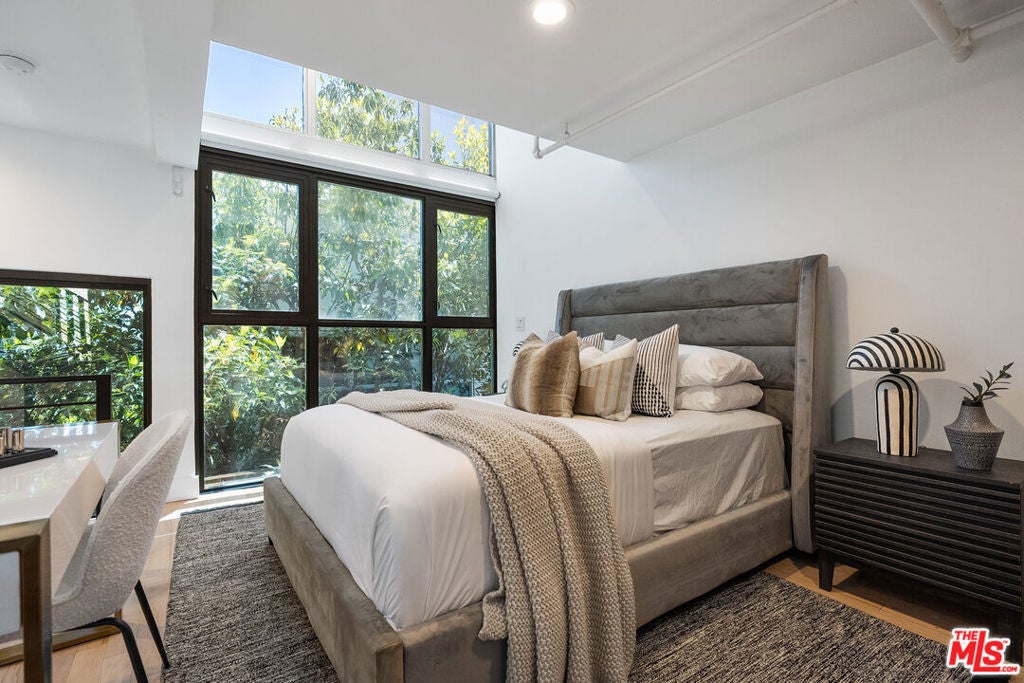 Live above it all in this impeccably designed penthouse condo that lives like a townhouse, nestled in the heart of West Hollywood. Offering over 2,100 sq. ft. of thoughtfully curated living space, this three-bedroom, three-bath residence features soaring ceilings, a striking blend of micro cement and wood floors, and elevated finishes throughout. One of the bedrooms on the first level has been converted into a custom walk-in closet but can easily be transformed back, offering flexible use of space to suit your lifestyle. The bright white kitchen is outfitted with newer appliances and opens into an airy living and dining area that flows effortlessly for entertaining or unwinding in style. Step outside to your private outdoor patio with a hot tub and outdoor shower, or ascend to the expansive rooftop deck to enjoy sweeping views from the Hollywood Hills to downtown Los Angeles. Additional highlights include rare guest parking, extra storage, and an unbeatable location near some of the city's most iconic restaurants, nightlife, and entertainment.