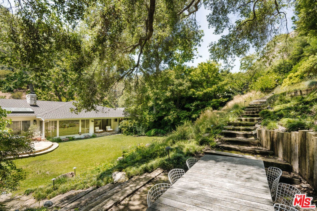 Peacefully secluded behind a citrus grove and gated drive, this impeccable newly renovated, single-story estate sits on almost 3/4 an acre of lush landscaped grounds, offering updated luxury design and effortless California living in the heart of Mandeville Canyon. A soaring skylit foyer flanked by an organic stone wall, welcomes you into the home, opening into a sophisticated formal living room with a custom marble fireplace and floor-to-ceiling windows looking out onto the expansive backyard and hillside planted with a meadow of California wildflowers. A warm and stylish adjacent family room features a stone fireplace, white washed paneled walls, a ceiling of skylights and large windows overlooking the grounds, which blur the line between indoors and out. The stunning Calacatta marble gourmet kitchen, with a seated chef's counter, opens to a bright breakfast area and is appointed with top-of-the-line Wolf and Sub-Zero appliances and Waterworks fixtures, as well as custom open shelving and a generous center island. The chic formal dining room with sculptural lighting offers lush front garden views and flows effortlessly into an intimate study/library with a third fireplace, alongside a versatile office/studio hidden behind a bookshelf door, which also has its own private entrance from the motor court.The generous primary suite overlooks the tranquil backyard and features a spa bathroom with Calacatta marble dual vanities and shower, a freestanding Waterworks tub, Waterworks fixtures, all accented by designer lighting. Two additional spacious bedrooms are situated in the this wing, sharing a beautifully appointed full bathroom with high-end finishes. The home is further complemented by an additional guest bedroom with a private bath in another wing, near to a laundry room, Waterworks powder room, and a spacious two-car garage. The property has several outdoor living spaces including a large patio, a landing under a towering live oak tree and redwoods which can be used for dining or as an outdoor lounge area, as well as paths along the hill leading to another private spot for mediation or morning coffee. The large flat yard in front of the hillside has plenty of room should you want to expand or add a pool. Renovated in 2024, additional upgrades include a comprehensive lighting redesign and update, custom motorized shades throughout, new interior and exterior paint, new and refinished wood floors, and a fully integrated top of the line audio system, just to name a few thoughtful details that bring to this classic Mandeville property to meet today's luxury standards. Renowned for its calm atmosphere and exclusivity, Mandeville Canyon draws those who desire privacy without compromising city conveniences. Just moments from the Brentwood Country Mart, fabulous dining, and top-rated schools,2610 Mandeville Canyon presents a truly rare opportunity to indulge in the pinnacle of Westside living. A must-see.