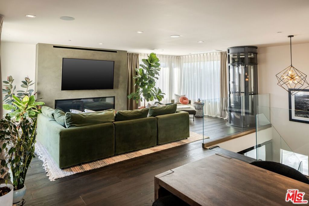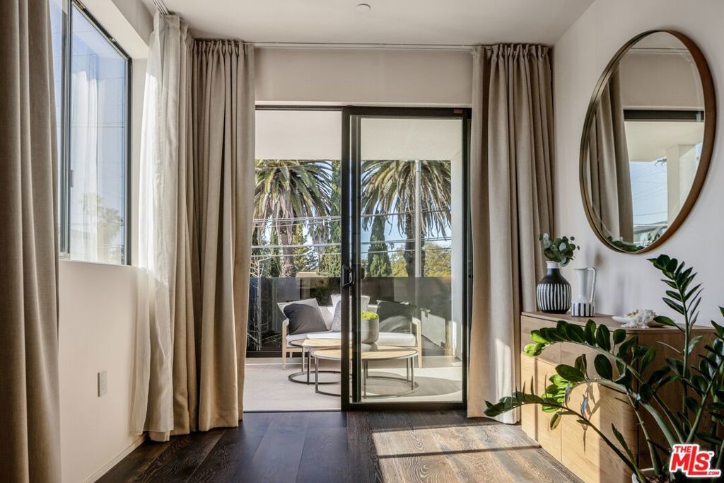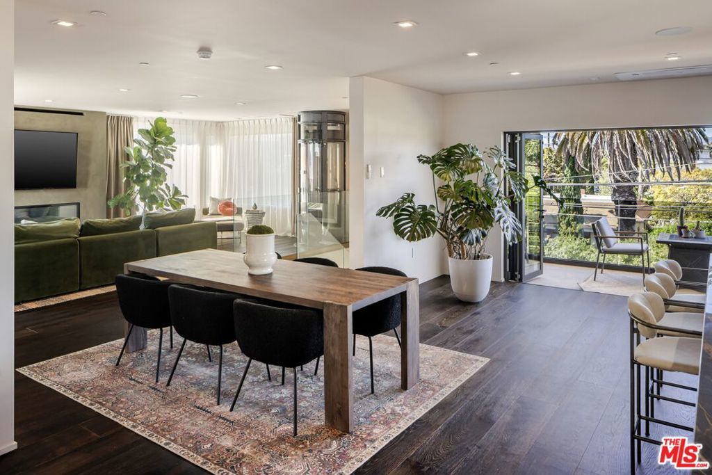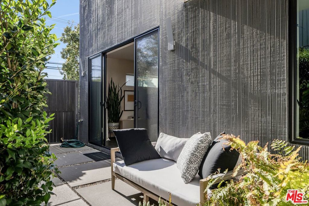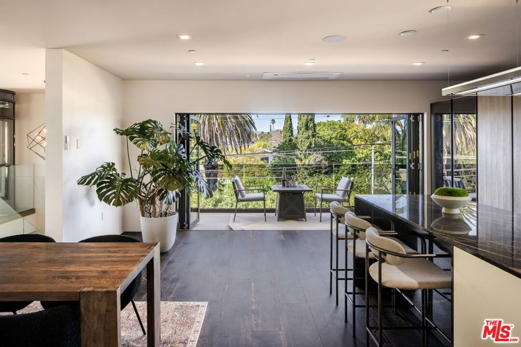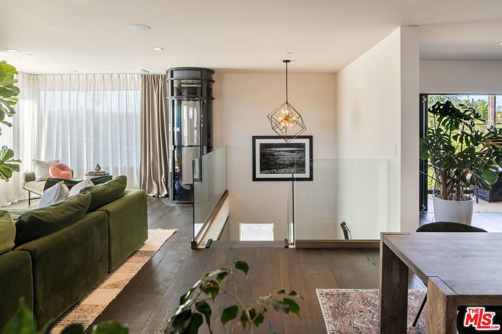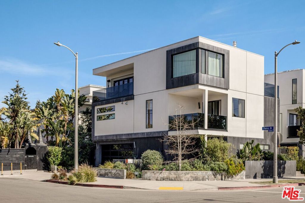 1208 Palms is designed for the way people want to live today, light-filled, open, and effortlessly connected to the outdoors. This contemporary architecture captures sweeping views of mountains and treetops while expansive windows bring sunlight into every corner. A striking floating staircase connects all three levels, complemented by a sleek capsule elevator that services each floor, combining sculptural design with everyday convenience. The top floor is the heart of the home, where the kitchen, dining, and living areas unfold in one expansive open space framed by walls of glass. The Italian-designed kitchen features Fisher & Paykel appliances, a Bosch dishwasher and microwave, custom shelving, a walk-in pantry, and a beautifully designed island made for gathering. Large sliding glass doors open to a generous outdoor deck, extending the living space into the fresh air. A built-in fireplace anchors the room, creating a warm focal point whether hosting friends or enjoying a quiet evening at home. Three of the four bedrooms are located on the second floor. The primary suite opens to a spacious private balcony and features a custom Italian-designed walk-in closet along with a spa-inspired bathroom with dual Italian vanities, a floating tub, and a porcelain shower. The additional bedrooms include custom Italian millwork closets and private en suite bathrooms, offering comfort and privacy for family or guests. On the first floor, the fourth bedroom offers flexibility as a guest suite, office, gym, or creative space. The entry level also includes a generous open area that flows directly to an outdoor patio, creating another inviting indoor-outdoor moment. The home is equipped with Savant Smart Home Automation with app-controlled lighting and AC, an integrated Sonos sound system, five Lorex security cameras, DoorBird entry, alarm system, prewired solar, and an installed EV charger. Custom California Closets are featured throughout, including the pantry. A two-car garage opens directly into the home. Ideally located at the corner of Palms and Penmar, you're just a short walk to neighborhood cafes and boutiques, with a new corner bodega opening across the street. Easy, elevated livingjust add your throws, candles, and bikes.