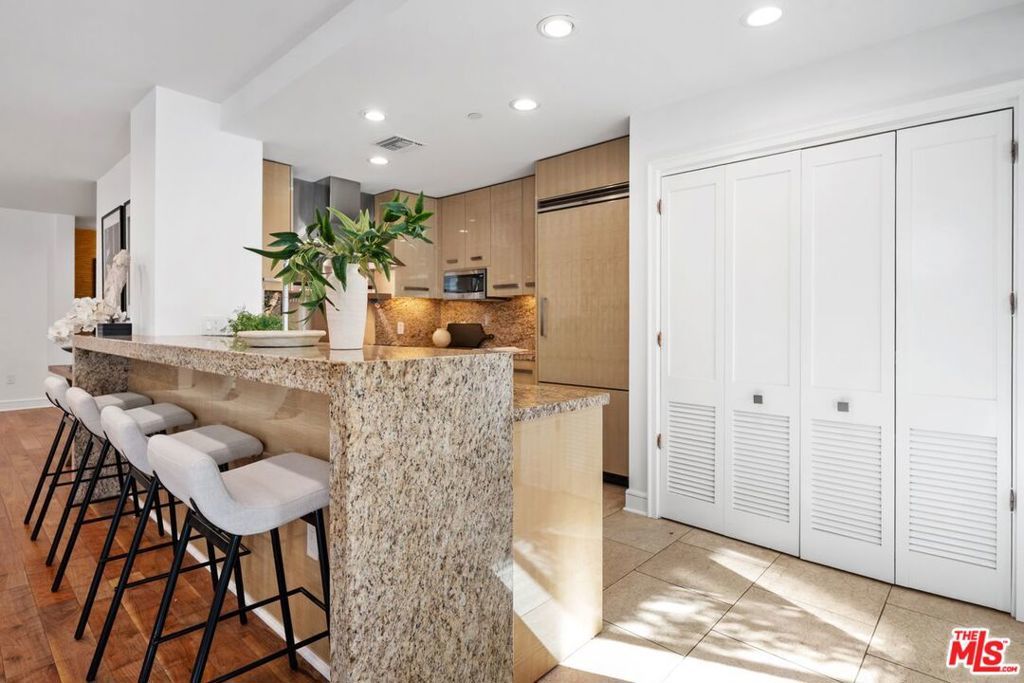 Welcome to La Terrasse, a refined contemporary luxury residence in the city of Beverly Hills, newly refreshed and professionally staged to reflect today's elevated, design-forward lifestyle. This sophisticated single-level condominium offers approximately 1,942 square feet of gracious living with two bedroom suites and 2.5 baths, blending timeless architecture with modern comfort and effortless flow. From the moment you enter, the residence feels expansive and serene. Warm brushed walnut hardwood floors, limestone accents, and clean architectural lines set a calm, gallery-like backdrop for the newly curated interiors. The open dining and living areas are designed for both everyday living and elegant entertaining, anchored by a dramatic limestone fireplace and framed by generous windows that fill the space with natural light.The open-concept layout flows seamlessly into the gourmet kitchen, featuring sleek Italian cabinetry, Viking stainless steel appliances, stone countertops, and a generous breakfast bar ideal for casual dining or hosting guests. An adjacent breakfast room or flex space works beautifully as a junior dining area, home office, or creative studio, perfectly aligned with today's work-from-home lifestyle. The primary bedroom suite is a true retreat, thoughtfully emphasizing comfort and scale. It offers direct access to the private terrace, and three custom walk-in closets, and a spa-inspired bath with dual marble vanities, soaking tub, and glass-enclosed shower. The guest suite is equally inviting and versatile, ideal for visitors, a den, nursery or a office. Residents of La Terrasse enjoy a collection of luxury amenities including a screening and lounge room with kitchen for events or parties, fitness center, conference space, sun deck, concierge form 7 AM to 12 AM, controlled access, secure subterranean parking with three parking spaces, & ample guest parking, and private storage. Built in 2009, this boutique building of only 20 residences is known for its privacy, understated elegance, and exceptional location. Ideally situated between Santa Monica Boulevard and Beverly Boulevard, La Terrasse places you moments from Rodeo Drive, Robertson Boulevard, world-class dining, luxury shopping, and West Hollywood nightlife, while maintaining a discreet residential feel. Freshly restaged and move-in ready, this residence offers a rare opportunity to experience modern Beverly Hills living at its finest sophisticated, comfortable, and impeccably presented for today's buyer.