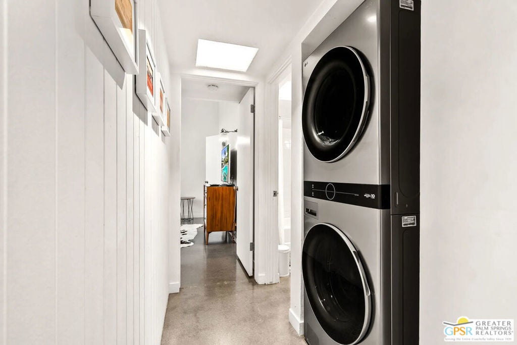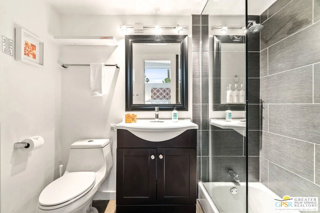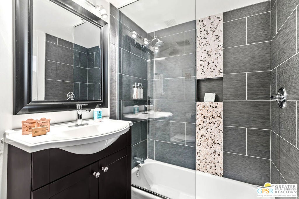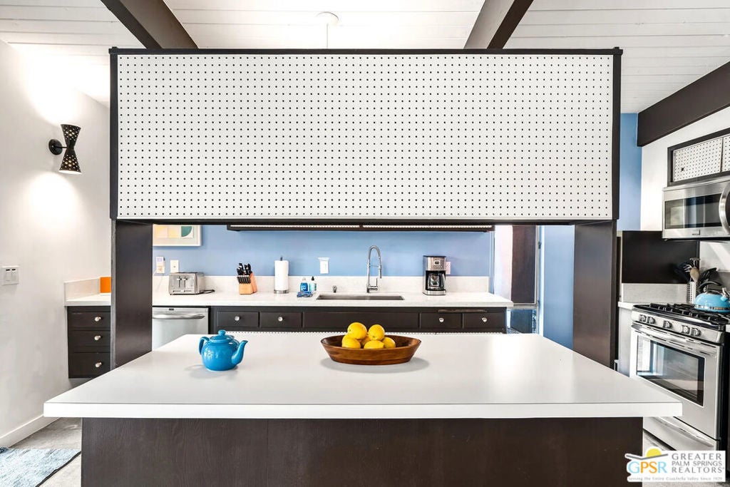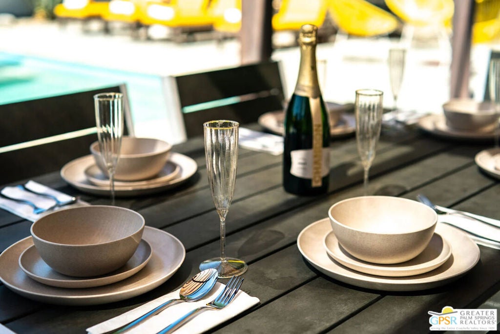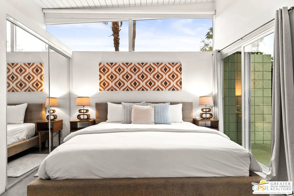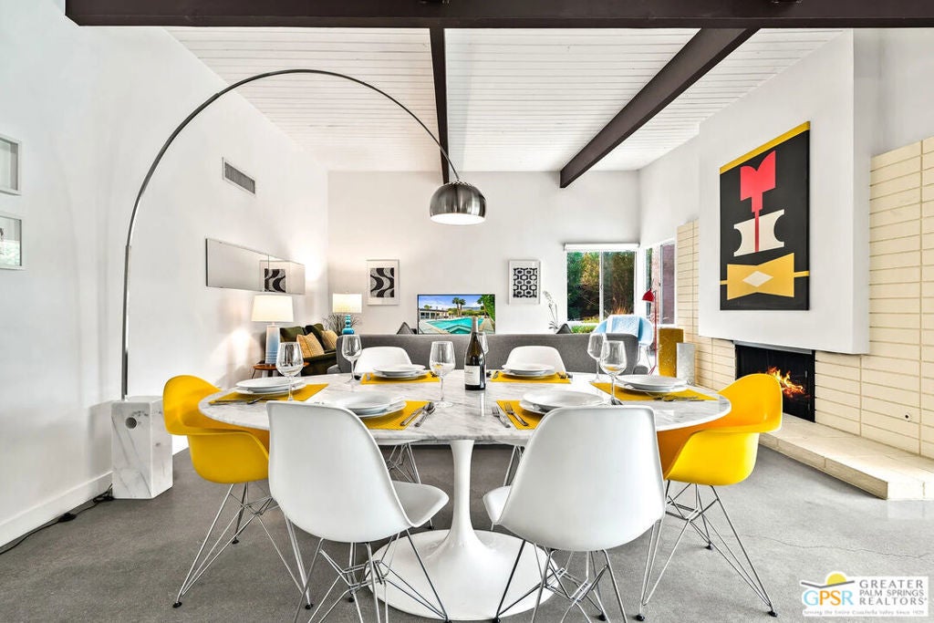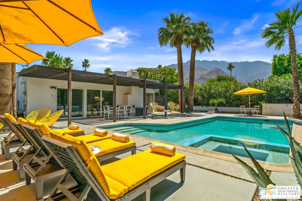 Long-term lease only. Looking for a Mid-century home yet not ready to buy? Elevate your lifestyle with this 1959 mid-century Palm Springs home, originally designed by renowned architect, William Krisel. The signature "butterfly" roof immediately sets the tone for true Palm Springs living at it's best! Blending vintage charm with modern convenience, the bright open floor plan features sleek concrete floors and mid-century modern decor. Lounge in the stylish living area, curl up by the fireplace, or enjoy a favorite film on the cozy sofa. The retro-chic kitchen embraces its authentic 1950s cabinetry, complemented by top-tier stainless steel appliances - whether you're crafting a gourmet meal or whipping up a midnight snack, you'll enjoy doing it in style. With three bedrooms, you'll have space for guest and/or a home office. The primary bedroom has an en-suite bathroom renovated with a shower over a tub and has direct access to the private yard. Both guest rooms enjoy clerestory windows, high ceilings and share the guest bathroom also with a shower-tub combo. Step into your private desert oasis, where sun-drenched relaxation meets stunning mountain views. Cool off in the expansive pool, unwind in the eight-person infinity spa, or soak up the rays on cushioned lounge chairs. Host an al fresco feast under the pergola-covered dining area while firing up the natural gas grill for effortless outdoor cooking. Nestled in Racquet Club Estates, a peaceful neighborhood just 1.5 miles from downtown, this home offers easy access to Palm Canyon Drive's buzzing restaurants, boutiques, and cultural hotspots. INCLUDED in RENT: Water, Trash, Landscaping and Pool Maintenance.