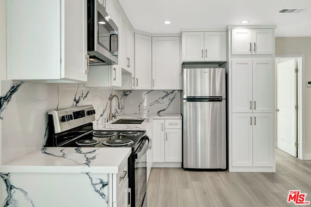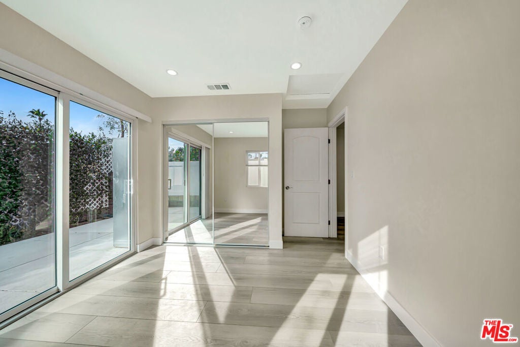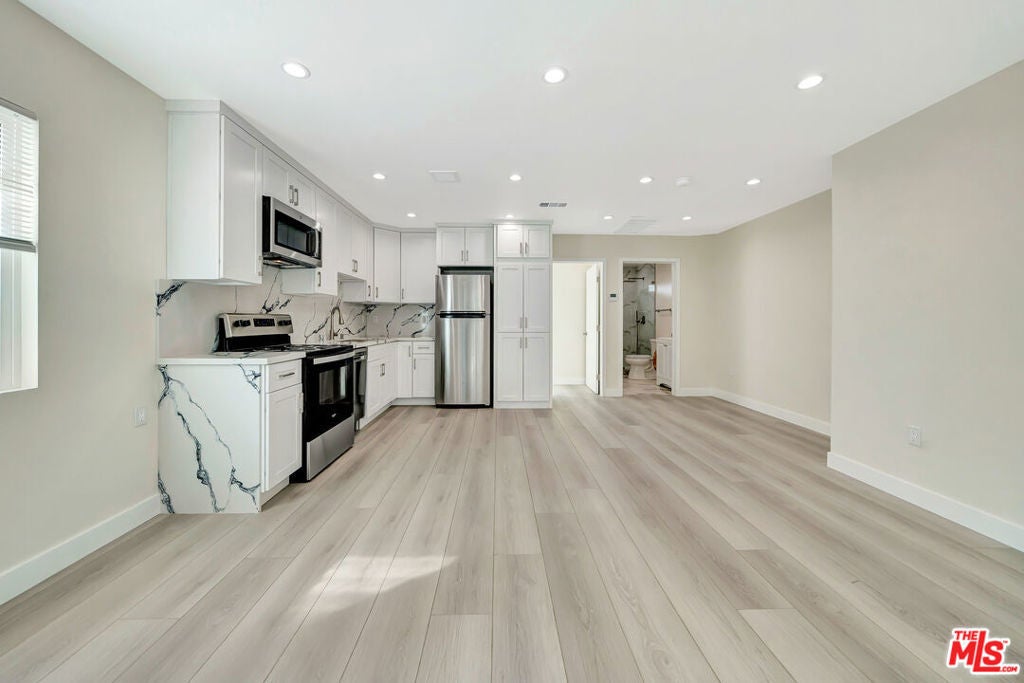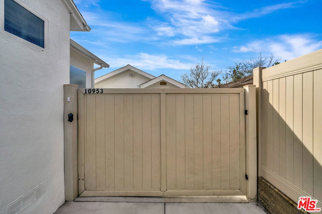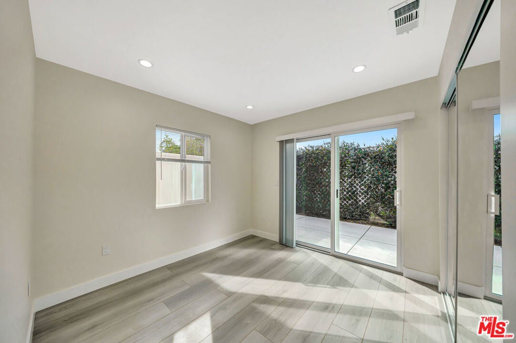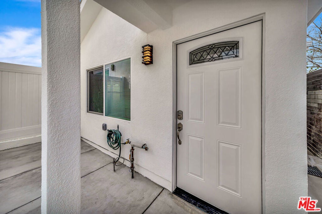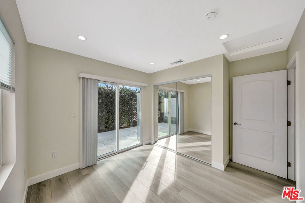 Stunning 1-bedroom, 1-bathroom detached unit in a highly desired neighborhood. With its own private entrance, gated access, and fully enclosed patio surrounded by mature hedges, the property offers excellent privacy and separation from the front residence. The interior features an open-plan layout with new luxury plank flooring, recessed LED lighting, and abundant natural light. The modern kitchen is equipped with white shaker cabinetry, quartz countertops with marble-inspired veining, and stainless steel appliances including a refrigerator, electric range/oven, built-in microwave, dishwasher and in unit washer/dryer. The bedroom includes mirrored sliding closet doors and direct access to the private patio through a glass slider. The full bathroom has been updated with a glass-enclosed walk-in shower, contemporary tile work, and a clean white vanity. Step outside into your own private outdoor space ideal for relaxation or entertaining. The home also comes with a 1-car parking spot and a 220V EV charging port.